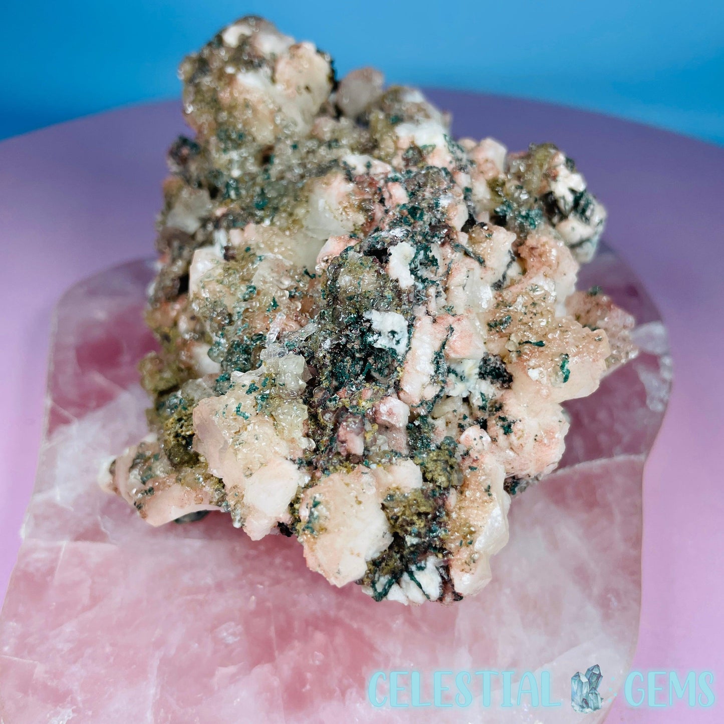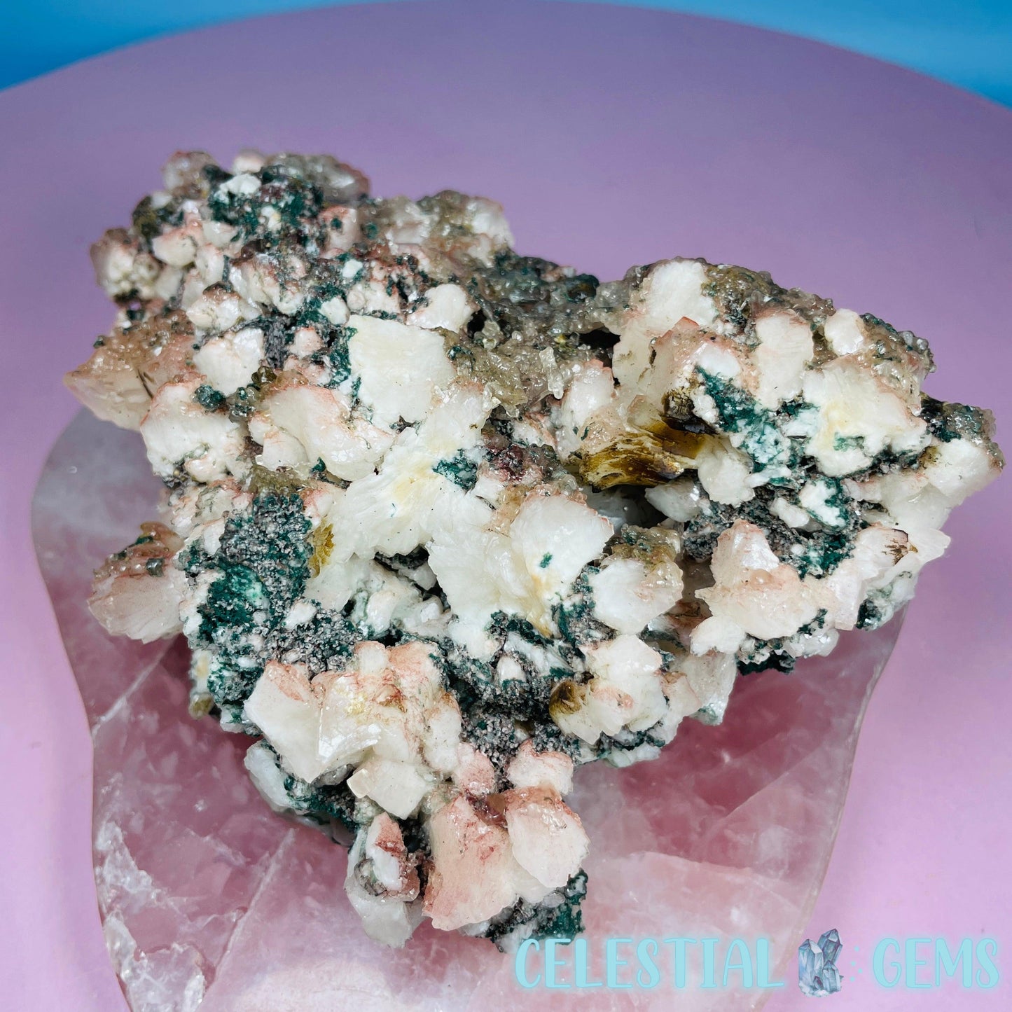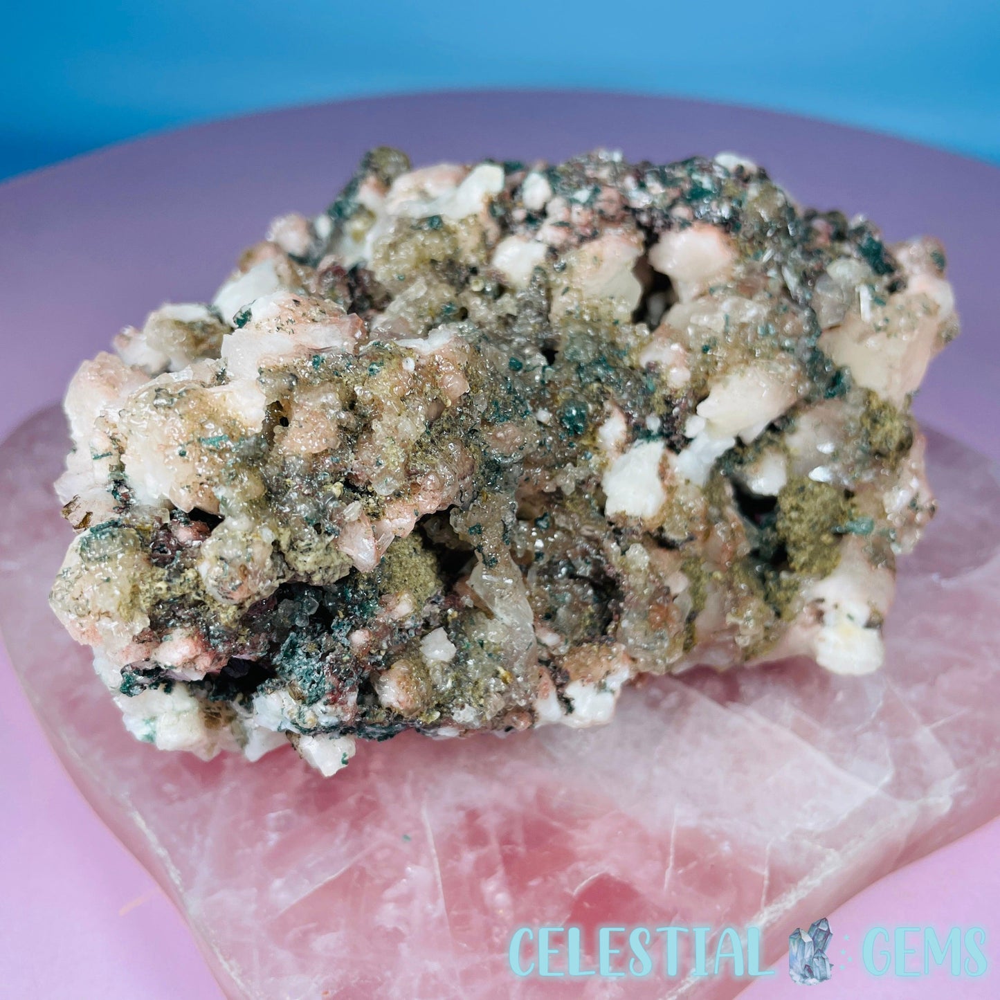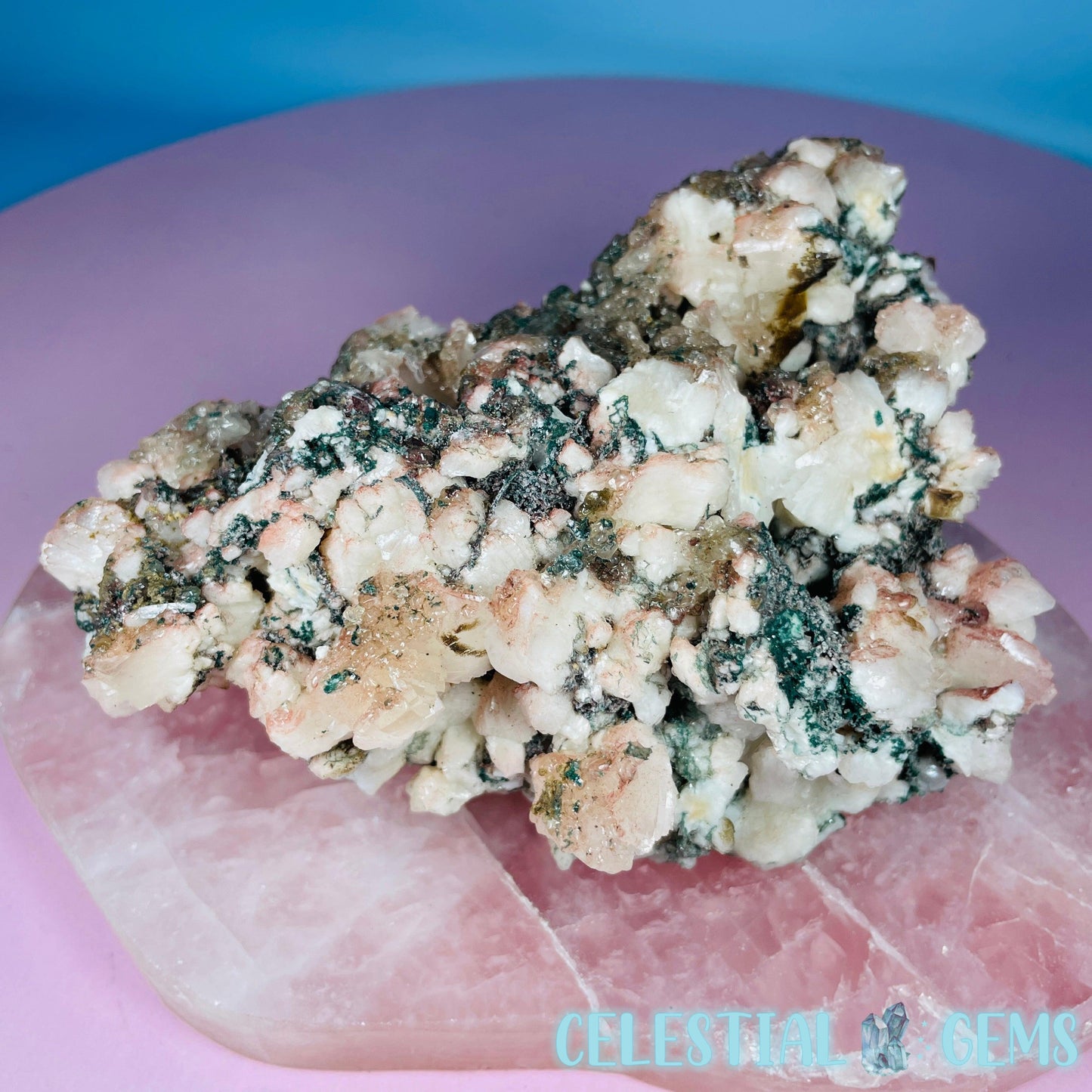 A large cluster of "Marshy" Heulandite, a mix of Pink Heulandite, White Stilbite and dark green veins of Celadonite. May also contain other mixed Zeolite minerals. An unusual find from the Maharashtra region of India.