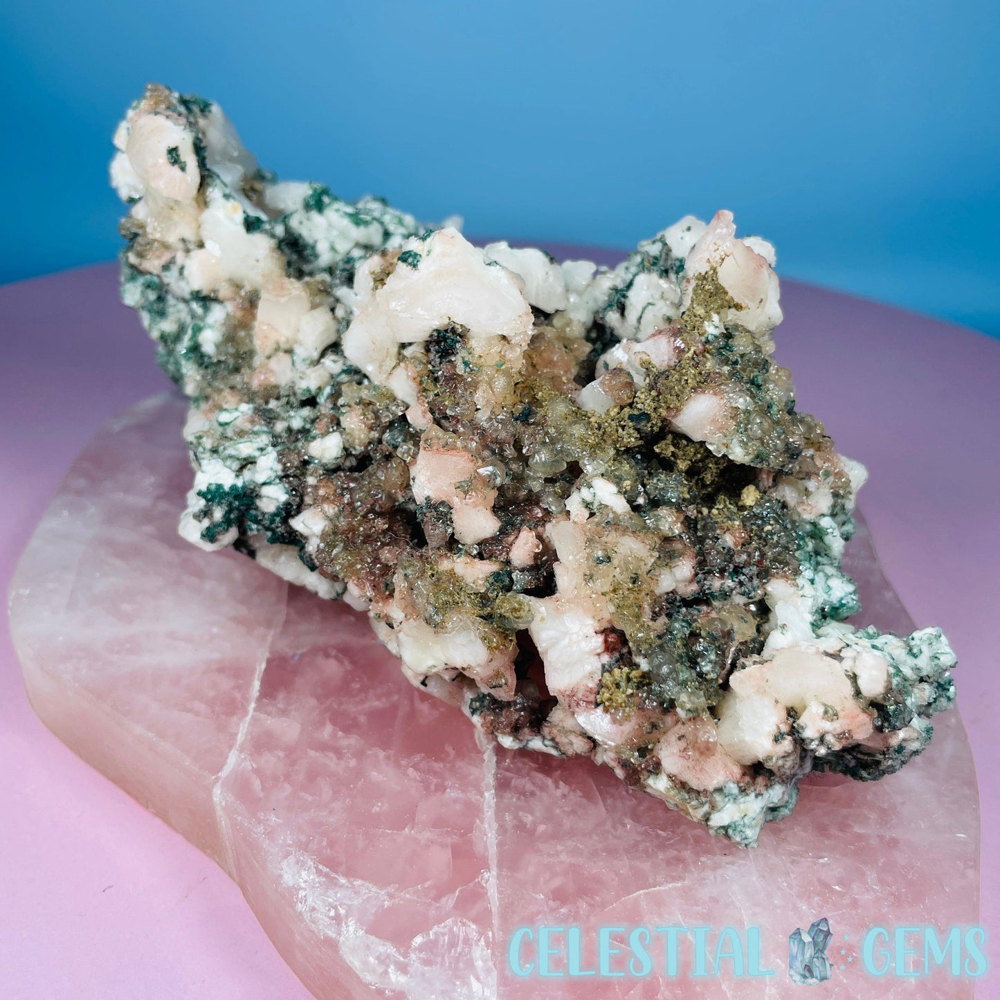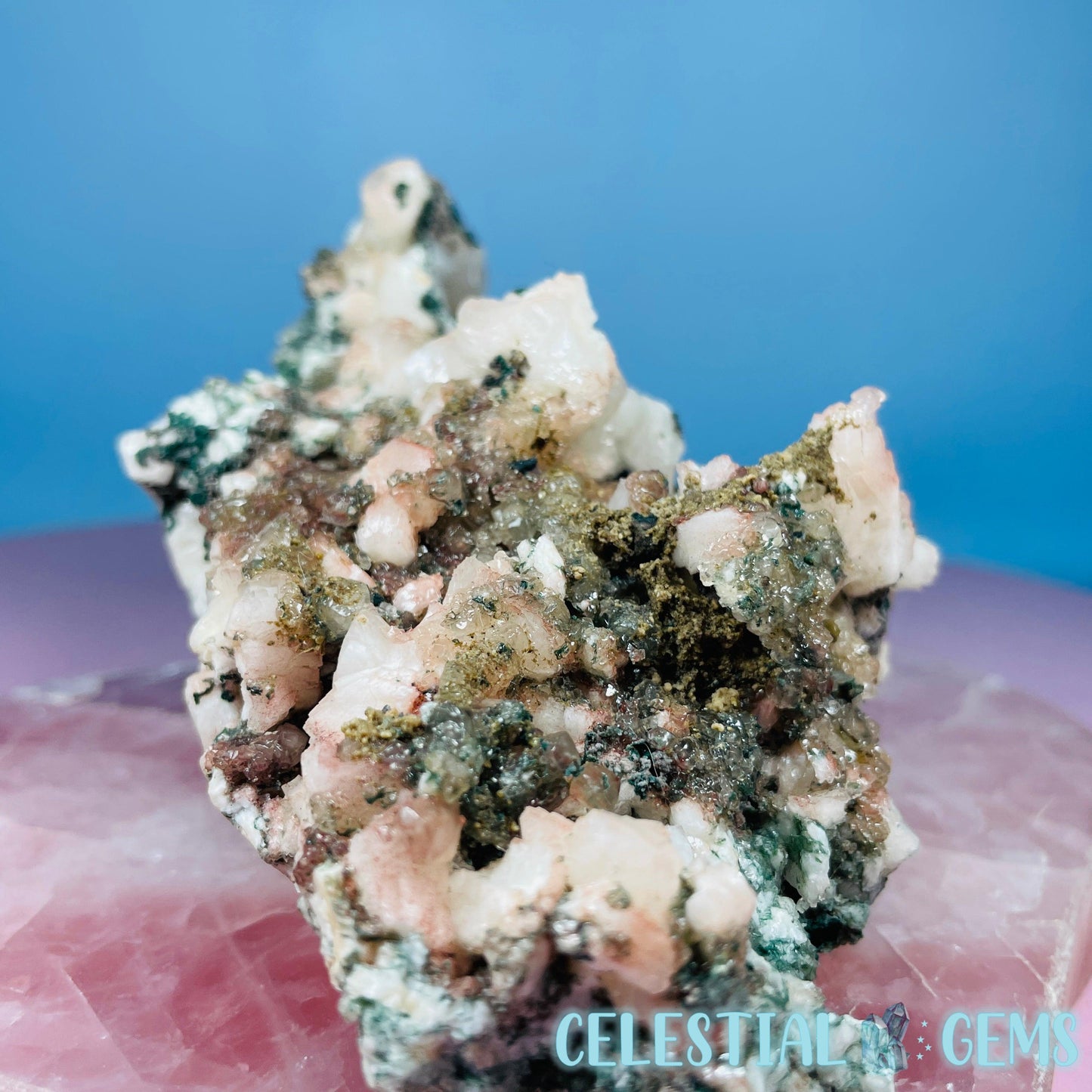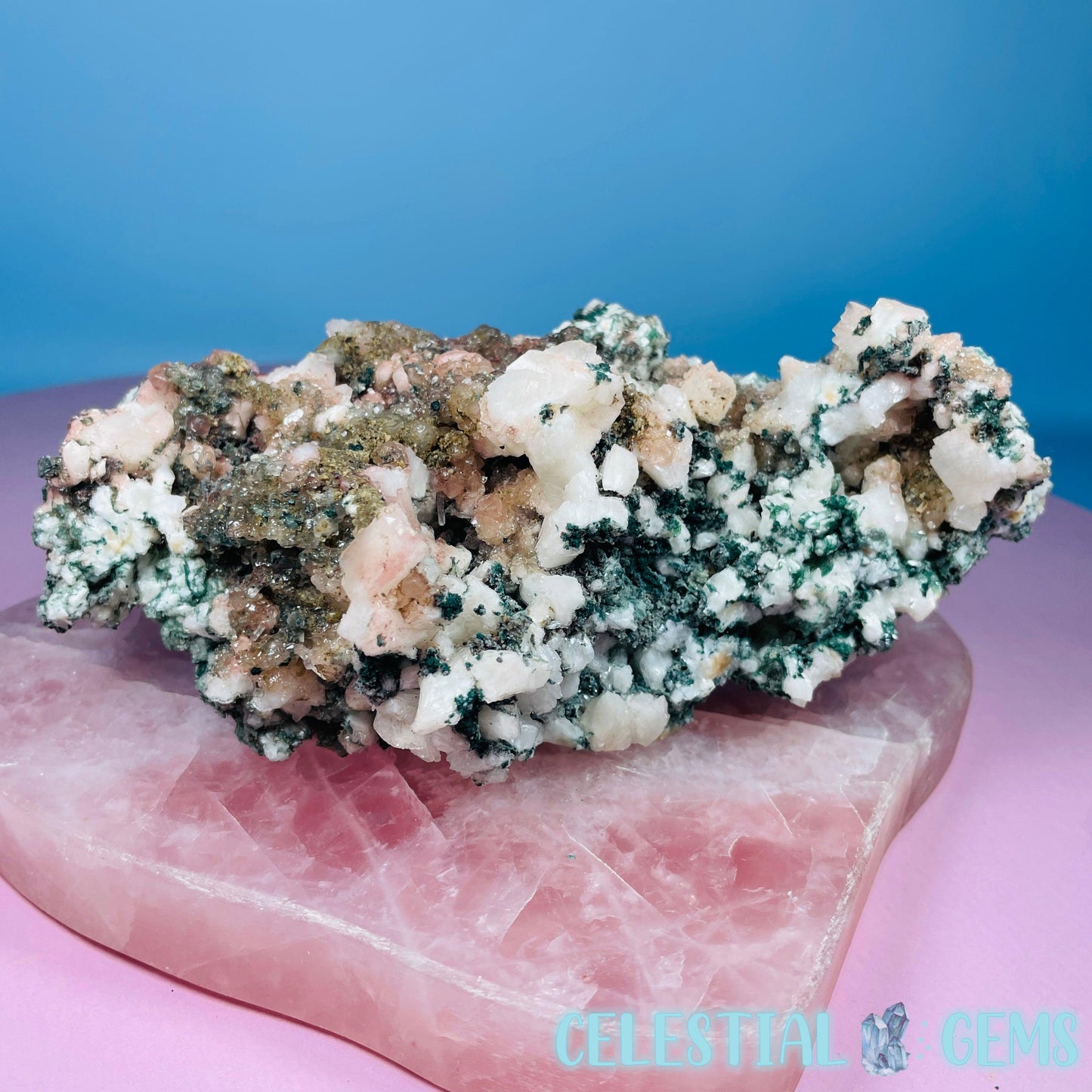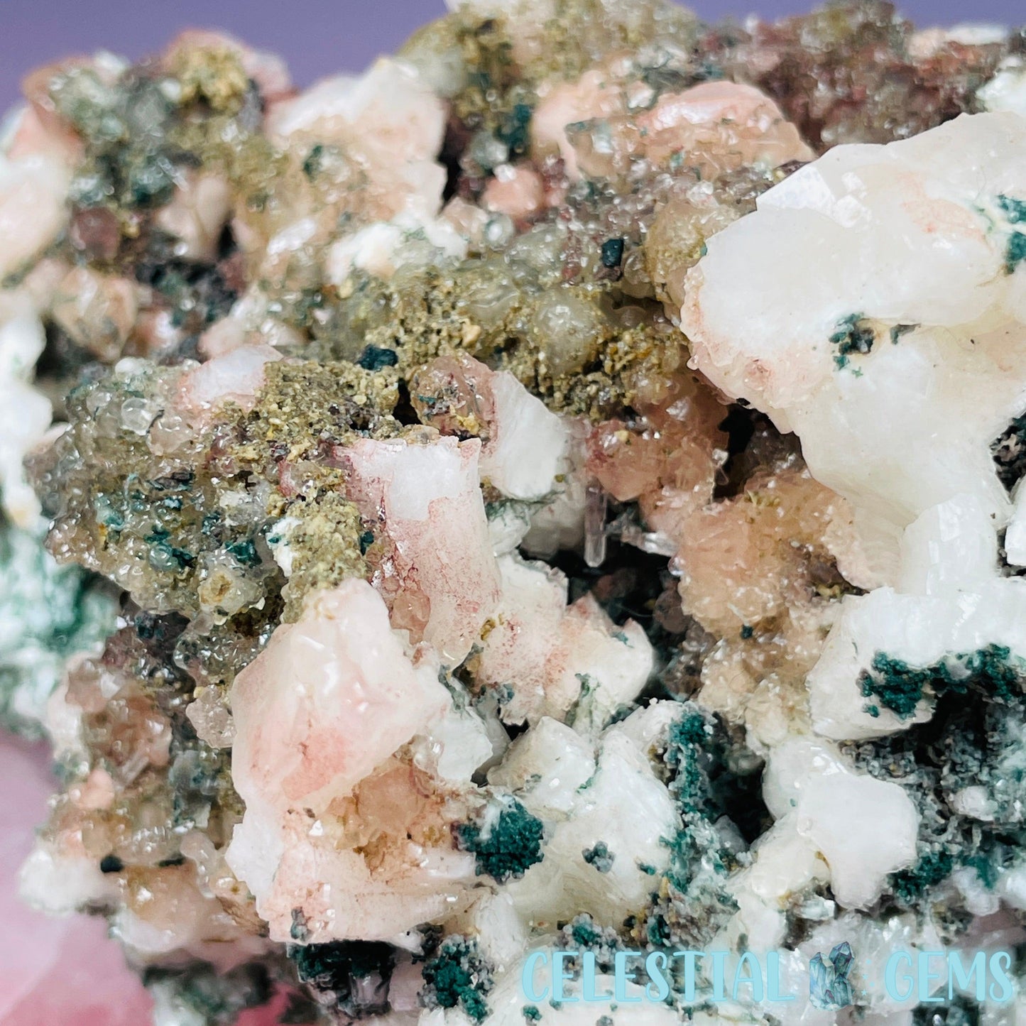 A large cluster of "Marshy" Heulandite, a mix of Pink Heulandite, White Stilbite and dark green veins of Celadonite. May also contain other mixed Zeolite minerals.  An unusual find from the Maharashtra region of India.