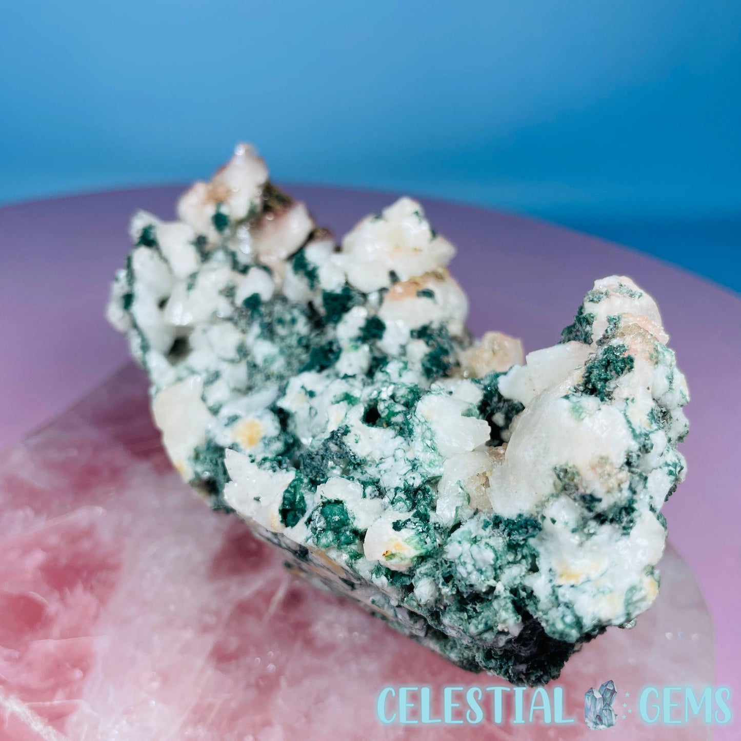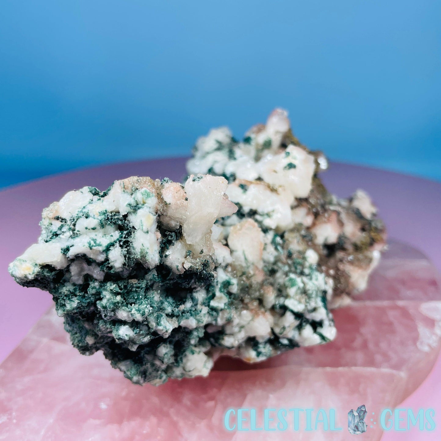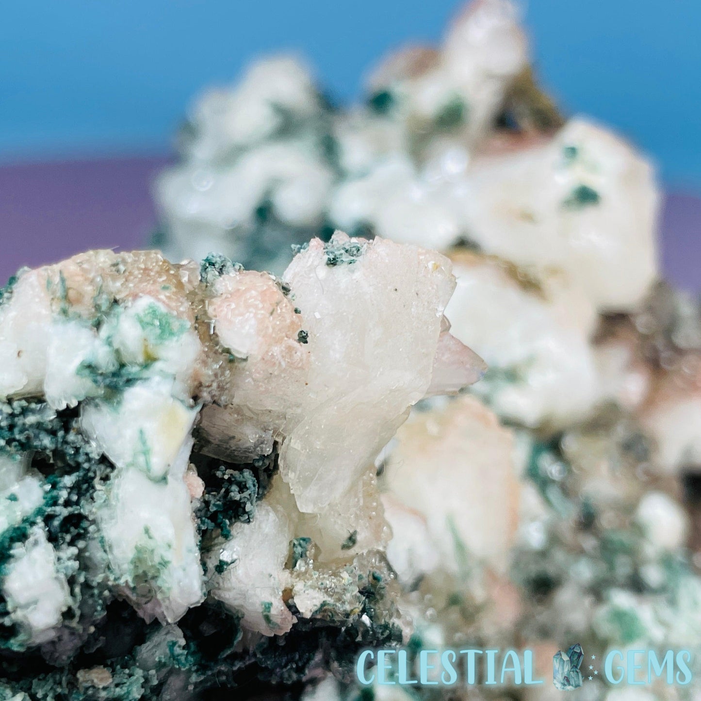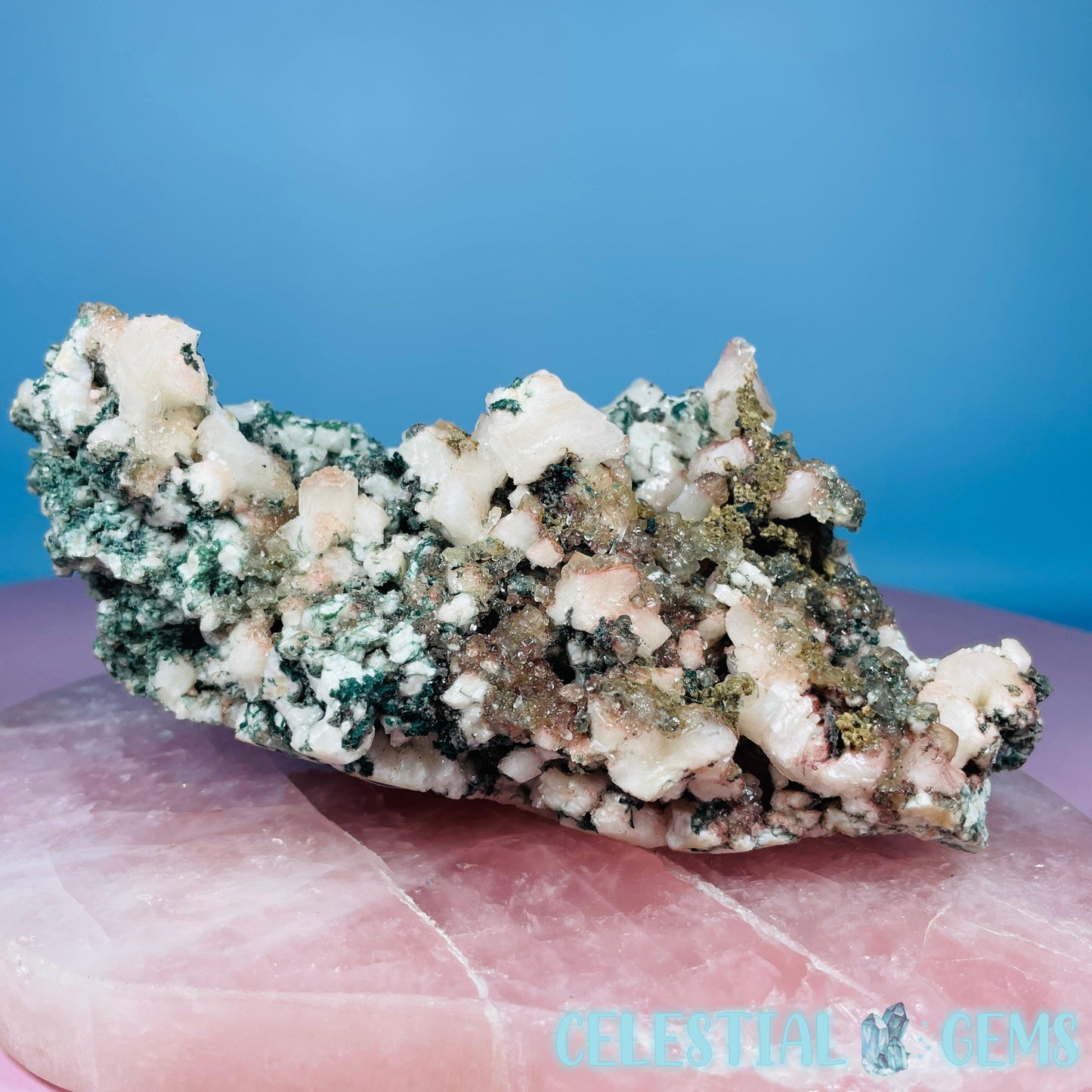 A large cluster of "Marshy" Heulandite, a mix of Pink Heulandite, White Stilbite and dark green veins of Celadonite. May also contain other mixed Zeolite minerals.  An unusual find from the Maharashtra region of India.