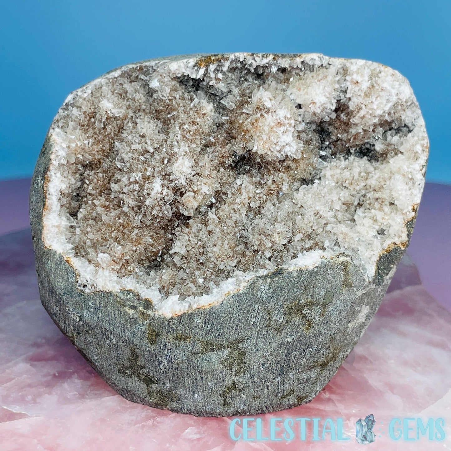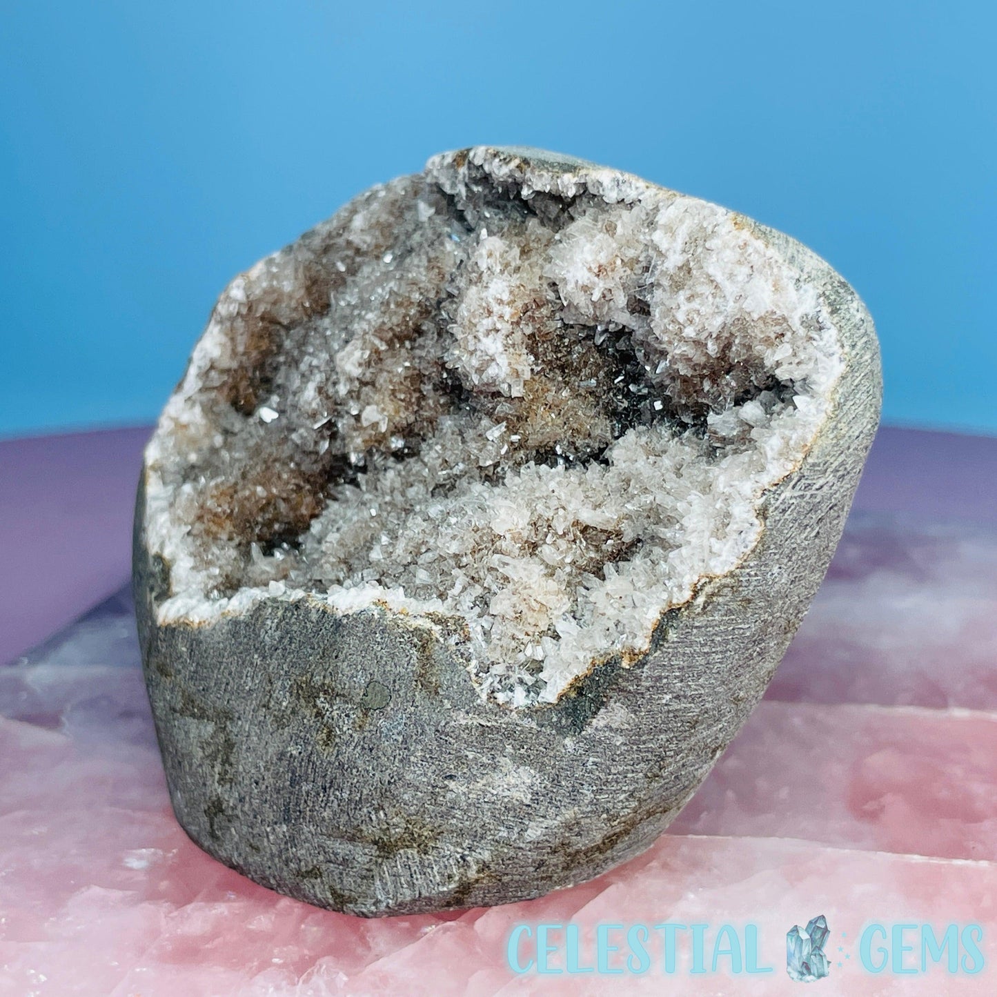 A druzy Geode of Zeolite minerals which has sparkly crystals inside a Basalt matrix cut into a standing freeform. Could contain Apophyllite, Heulandite, Calcite, Quartz, Stilbite, Scolecite, Chalcedony or other Zeolite minerals. Approx. 7cm x 6cm x 4.2cm.