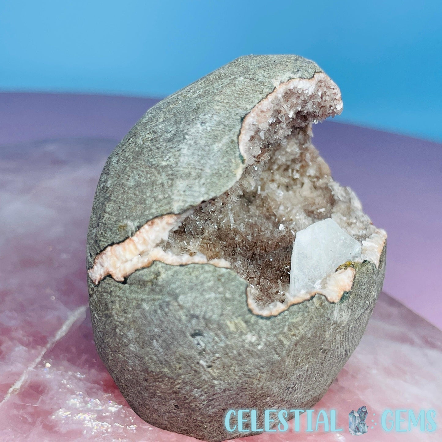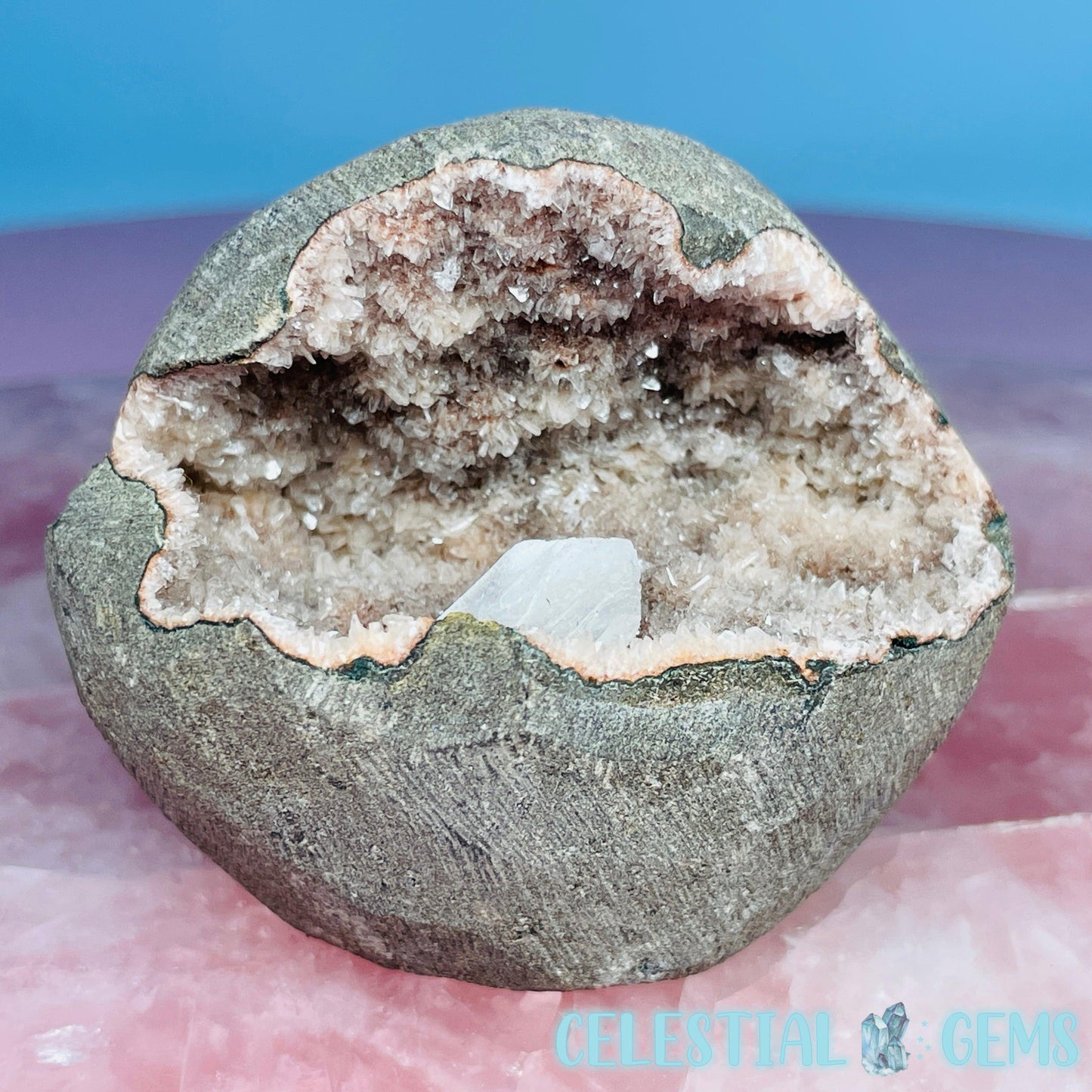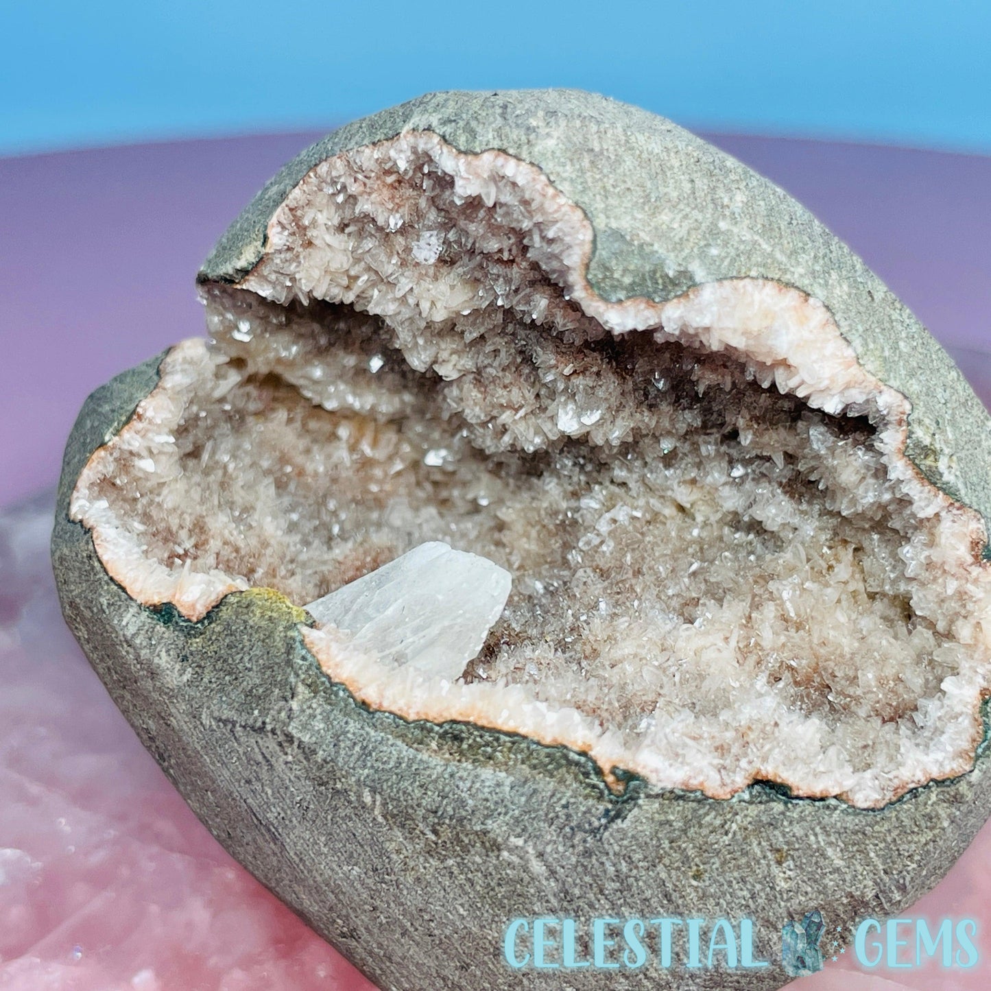 A druzy Geode of Zeolite minerals which has sparkly crystals inside a Basalt matrix cut into a standing freeform. Could contain Apophyllite, Heulandite, Calcite, Quartz, Stilbite, Scolecite, Chalcedony or other Zeolite minerals. Approx. 6cm x 5.2cm x 3.8cm.