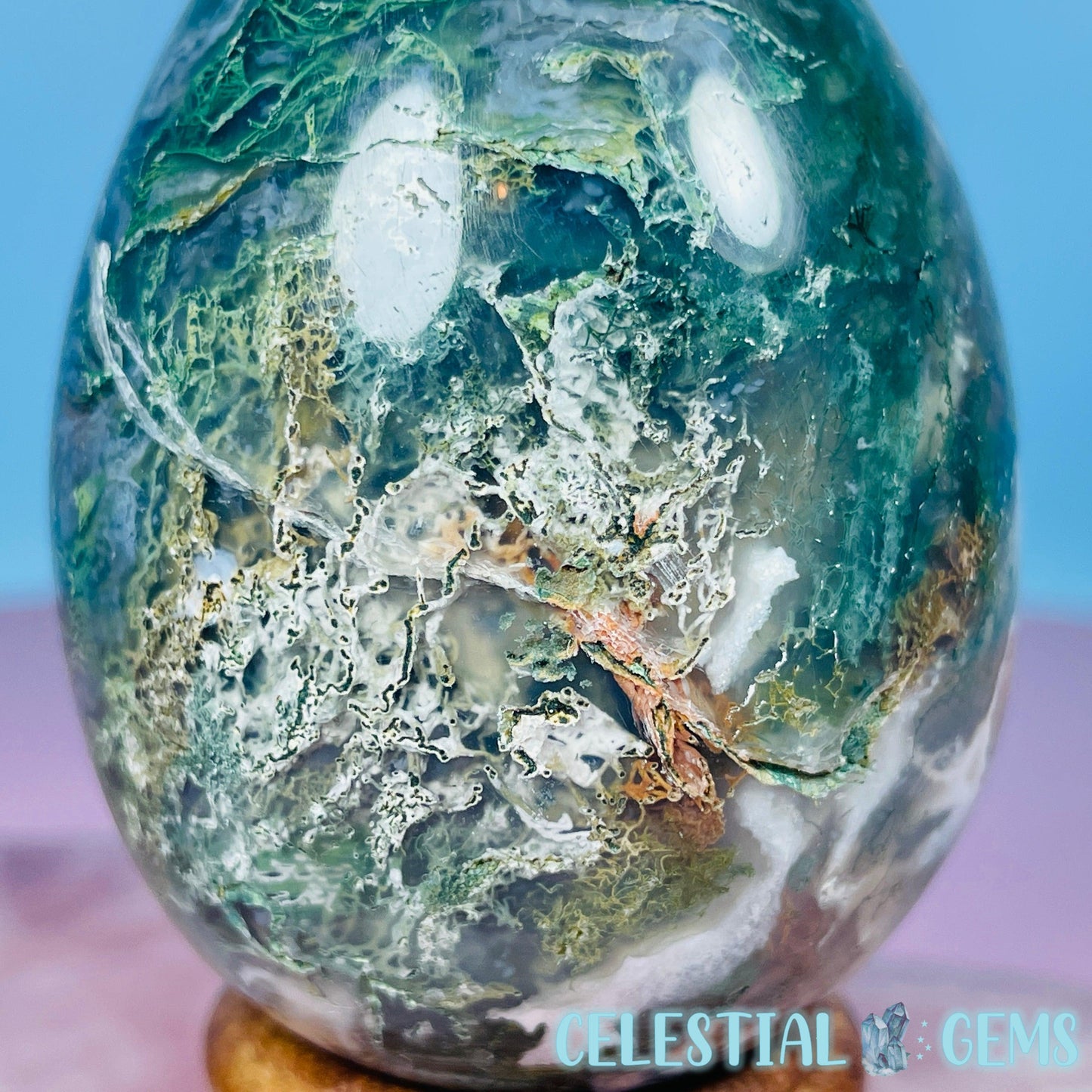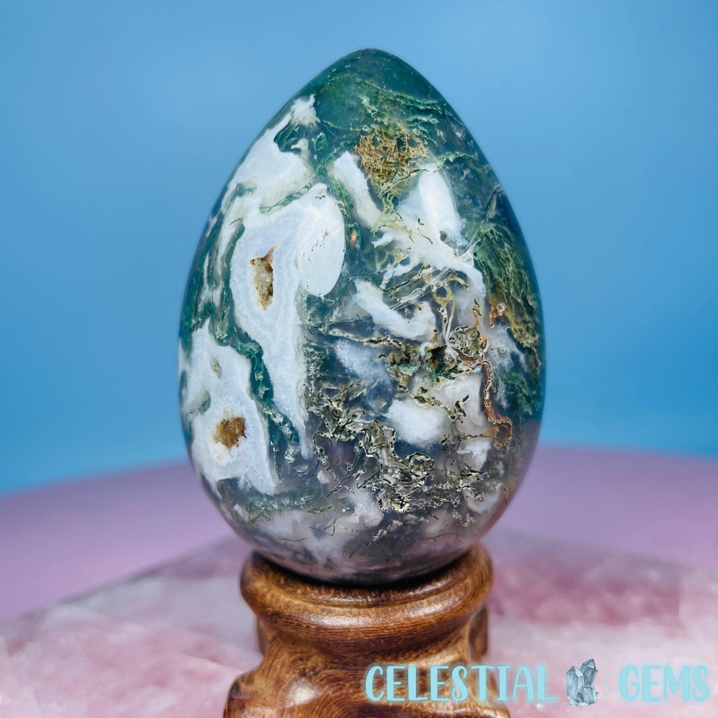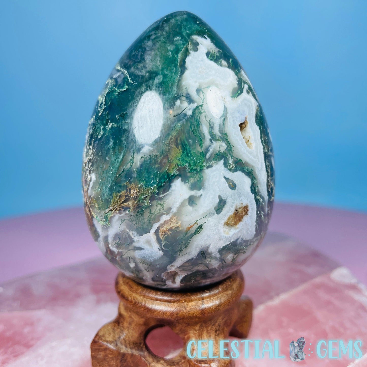 A carved egg of beautiful green, blue and white Moss Agate crystal. Approx. 6.6cm x 4.6cm. Sphere stand sold separately.