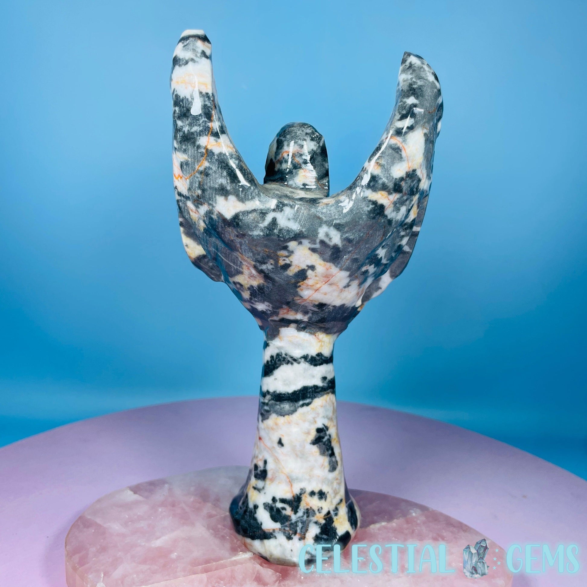 A gothic-style carving of the 'Angel of Death' carved from orange spotted Zebra Jasper. Approx. 20cm x 9.5cm x 5.5cm.