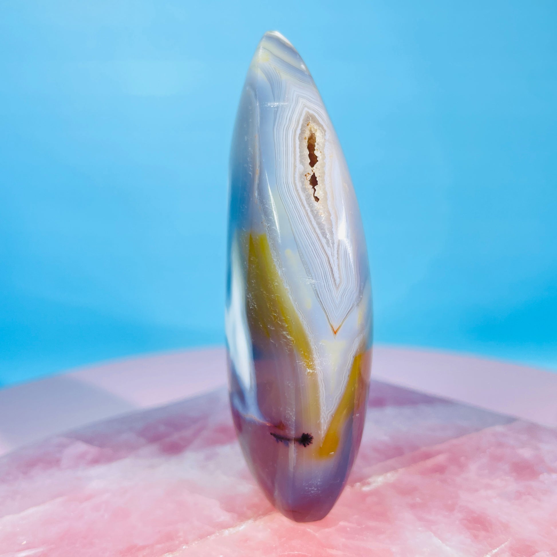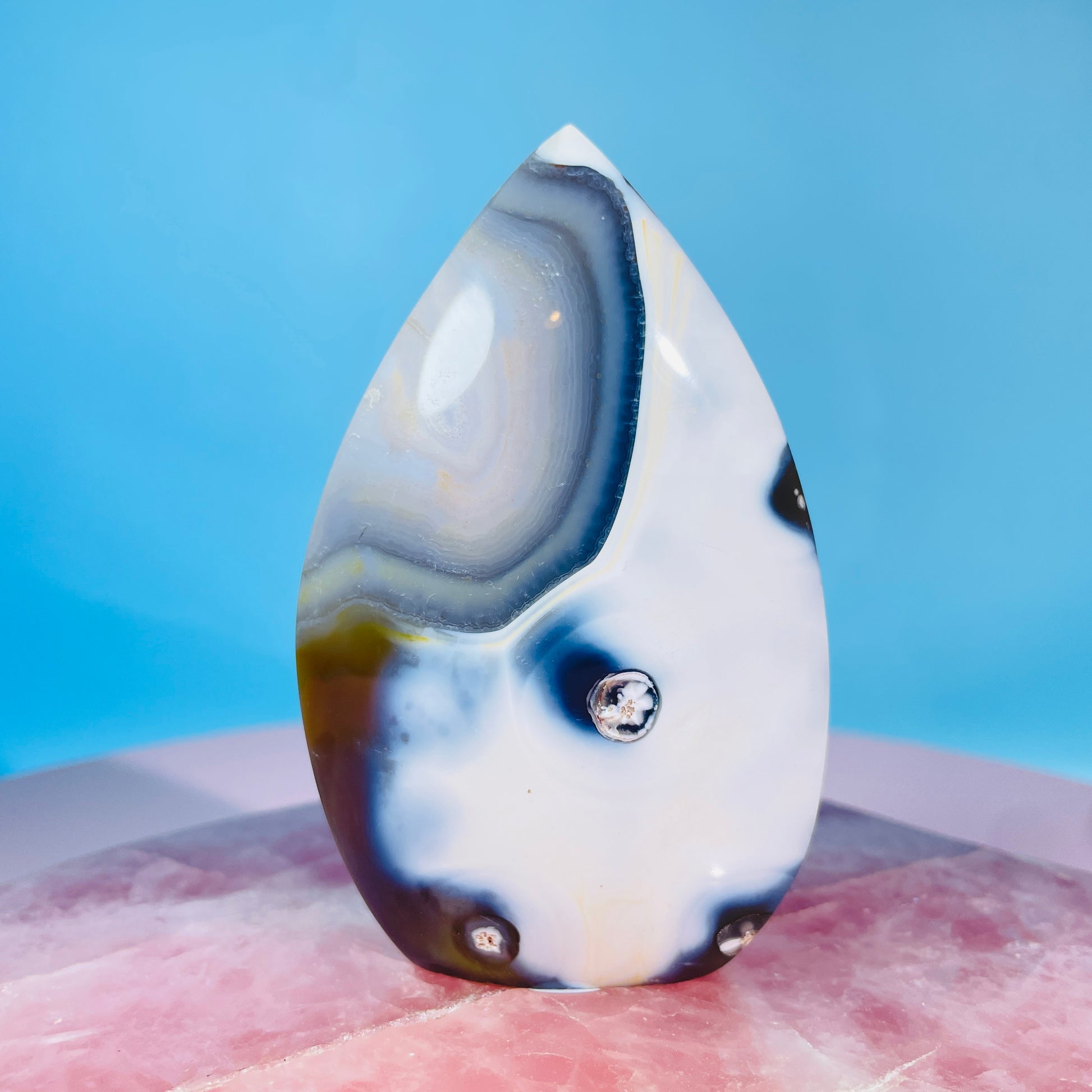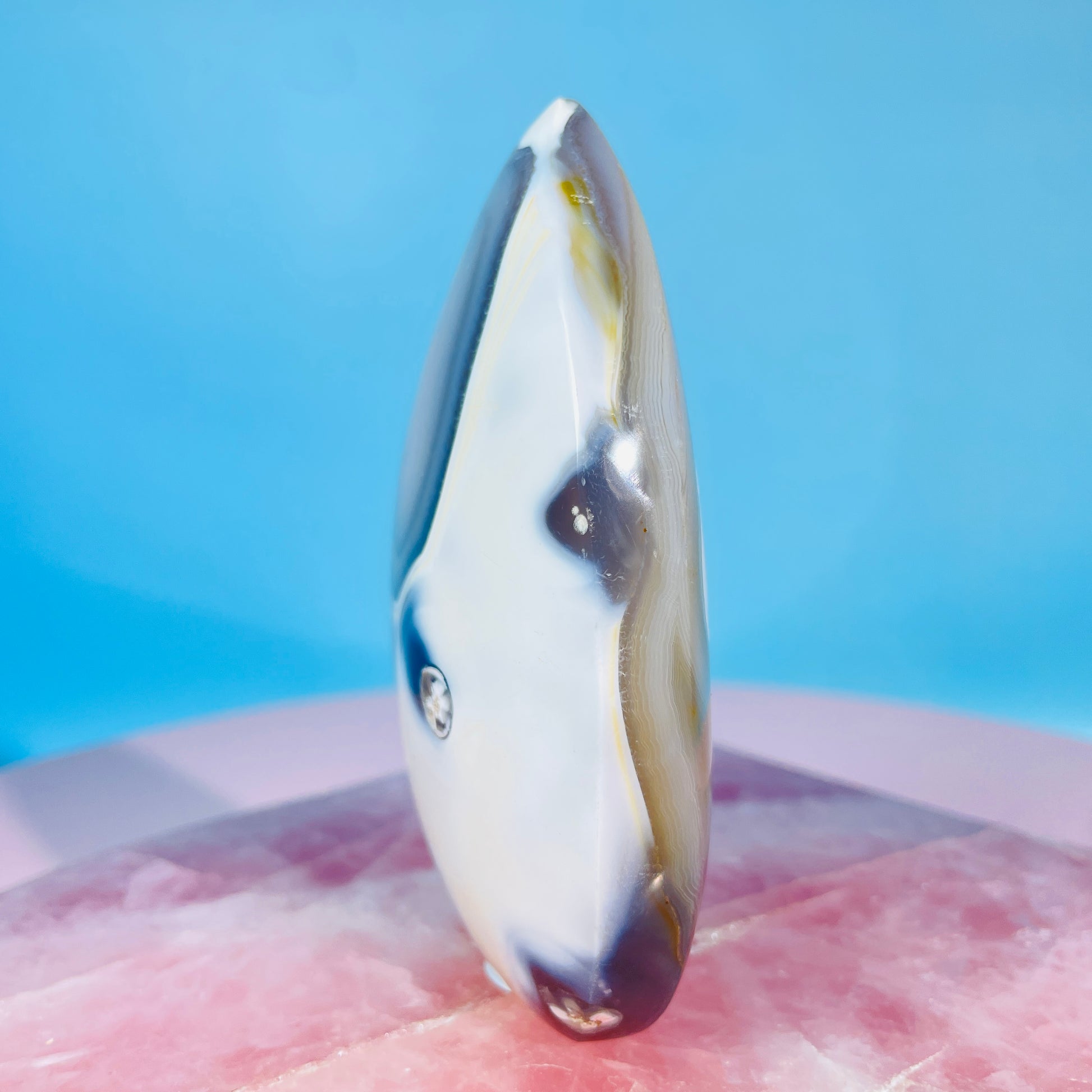 A small flame freeform of Orca Agate, a white rind-covered blue Agate with gorgeous patterns. Sourced from Madagascar.