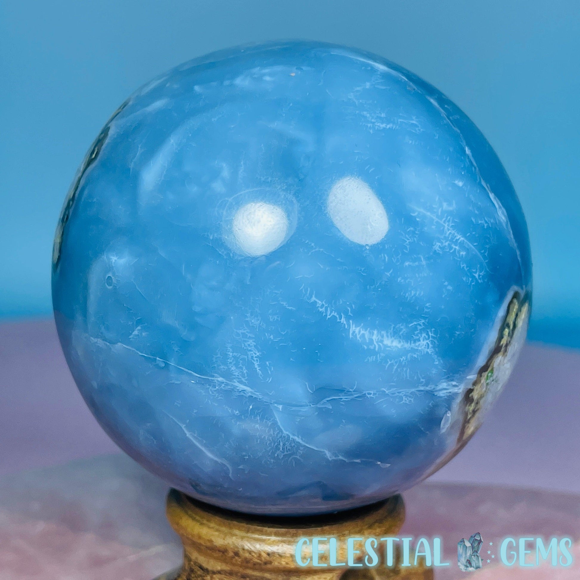 An uncommon mineral, Owhyee Blue Opal is a banded Opal/Agate blend from Oregon, USA. This sphere has a Moss Agate inclusion.