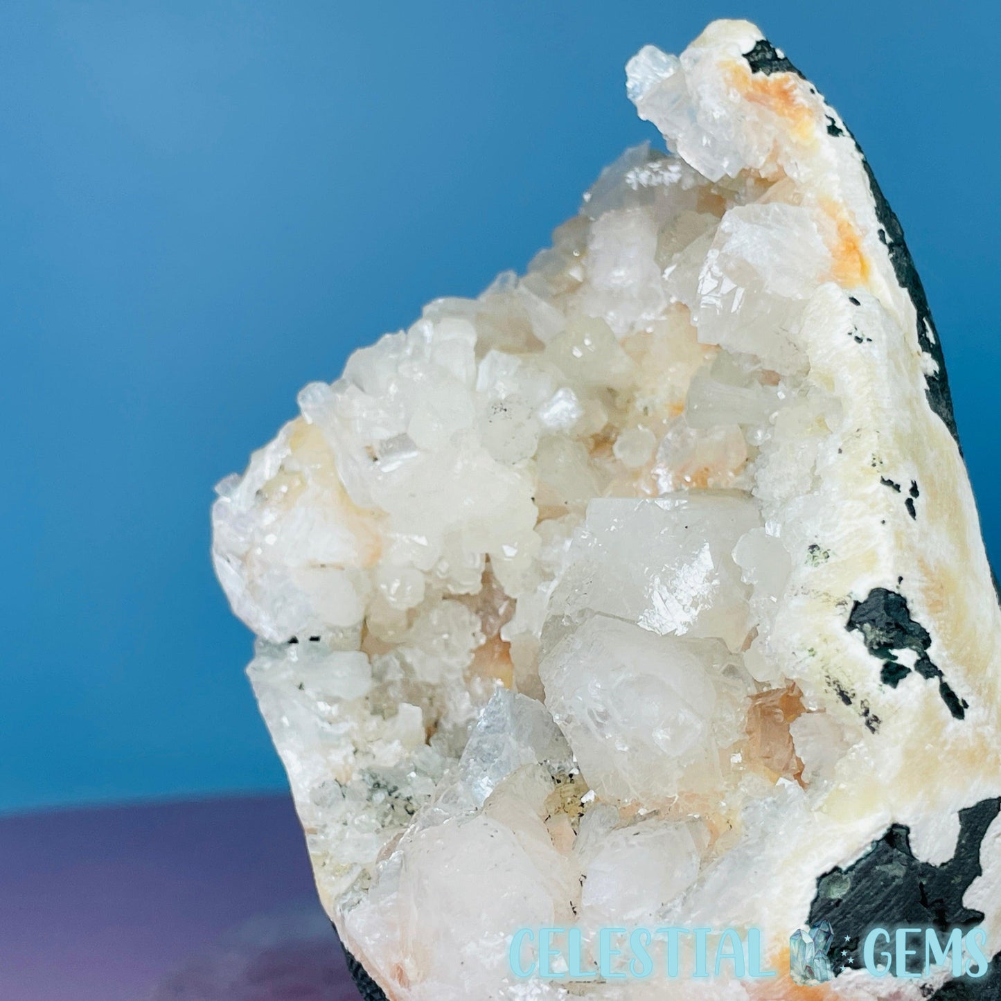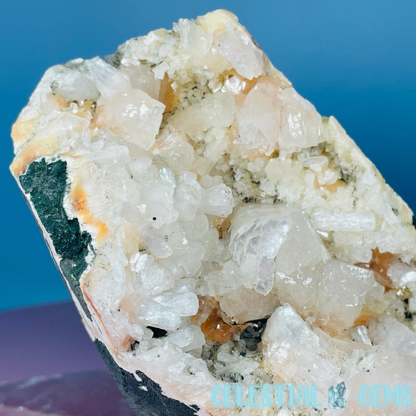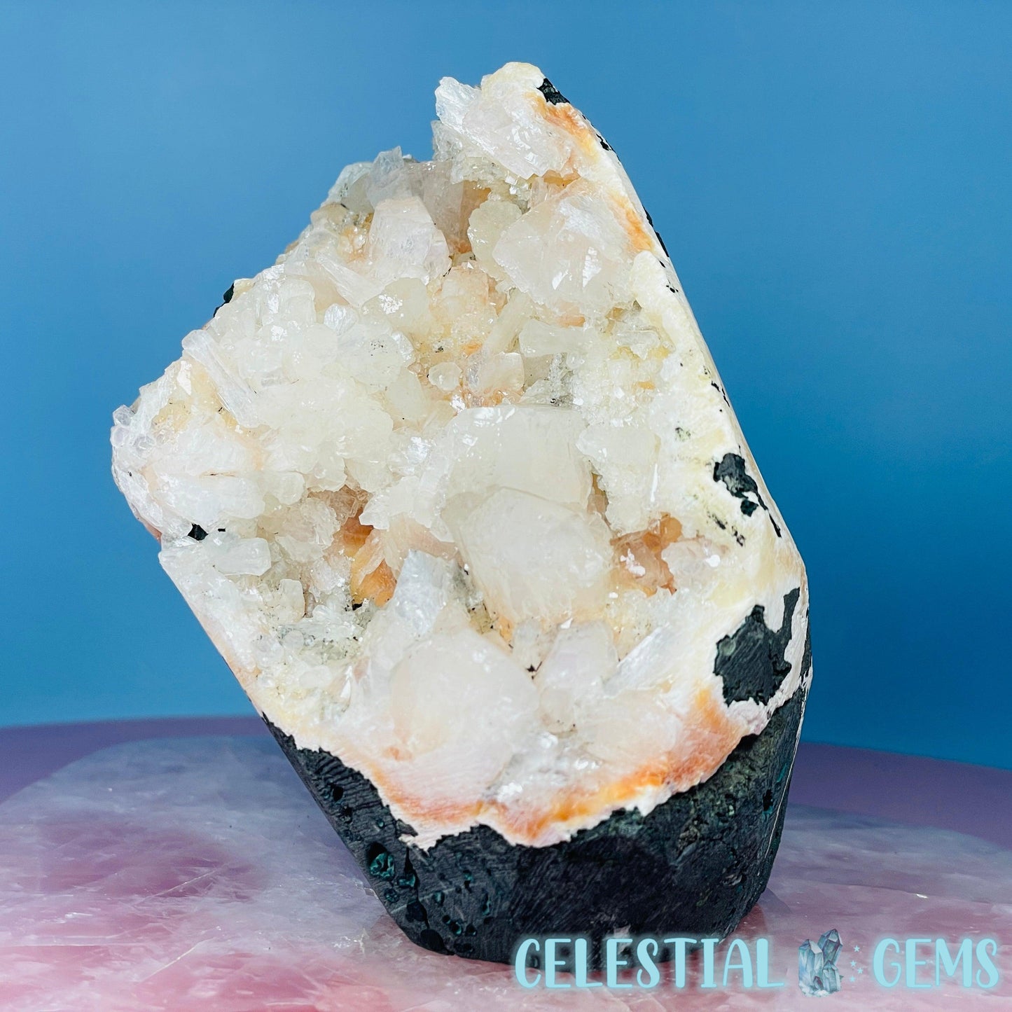 A standing cluster of Peach Heulandite crystals growing in a geode formation within Basalt volcanic rock. With very sparkly white and pink crystals growing over an orange and white layer. Sourced from Maharashtra, India.