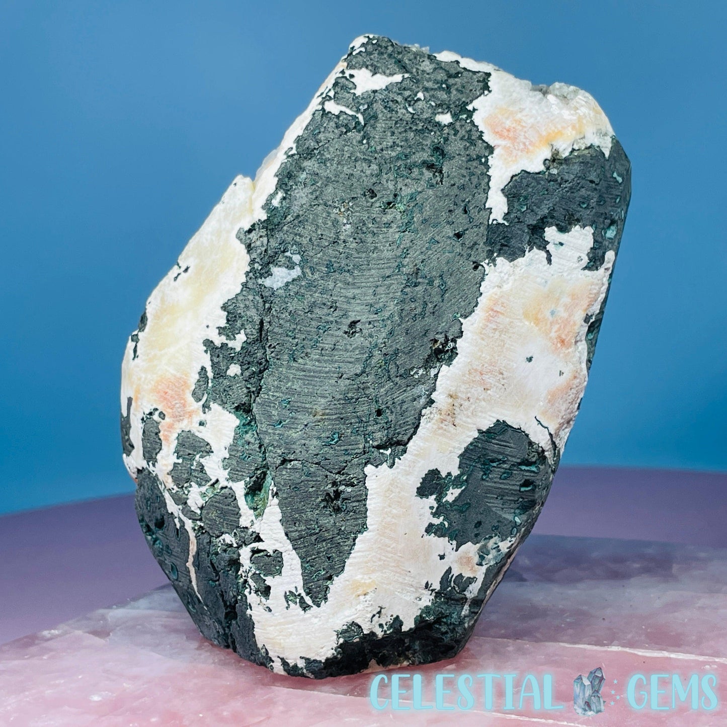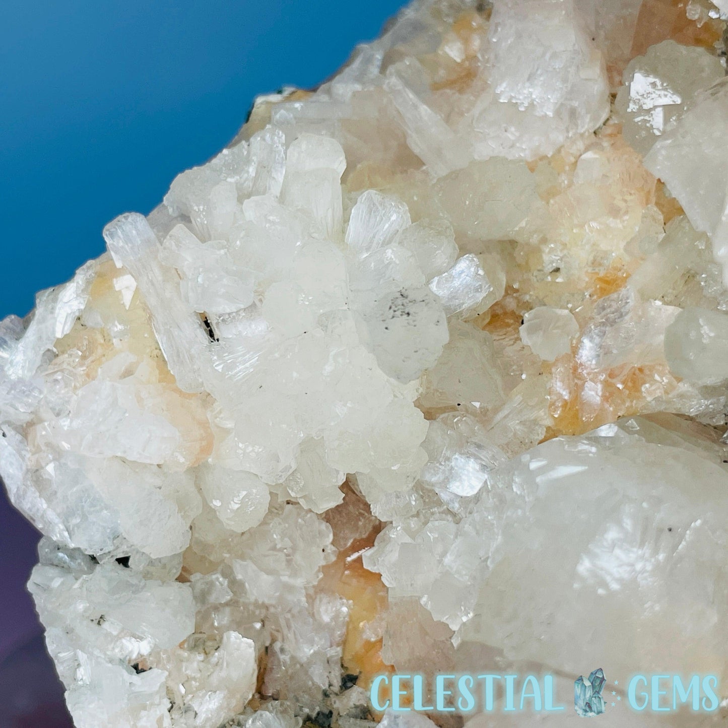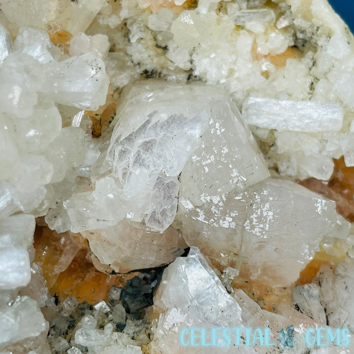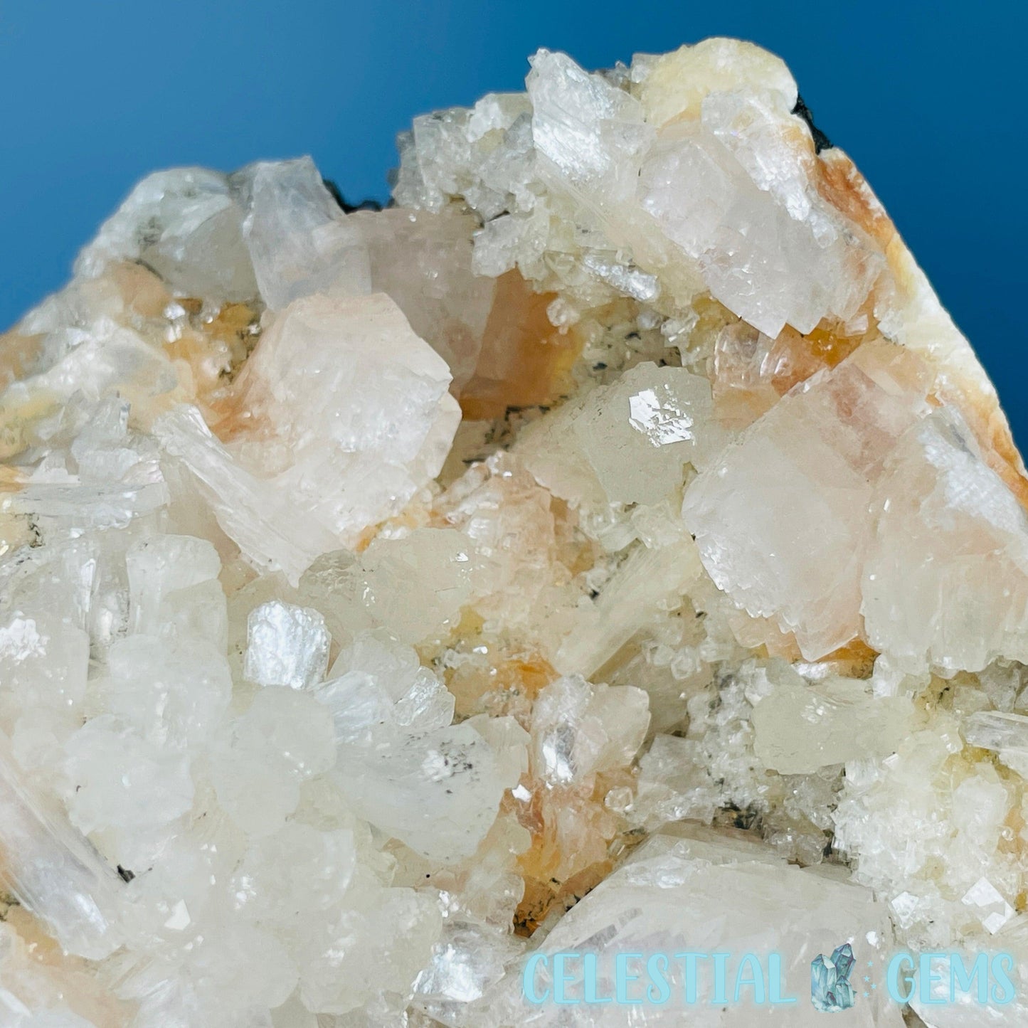 A standing cluster of Peach Heulandite crystals growing in a geode formation within Basalt volcanic rock. With very sparkly white and pink crystals growing over an orange and white layer. Sourced from Maharashtra, India.