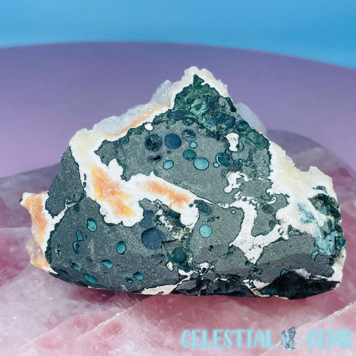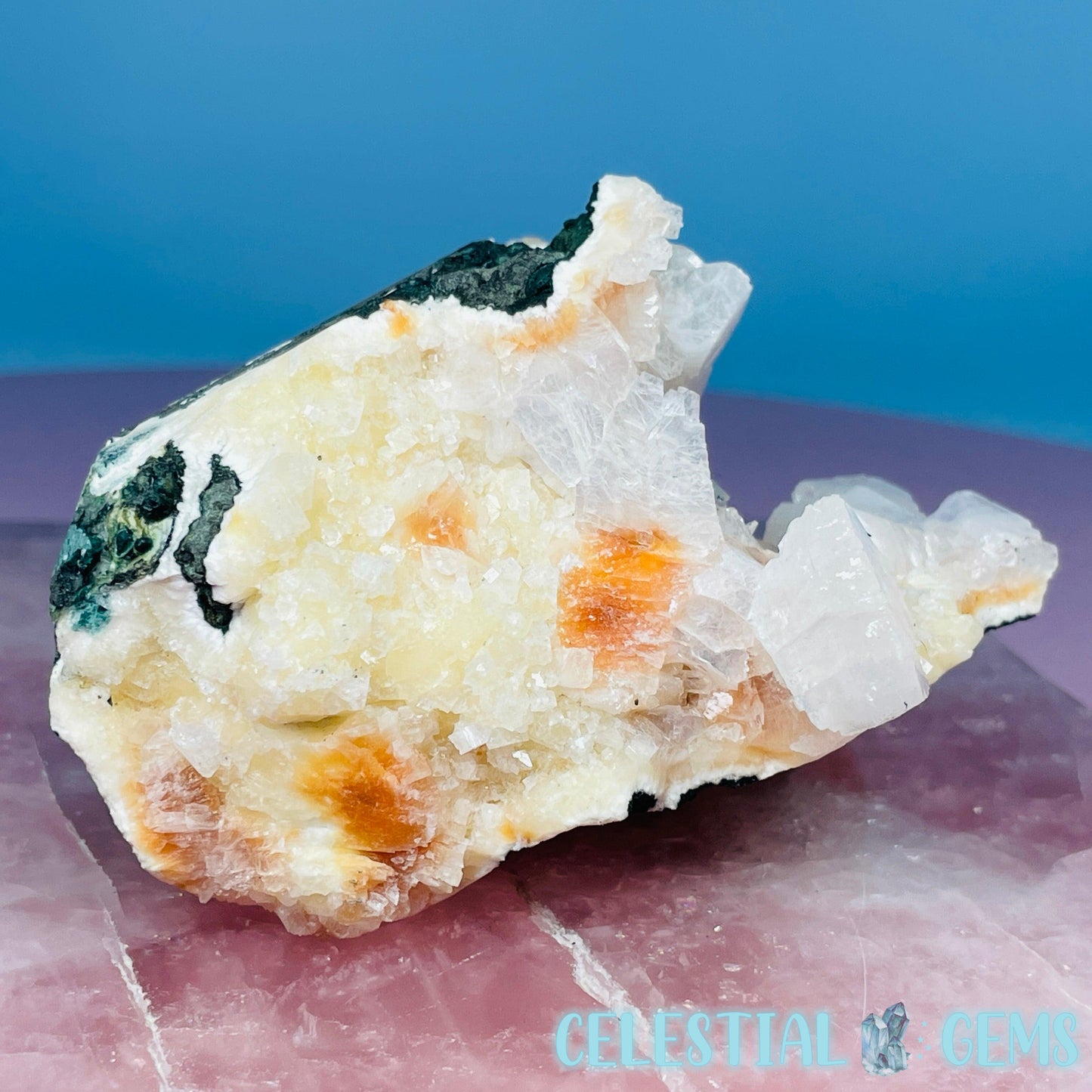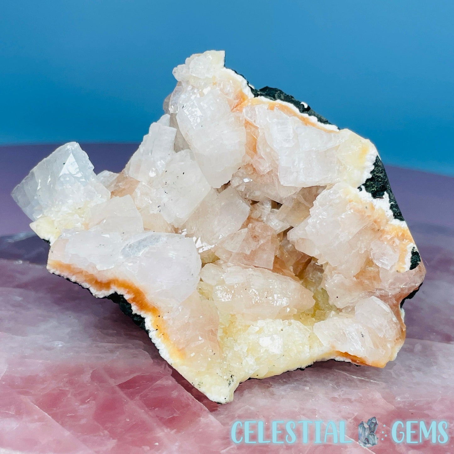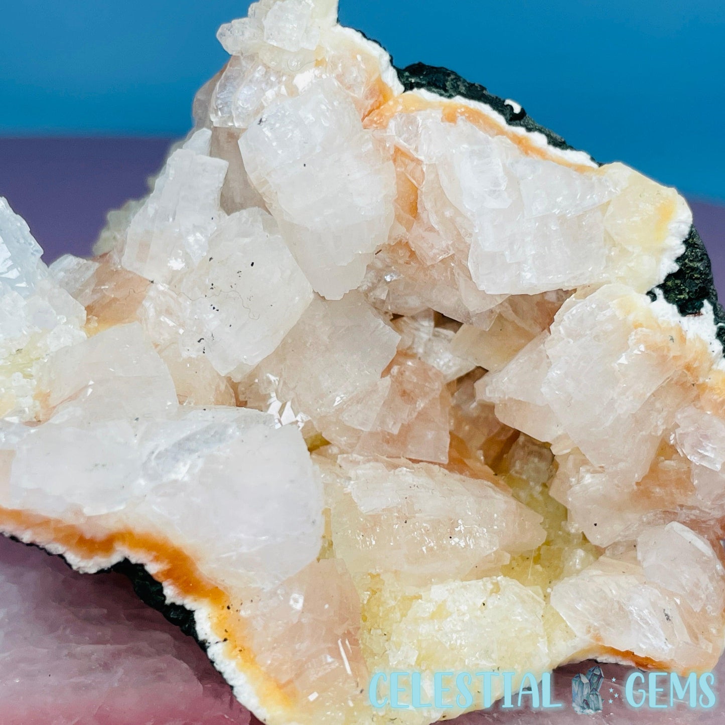 A cluster of Peach Heulandite crystals growing in a geode formation within Basalt volcanic rock. With very sparkly white and pink crystals growing over an orange and white layer. Sourced from Maharashtra, India.
