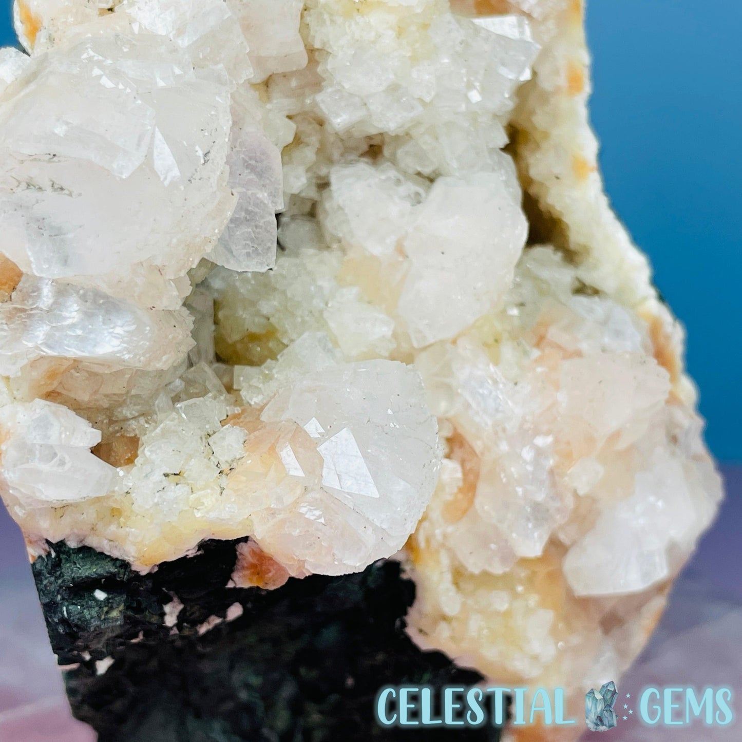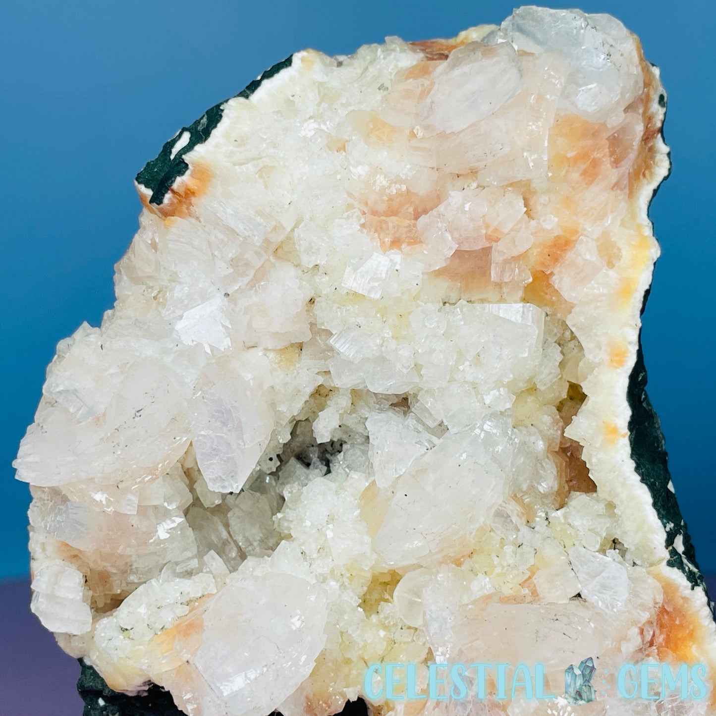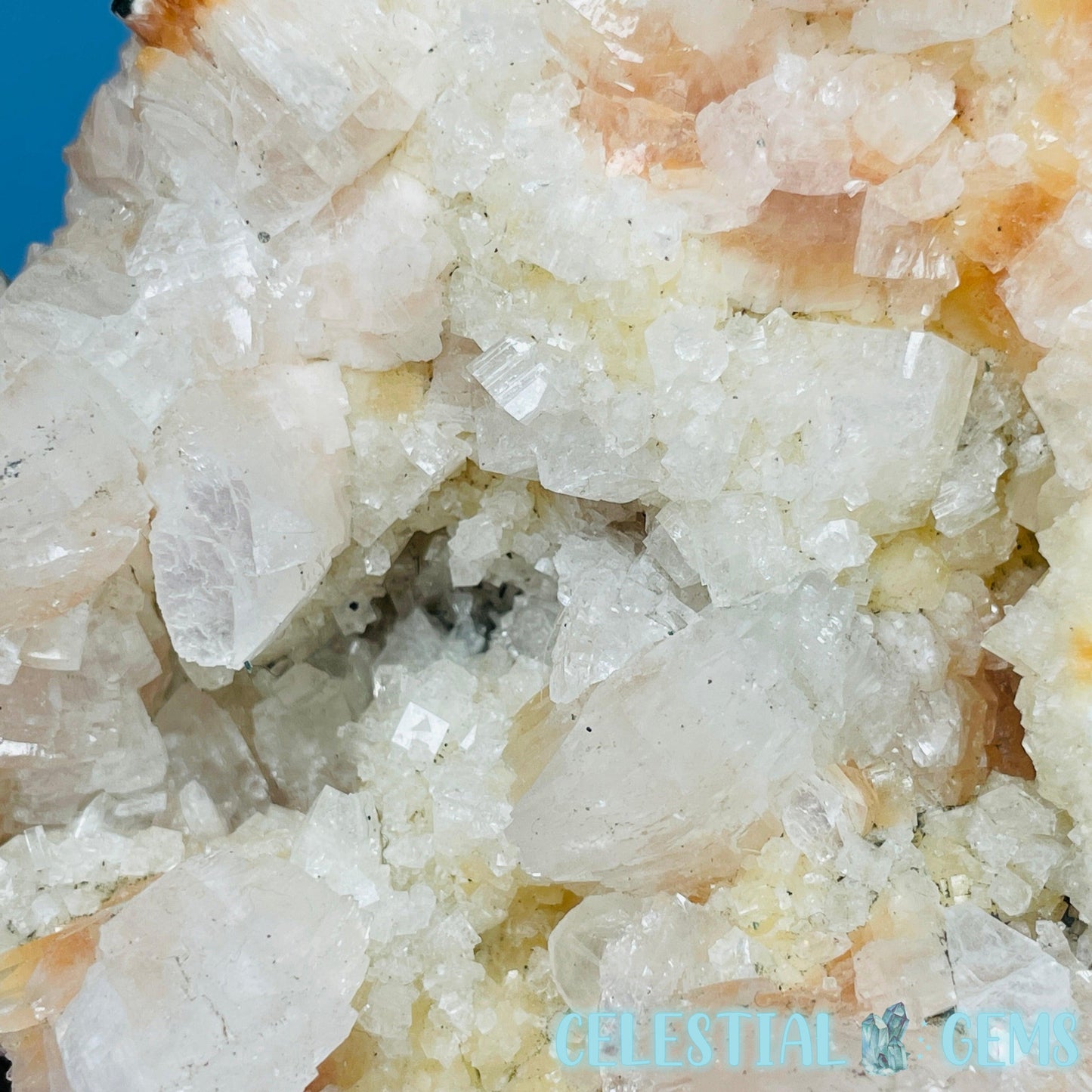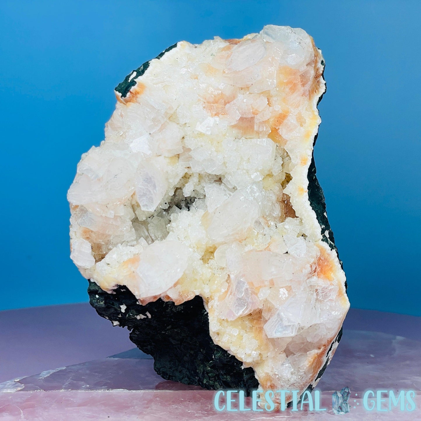 A cluster of Peach Heulandite crystals growing in a geode formation within Basalt volcanic rock. With very sparkly white and pink crystals growing over an orange and white layer. Sourced from Maharashtra, India.
