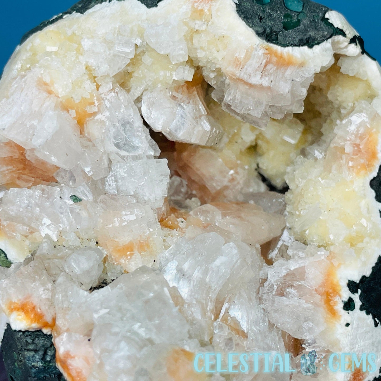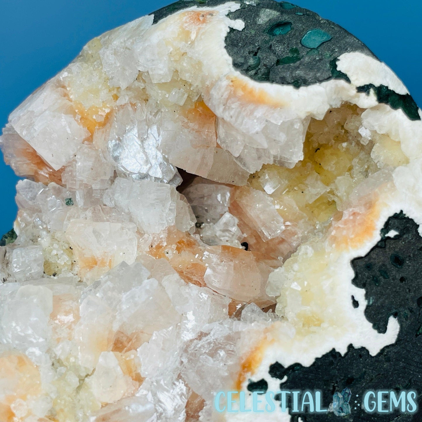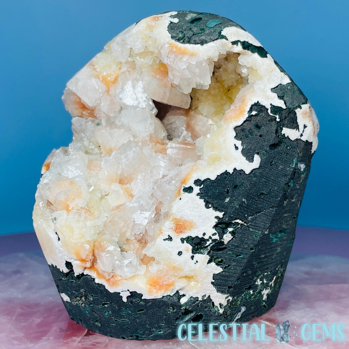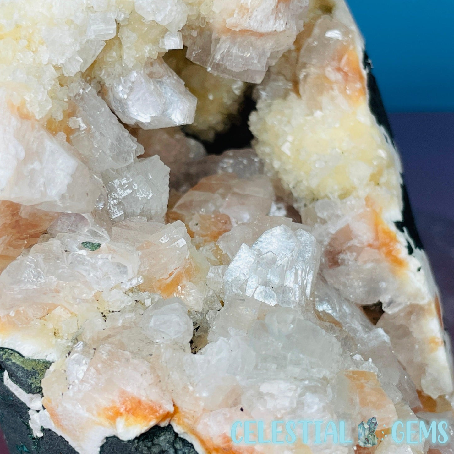 A standing cluster of Peach Heulandite crystals growing in a geode formation within Basalt volcanic rock. With very sparkly white and pink crystals growing over an orange and white layer. Sourced from Maharashtra, India.