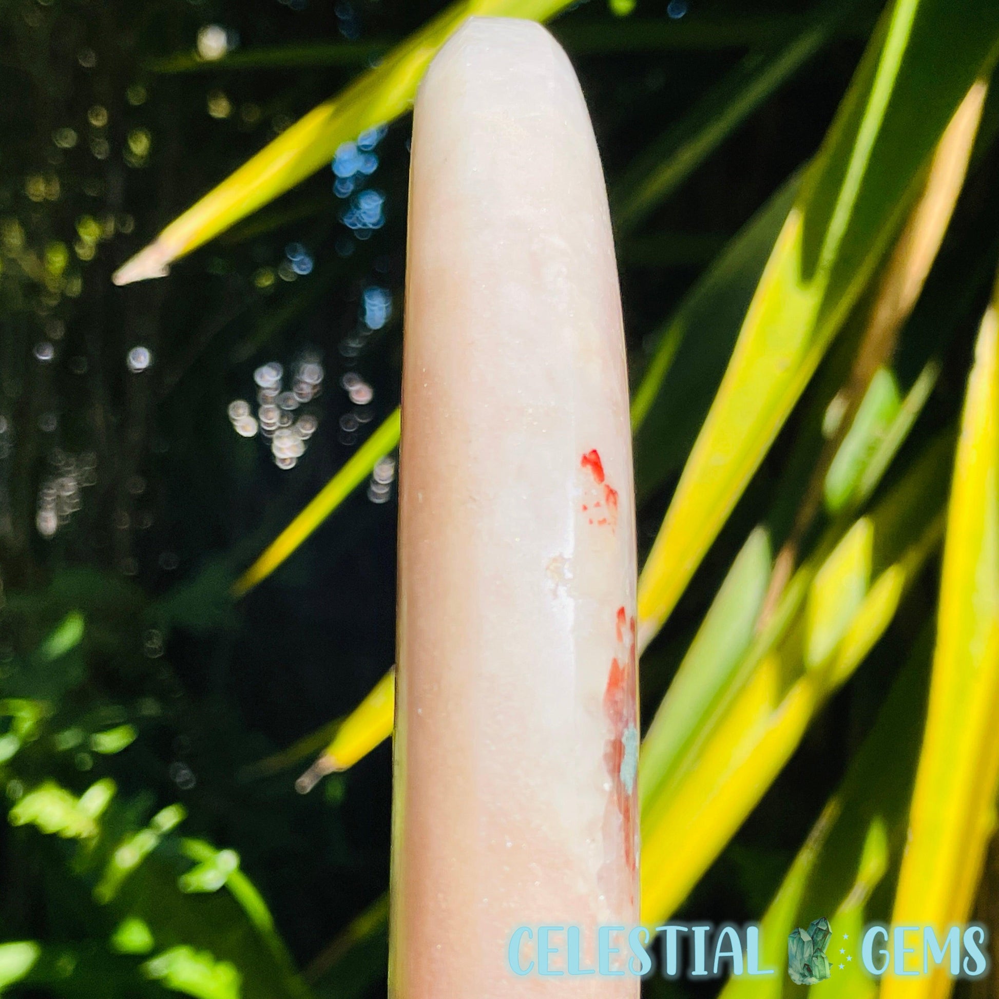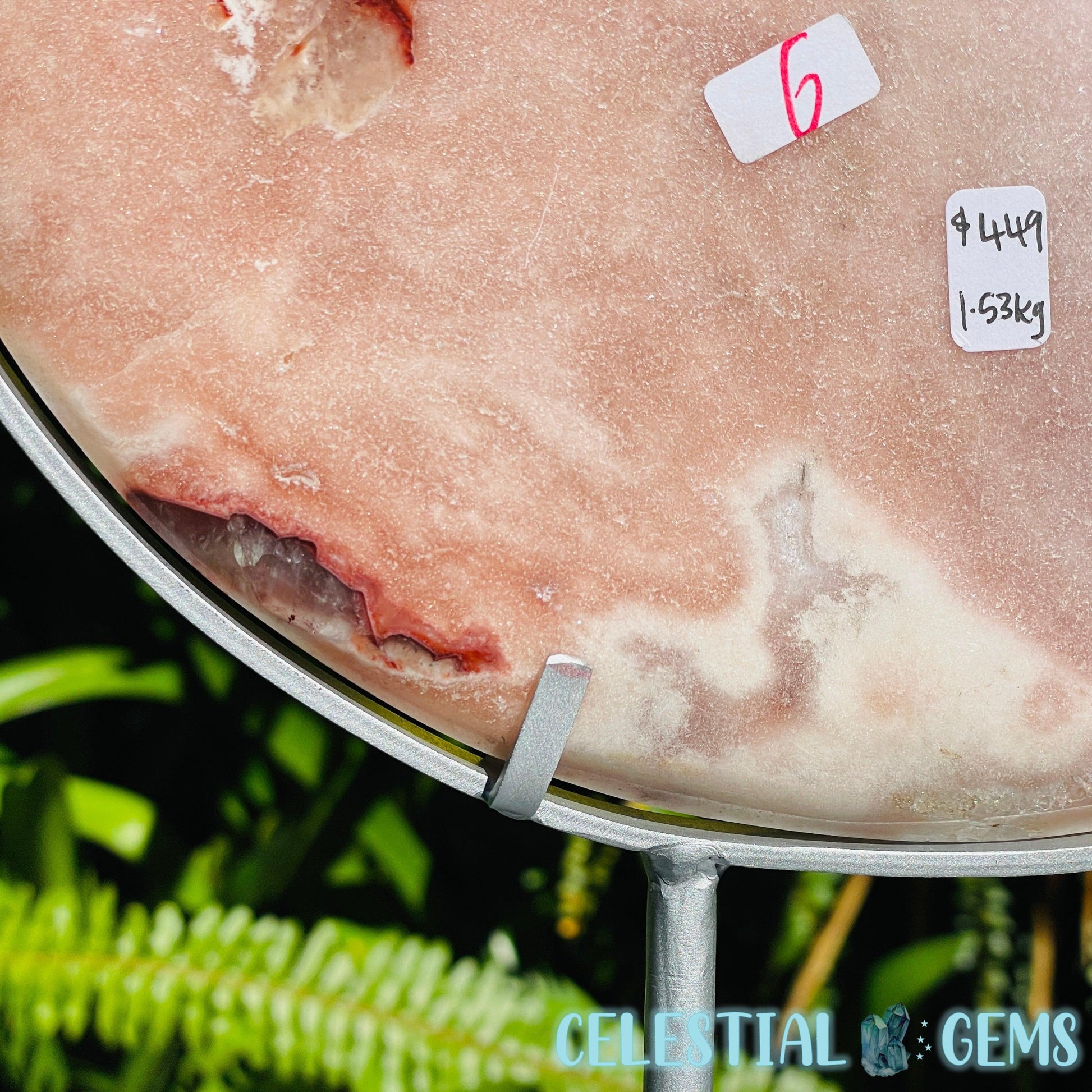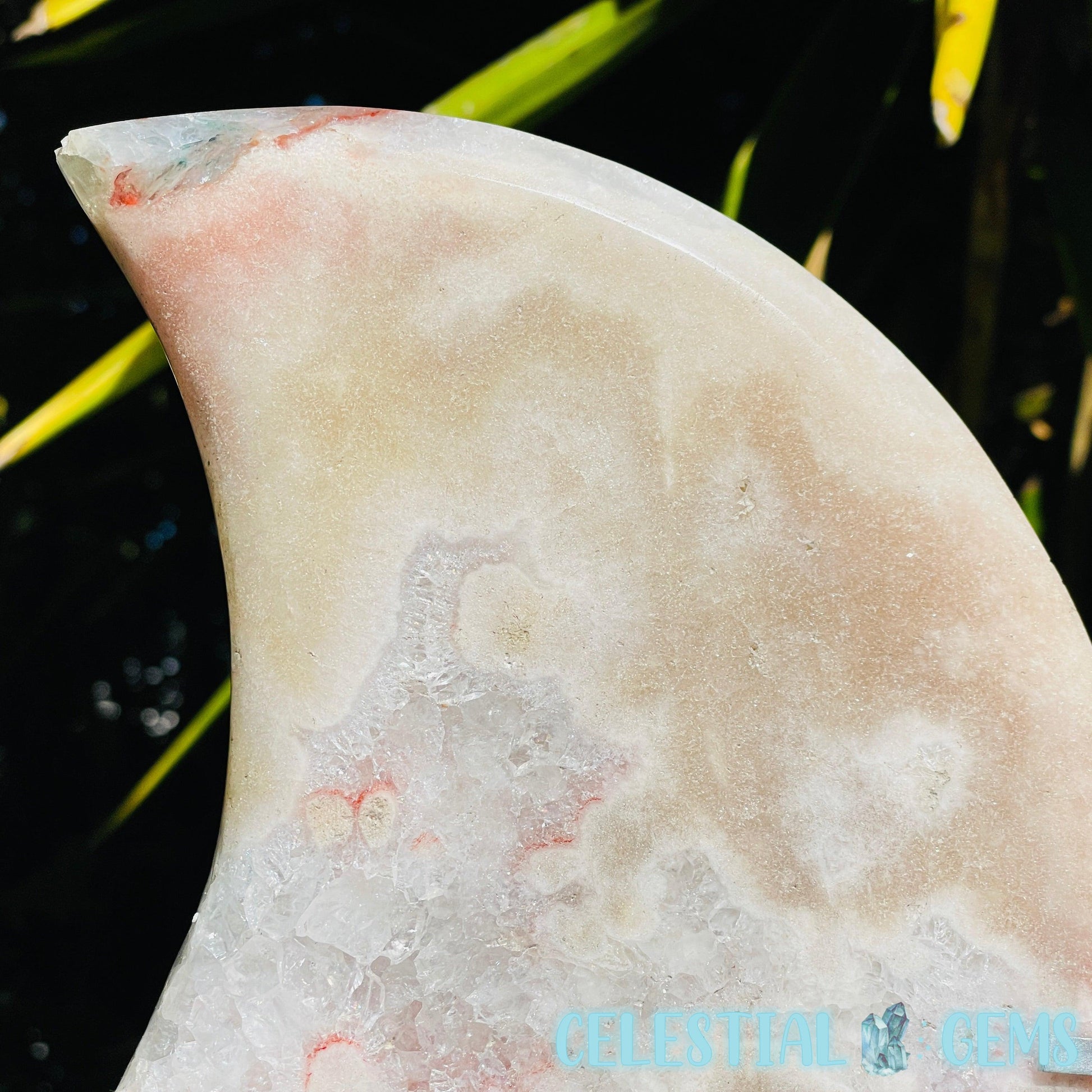 An extra large carving of a splendid crescent moon, carved from uncommon Pink Amethyst with areas of flashy crystalline clear Quartz with rainbow flashes and some red Hematite inclusions.