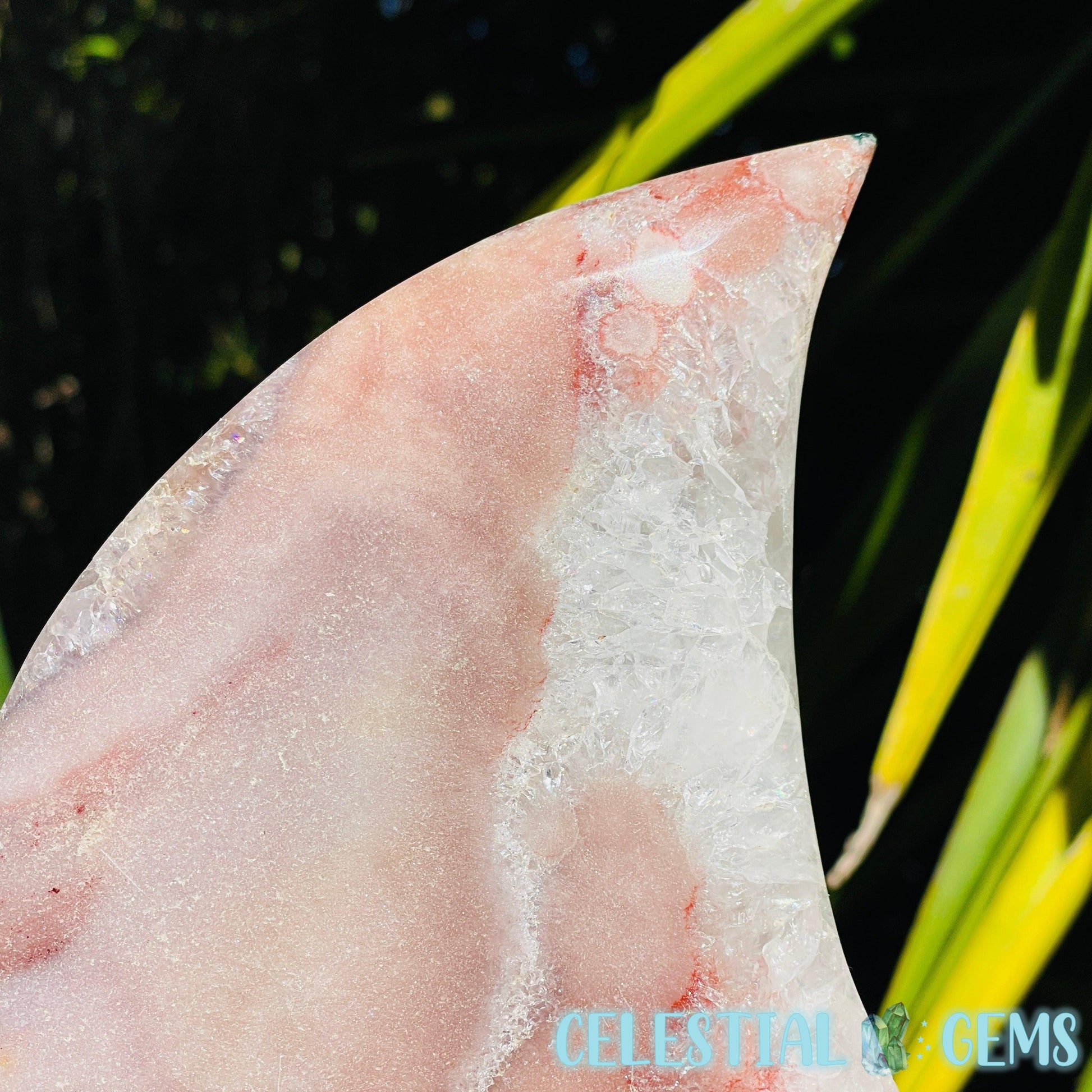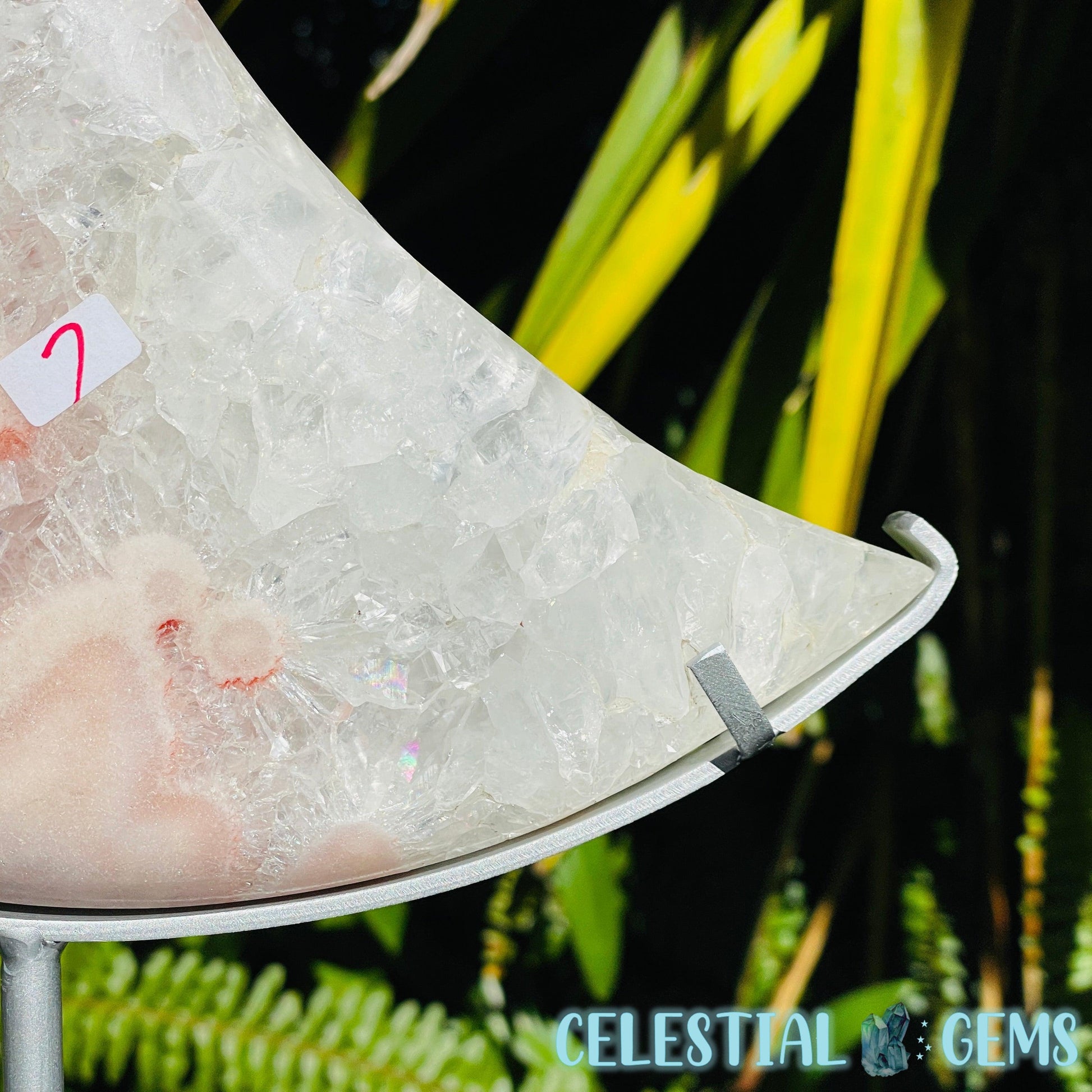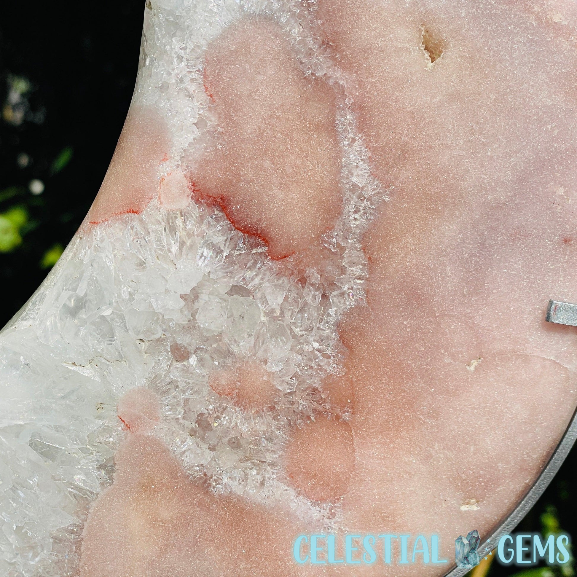 An extra large carving of a splendid crescent moon, carved from uncommon Pink Amethyst with areas of flashy crystalline clear Quartz with rainbow flashes and some red Hematite inclusions.