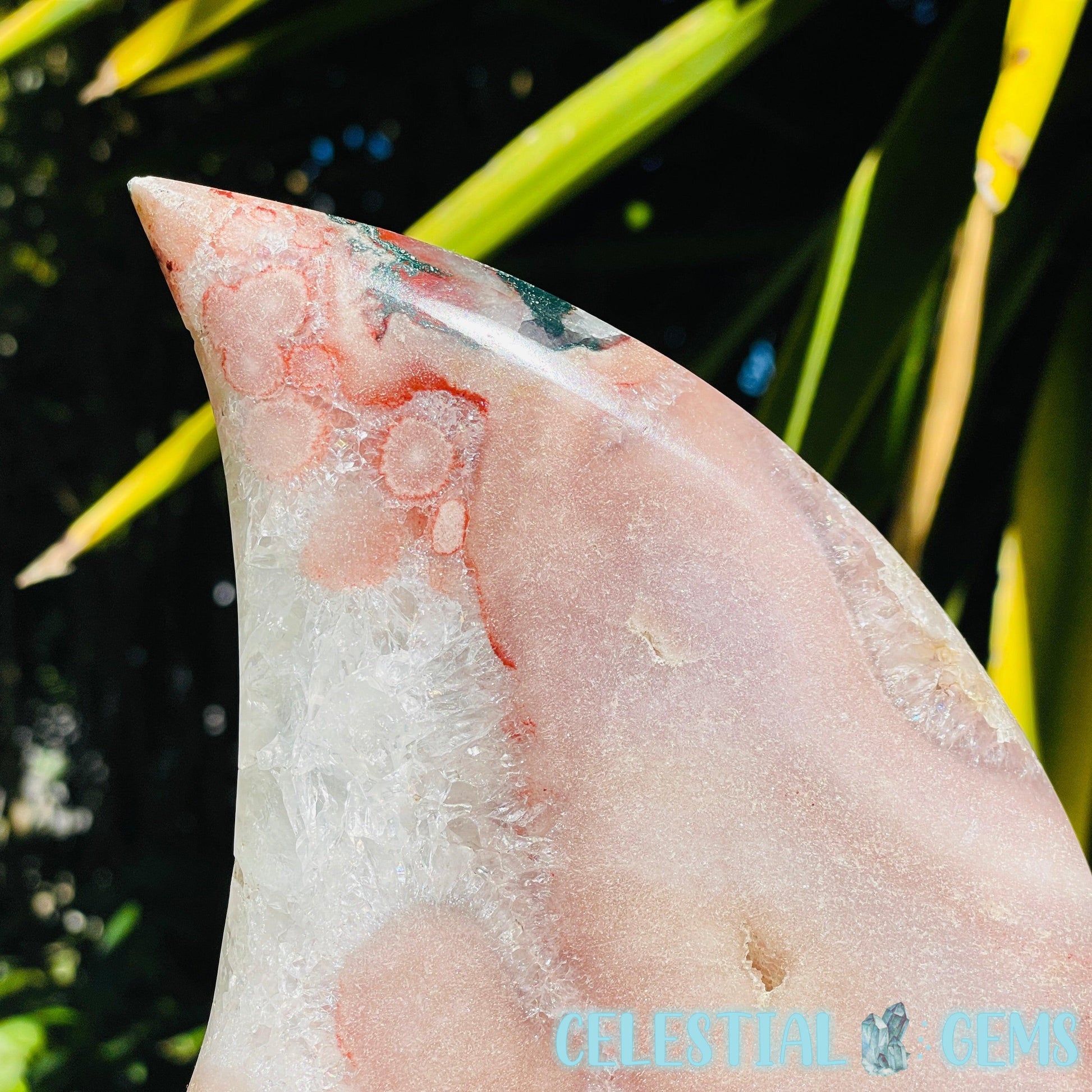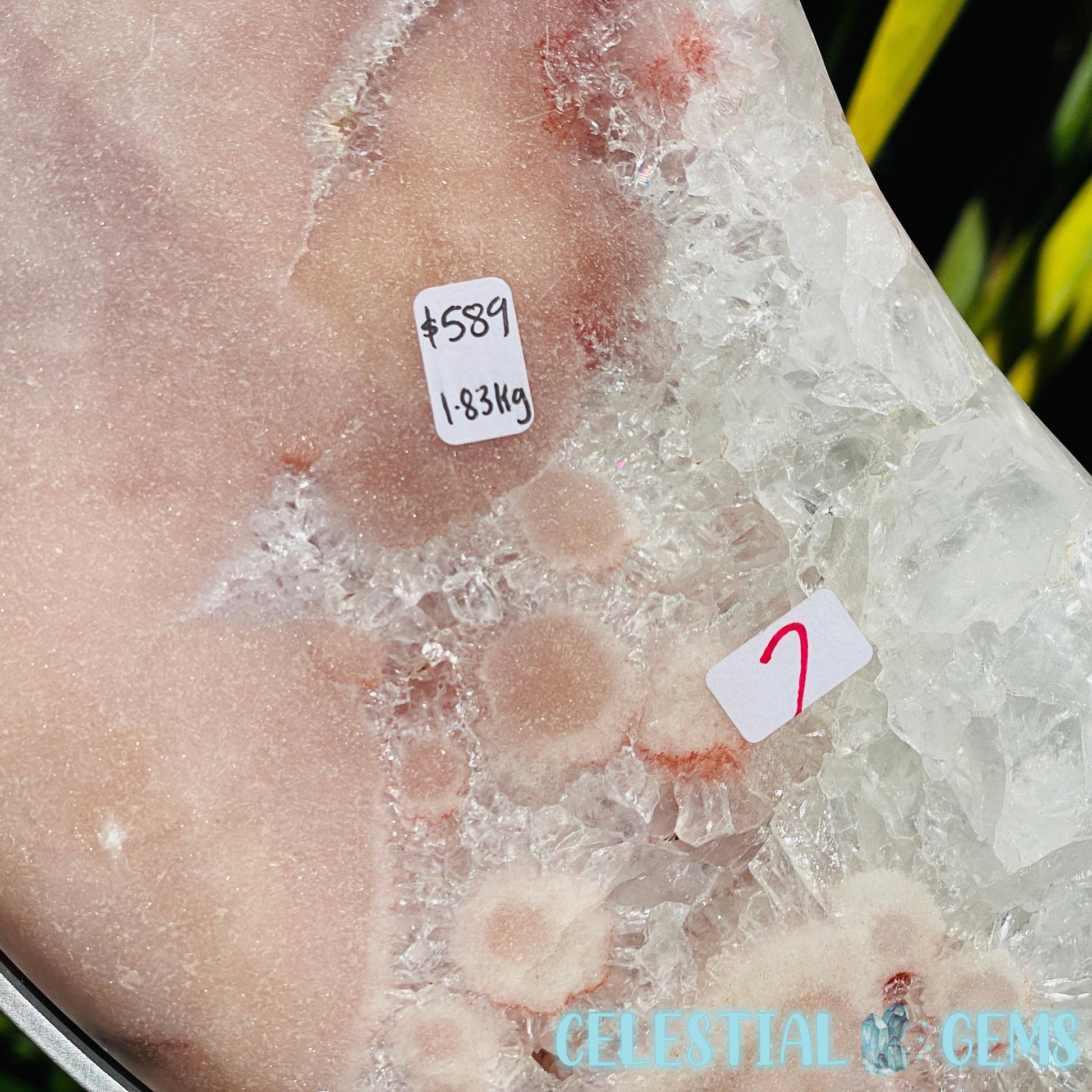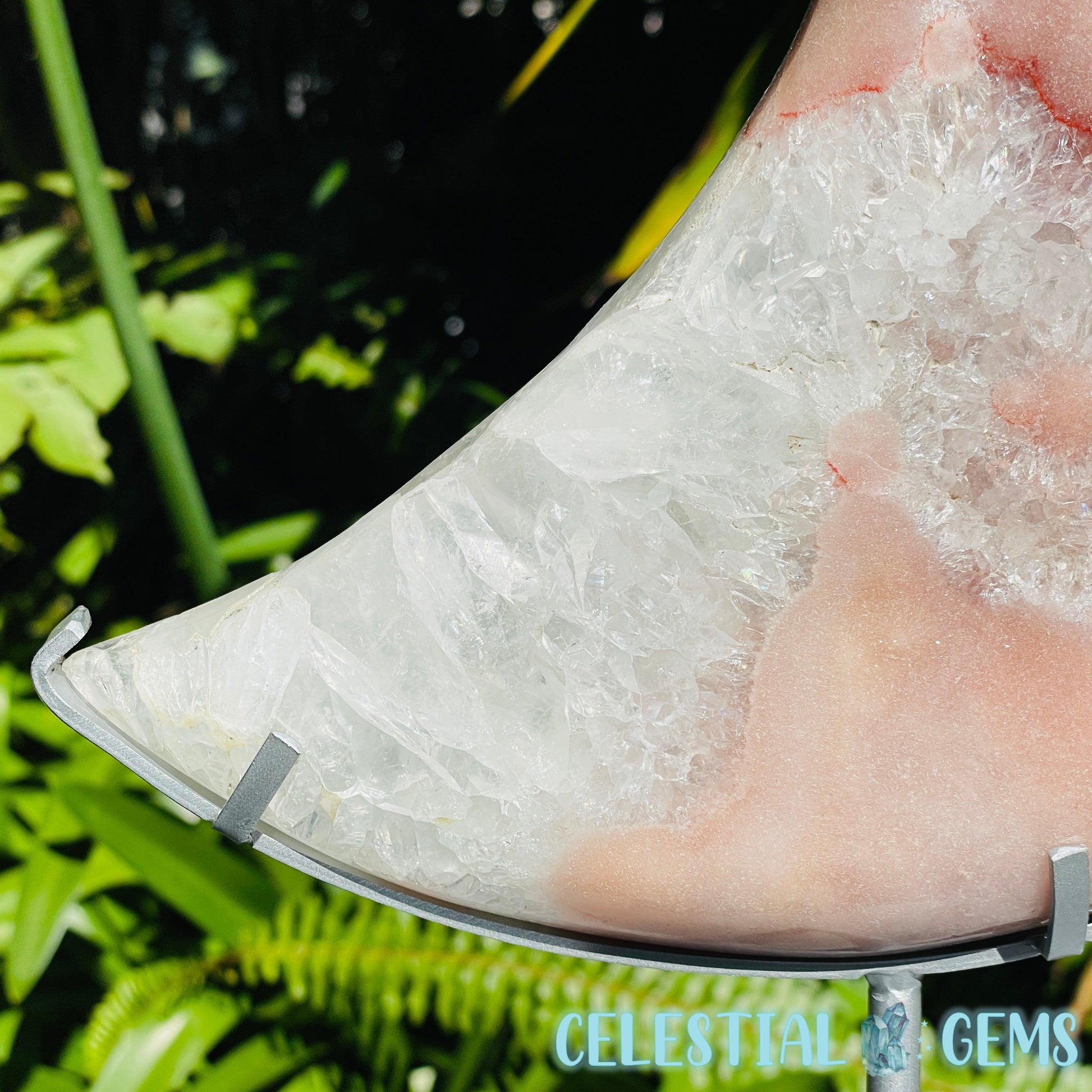 An extra large carving of a splendid crescent moon, carved from uncommon Pink Amethyst with areas of flashy crystalline clear Quartz with rainbow flashes and some red Hematite inclusions.