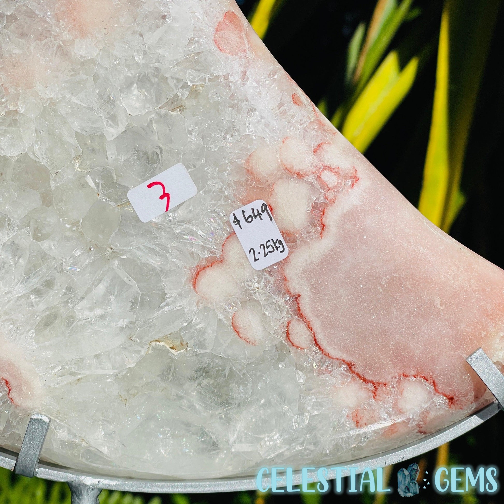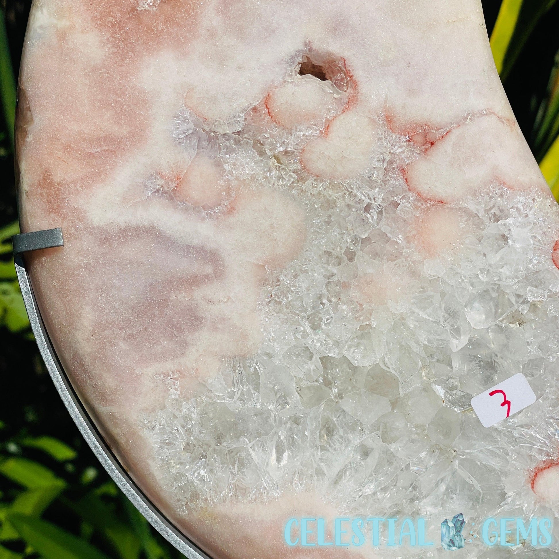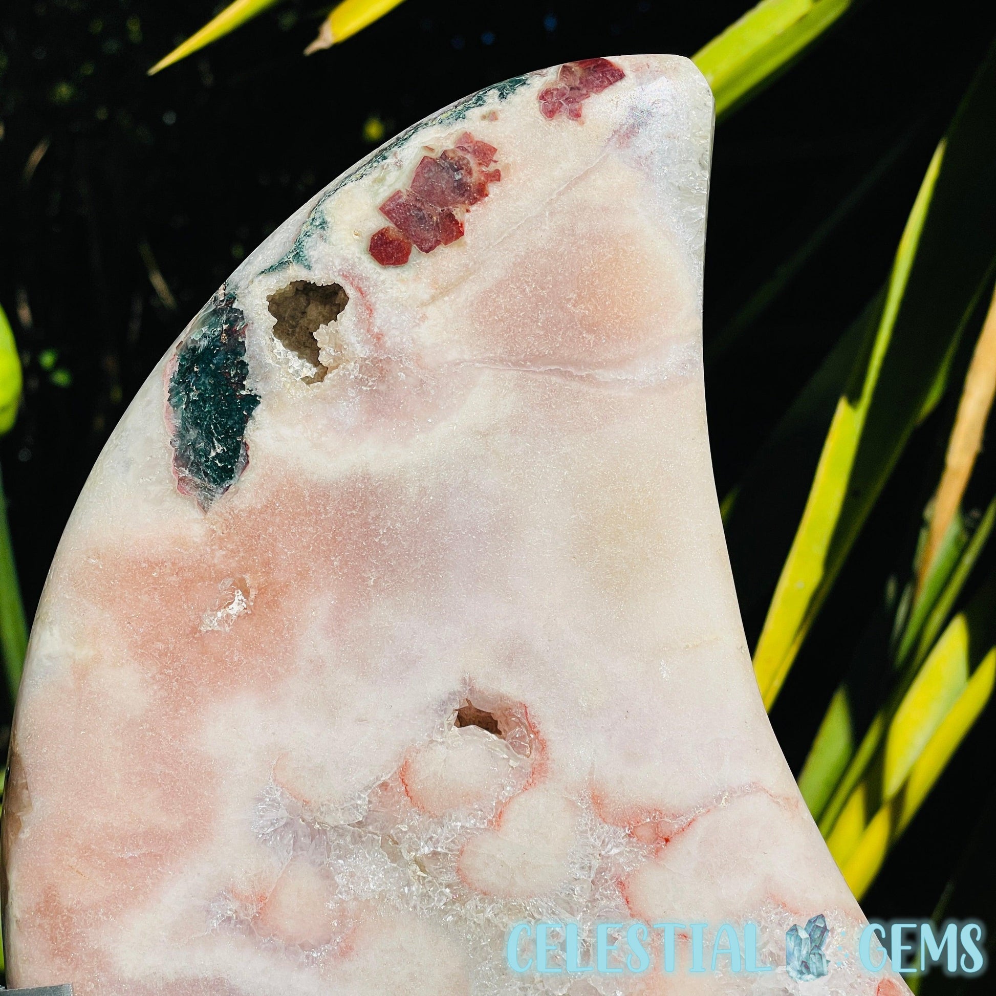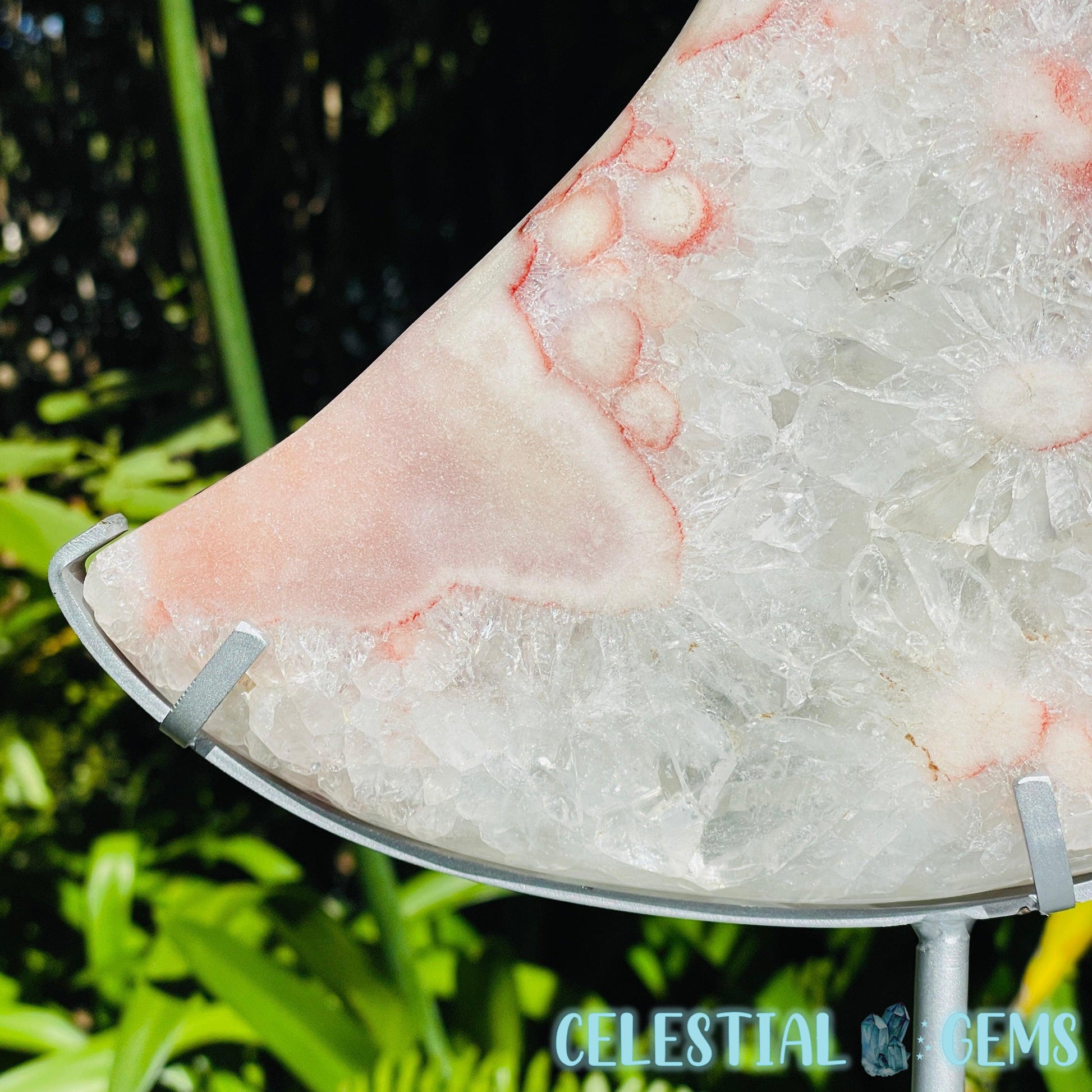 An extra large carving of a splendid crescent moon, carved from uncommon Pink Amethyst with areas of flashy crystalline clear Quartz with rainbow flashes and some red Hematite inclusions.