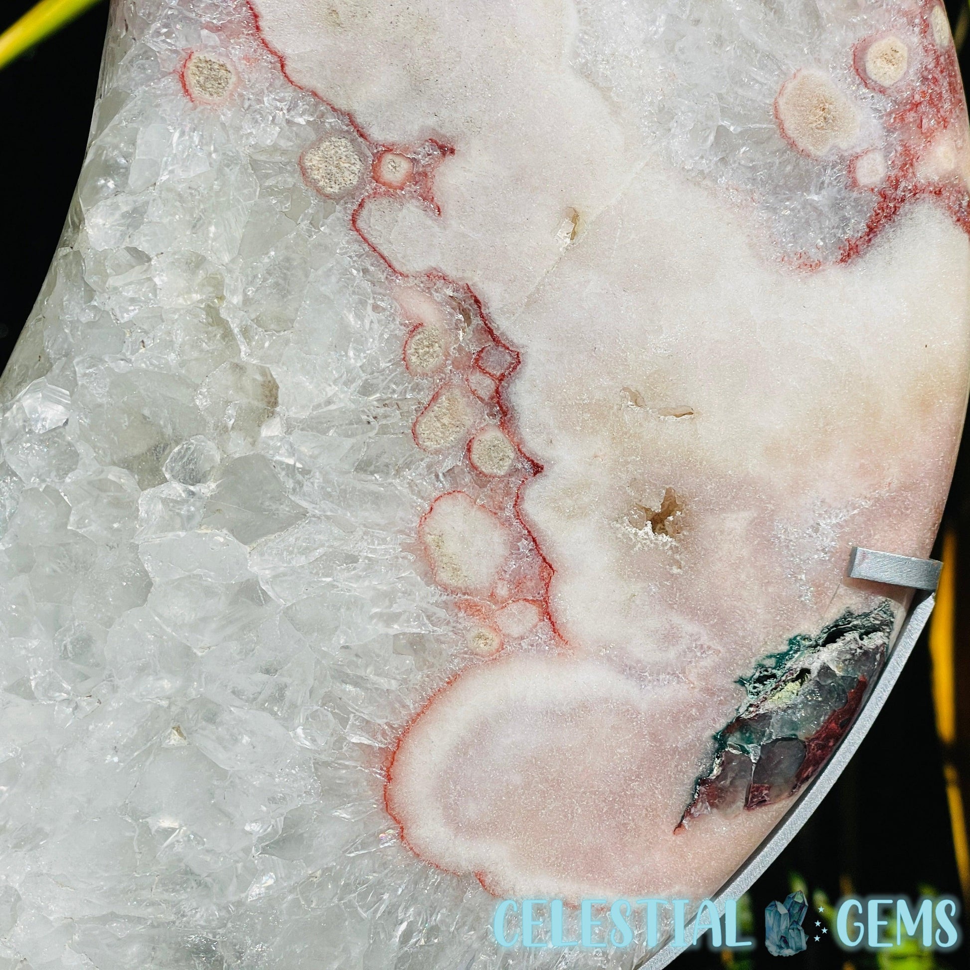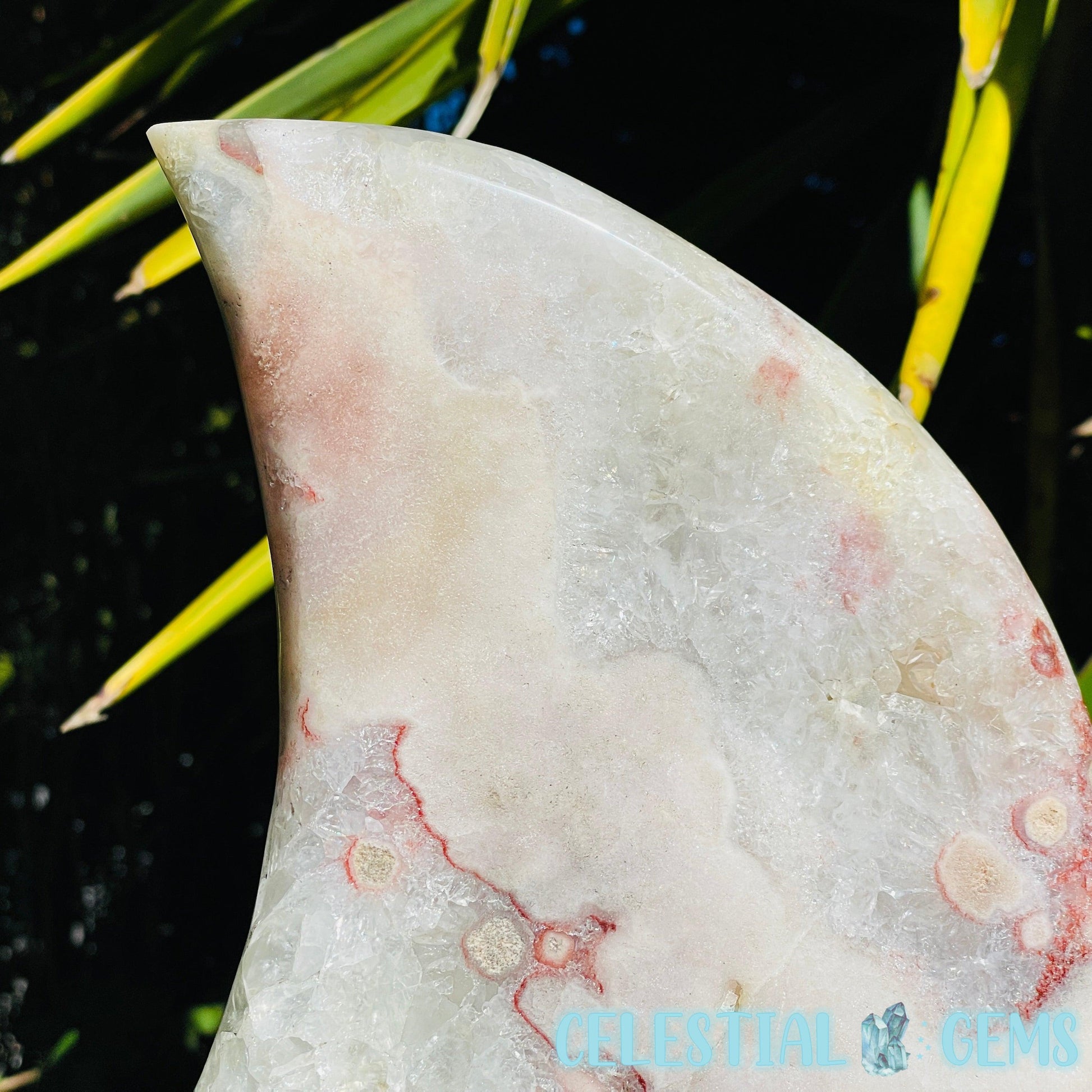 An extra large carving of a splendid crescent moon, carved from uncommon Pink Amethyst with areas of flashy crystalline clear Quartz with rainbow flashes and some red Hematite inclusions.