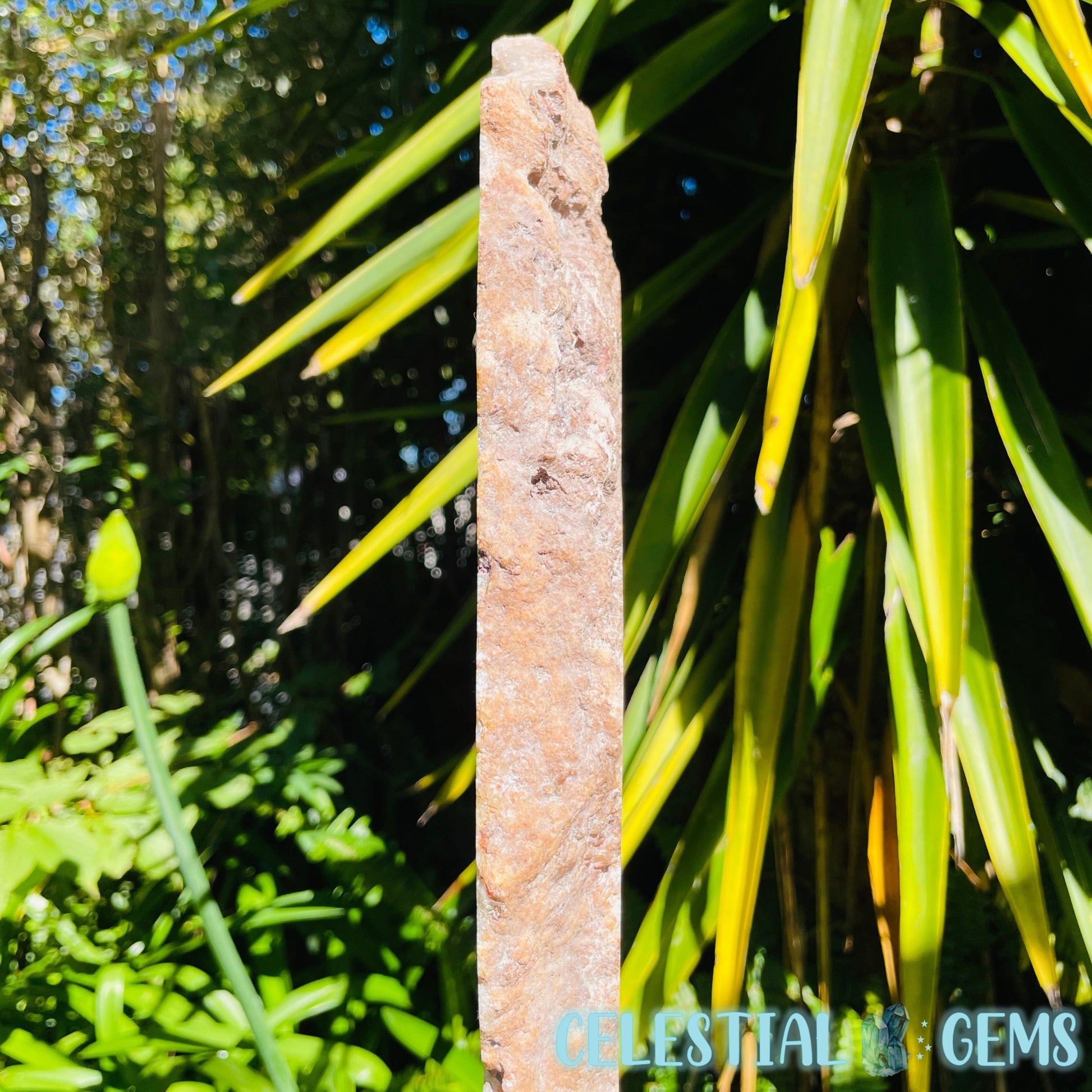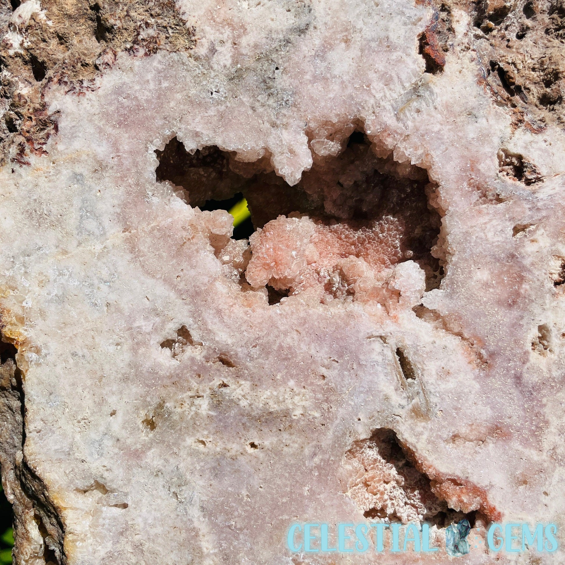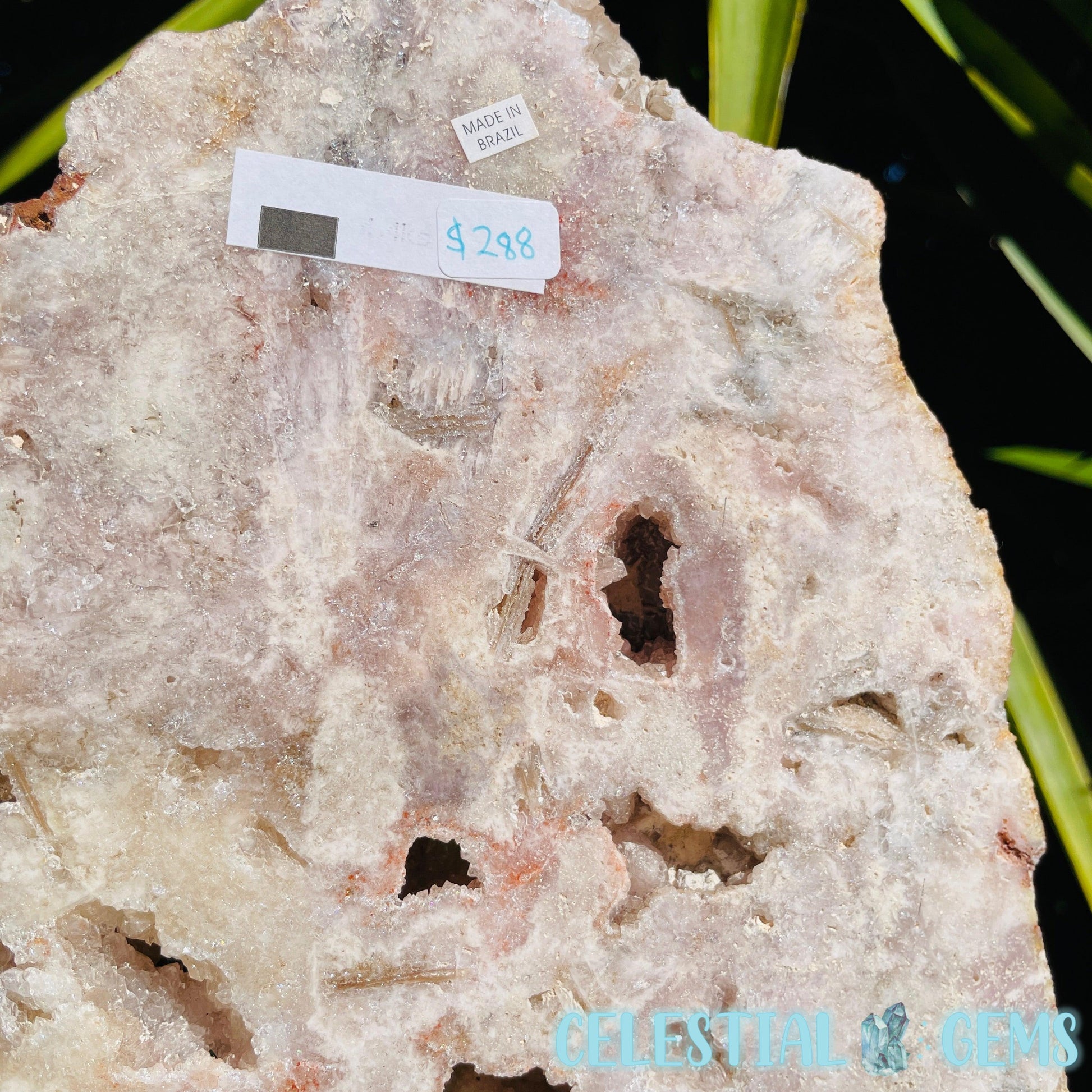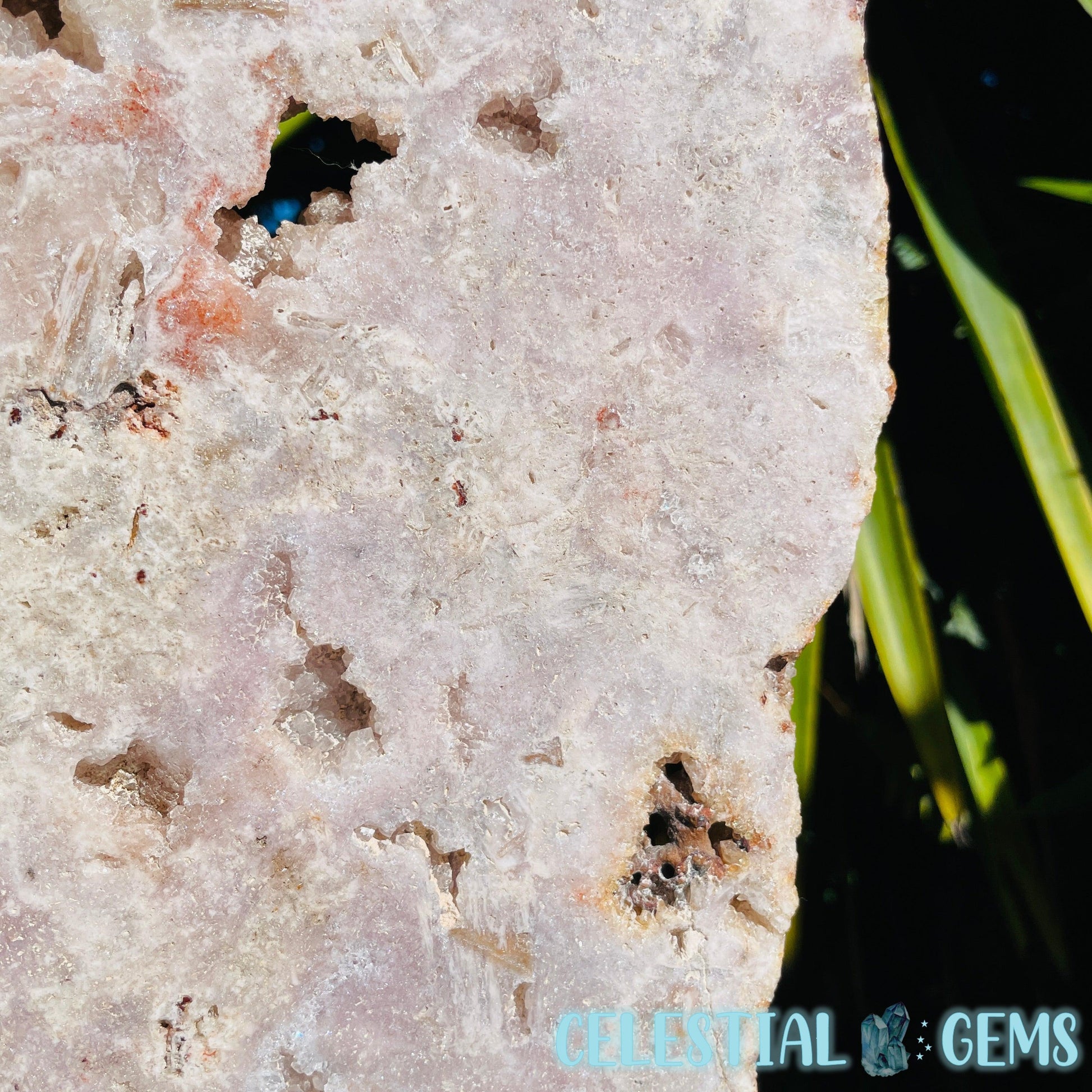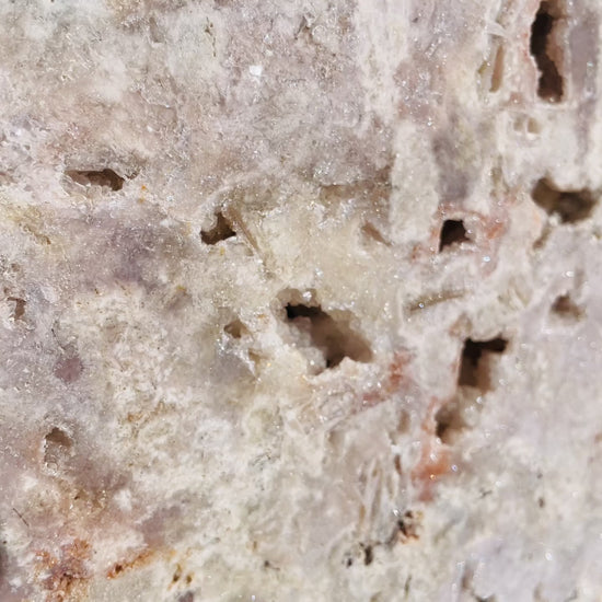 A huge slice of semi-polished, sparkly Pink Amethyst with druzy pockets on a custom metal stand.