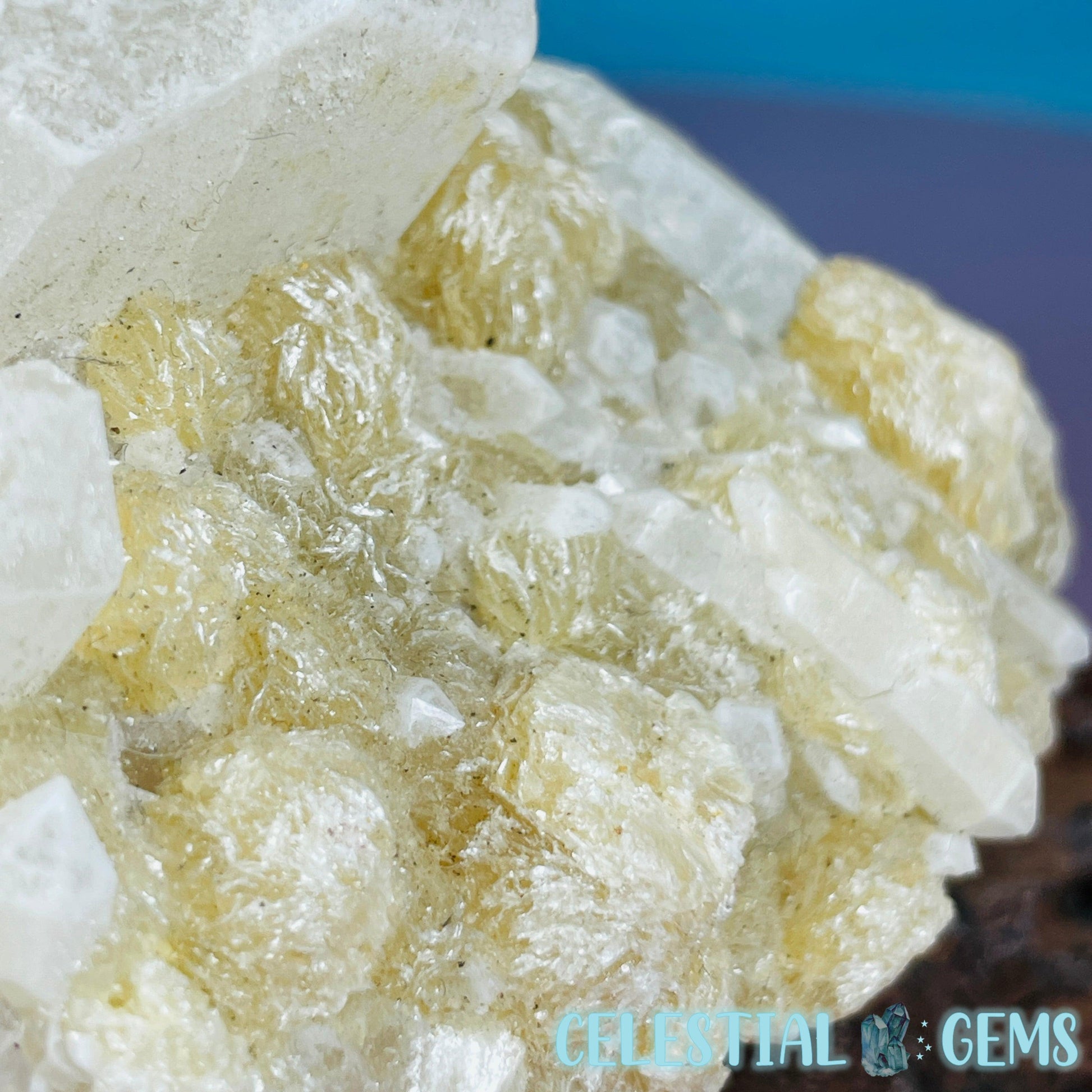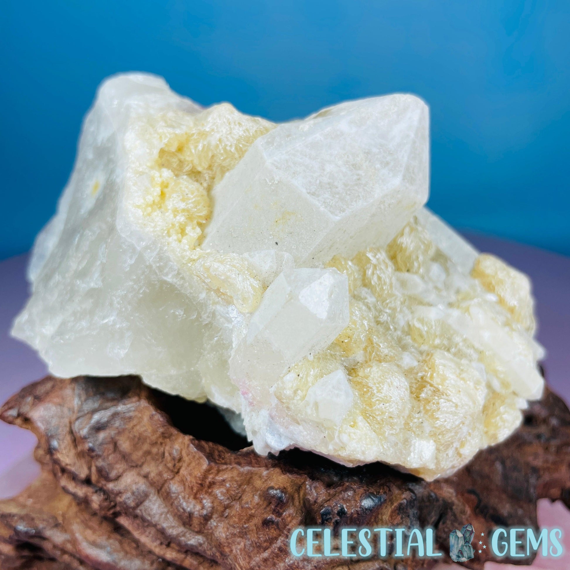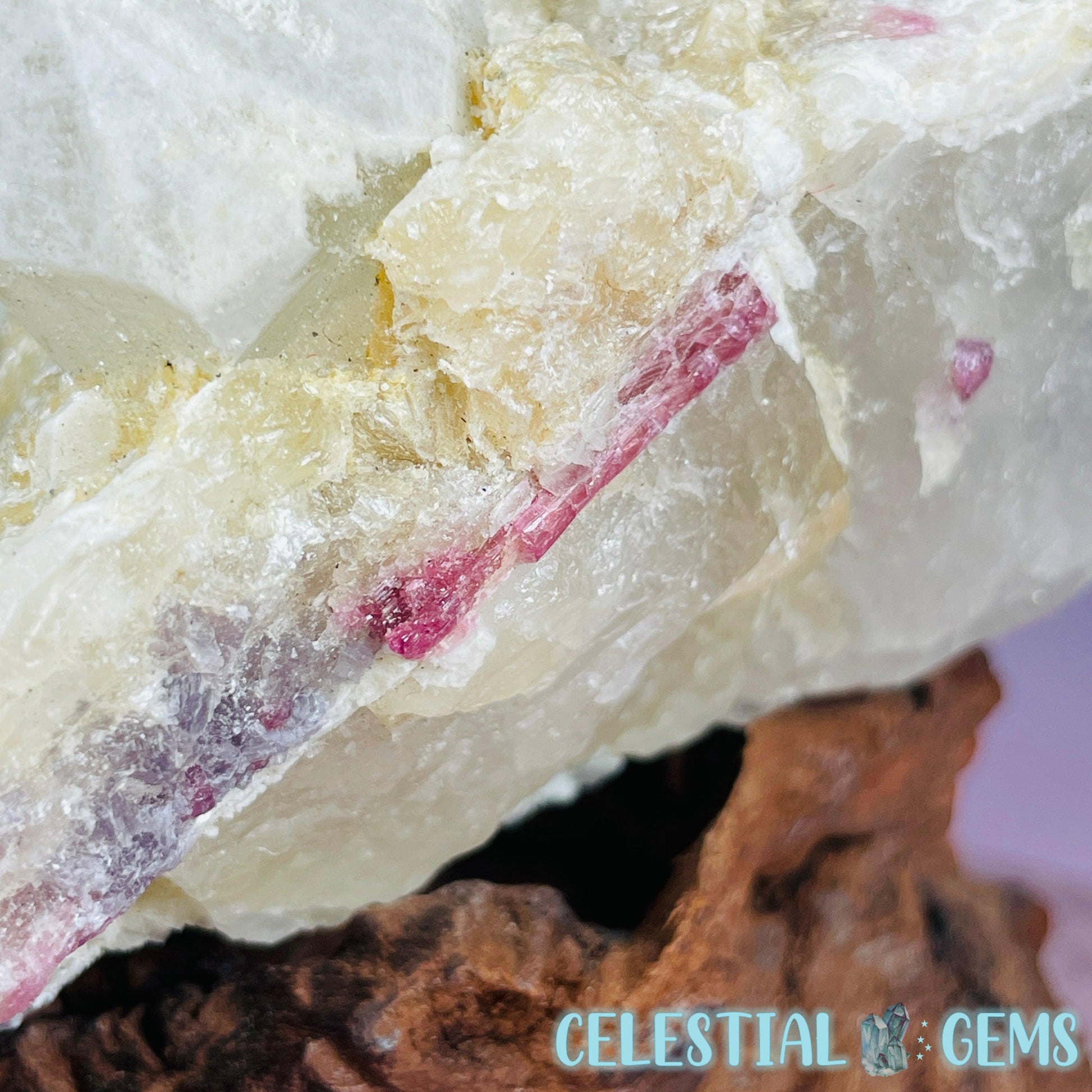 A raw pegmatite chunk of Pink (Rubellite) Tourmaline with Purple (Lepidolite) Mica on a cluster of Quartz with Golden (Muscovite) Mica rosette formations.