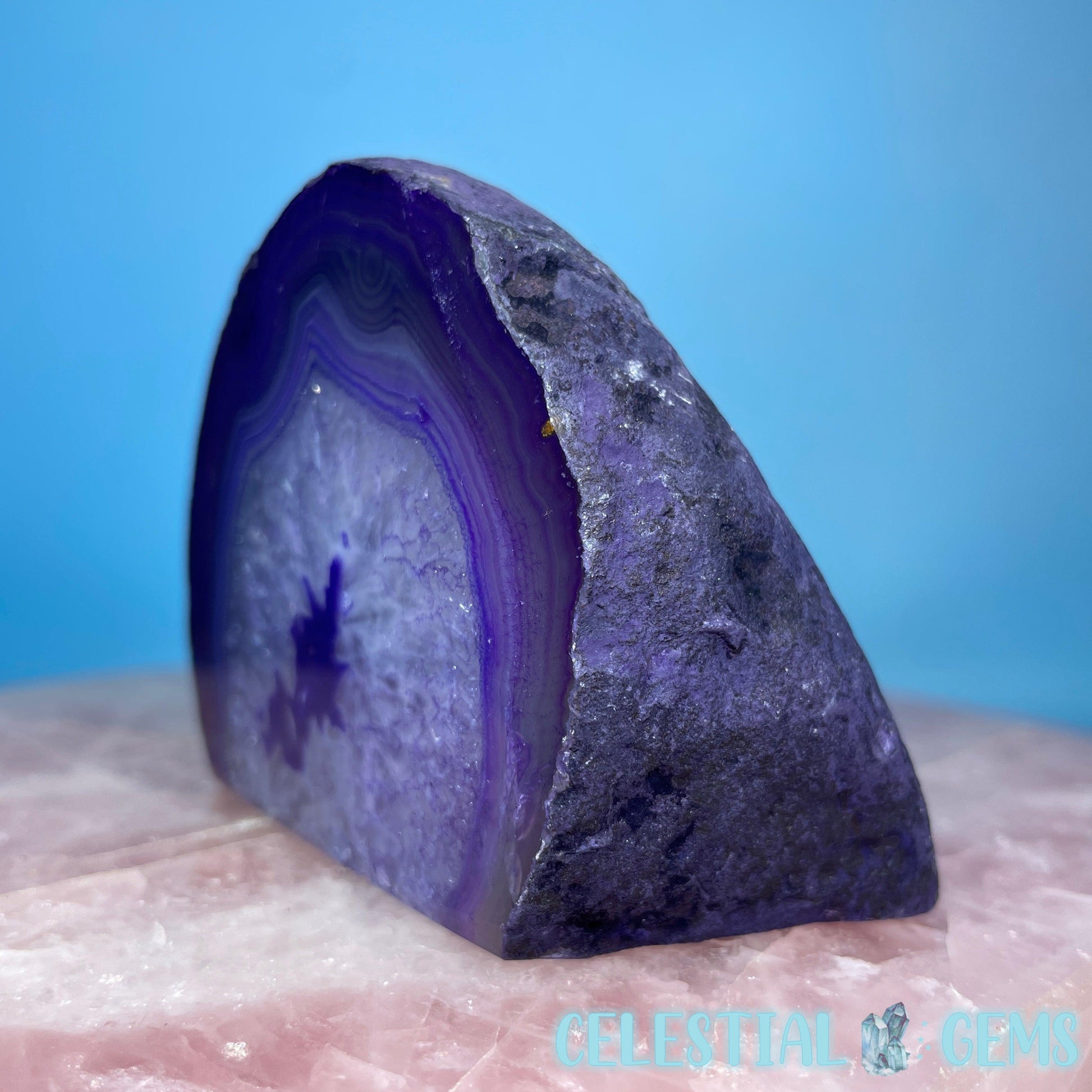 A crystallized Agate geode that is cut flat with a polished face and raw rock on the rear. Dyed purple. Lovely sparkles in the Agate crystallization and beautiful banded layers. Approx. 7.2cm x 6.5cm x 4cm.