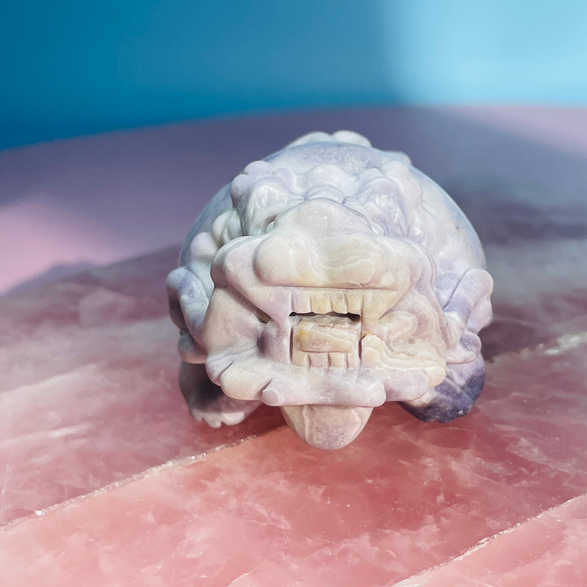 A mixed white and Purple 'Root' Fluorite carving of a Pixiu - a mythological creature from ancient Chinese culture which depicts the head of a dragon and the body of a frog (sometimes a lion). The Pixiu is a symbol of luck, fortune and is a protector of souls and the way of feng shui.
