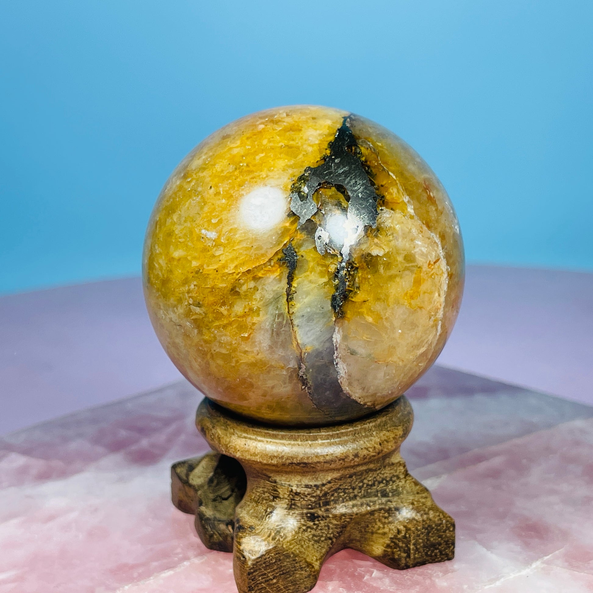 A gorgeous piece of Pyrite growing inside of Golden Healer Quartz. This combination is known as 'Lion's Head' Quartz. Approx. 4.9cm diameter. Stand sold separately.