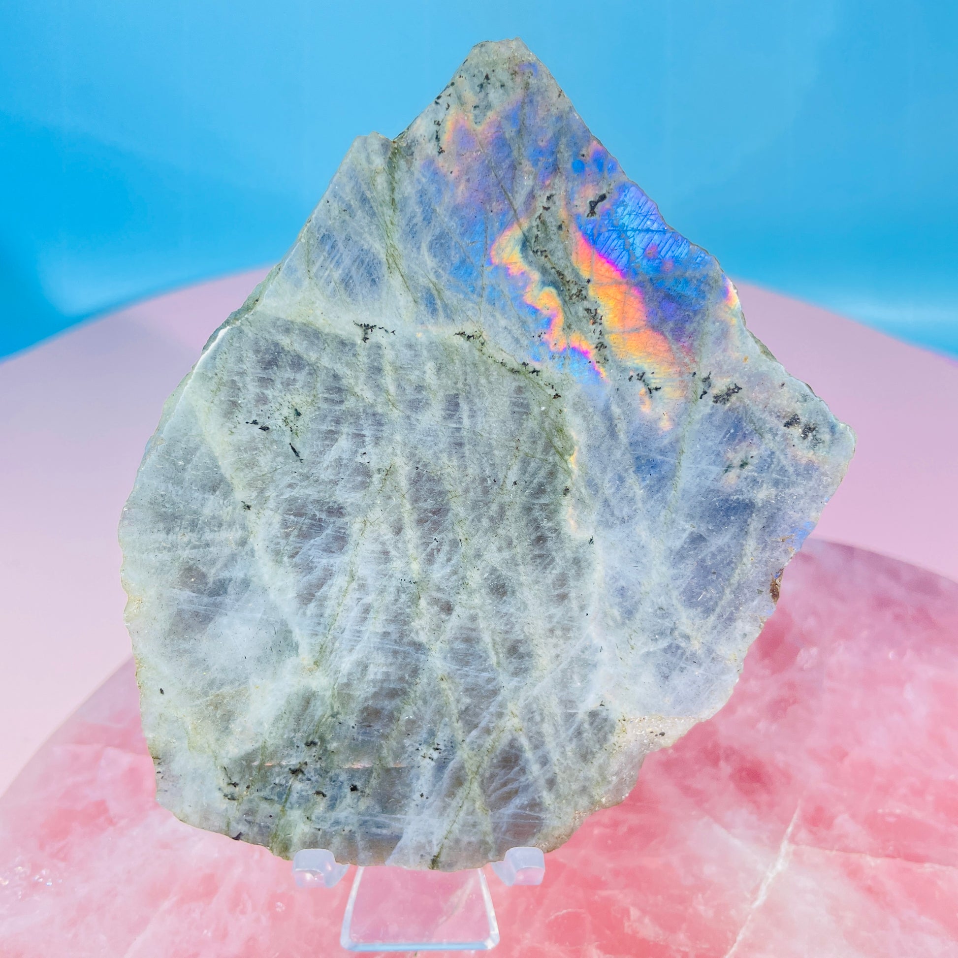 A small semi-polished slab of rainbow Labradorite. With a raw natural face on the rear.