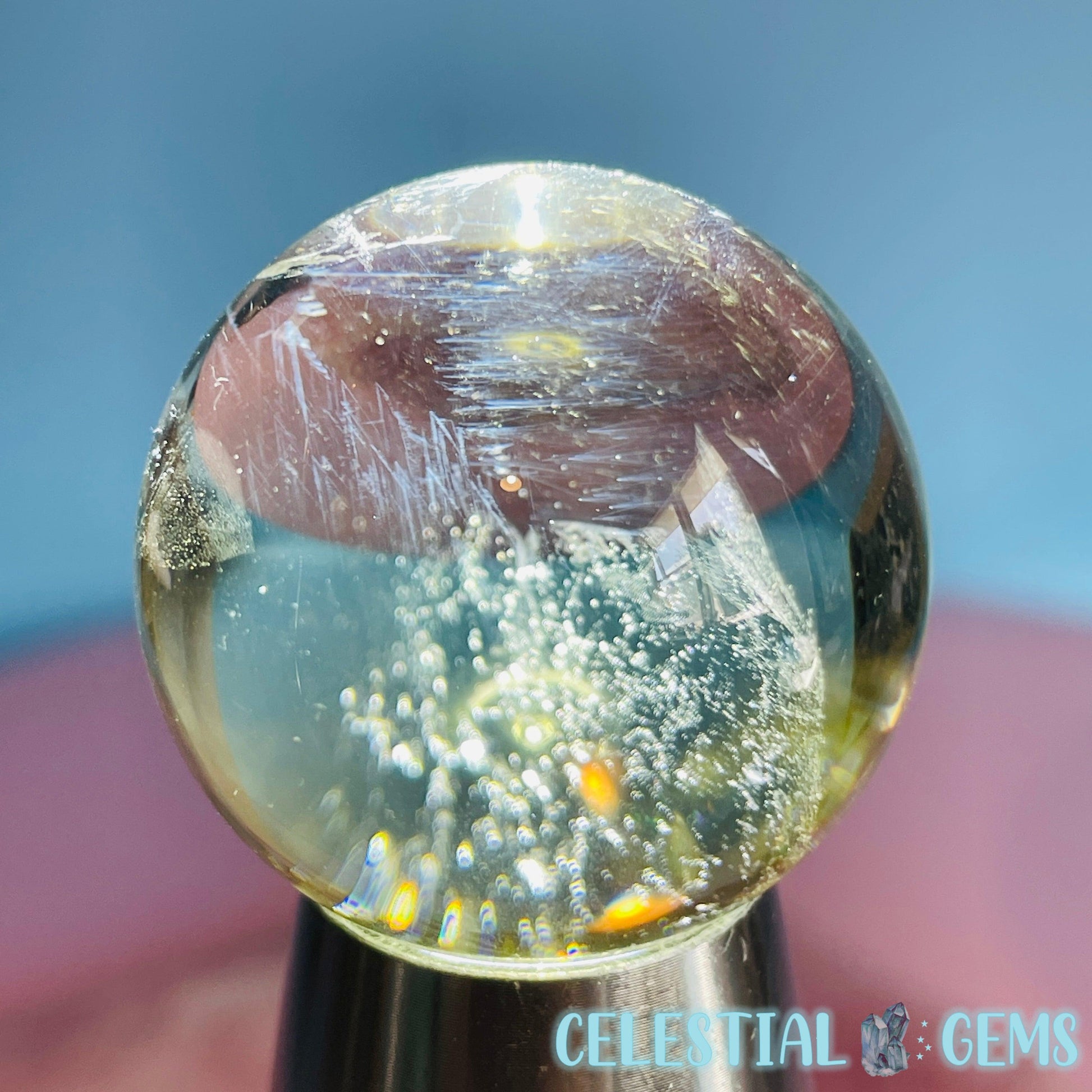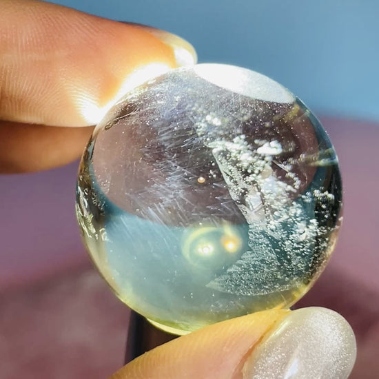 This is an extremely rare inclusion sphere of Brazilian Citrine with 'blue needle' inclusions of Dumortierite crystals. Sometimes known as 'Blue Angel Feather', this material forms sprays of needle crystals only visible with a light.