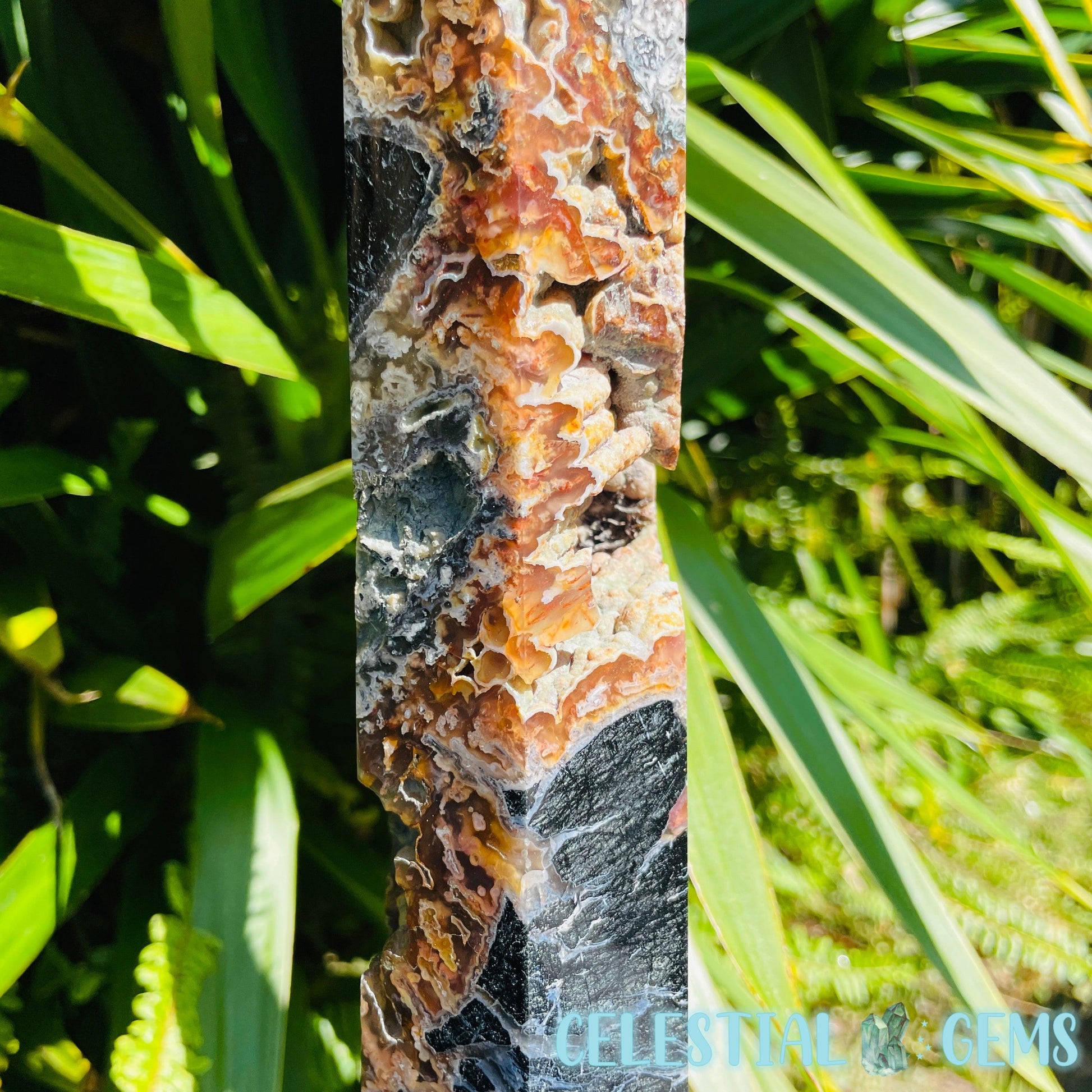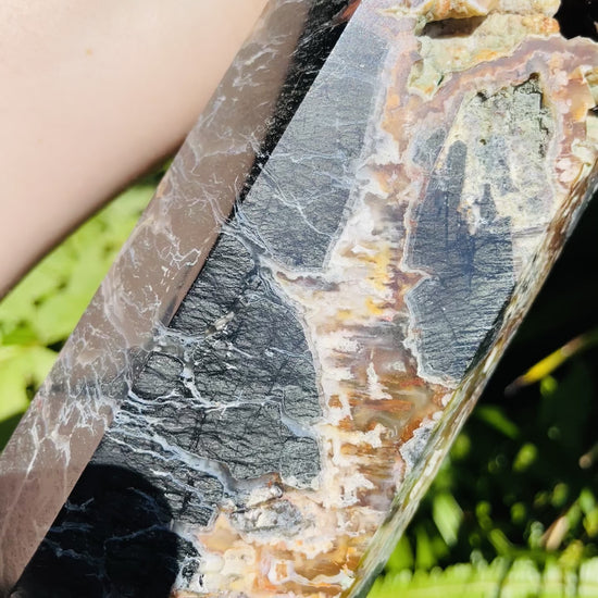 This is a very special tower, one of two carved from this piece of rare Tube Agate with incredible blooming inclusions and open pockets showing 'tube' stalactite growth. Also includes areas of black Basalt. This piece has multiple areas of UV reactive Agate which will glow when exposed to a UV light.