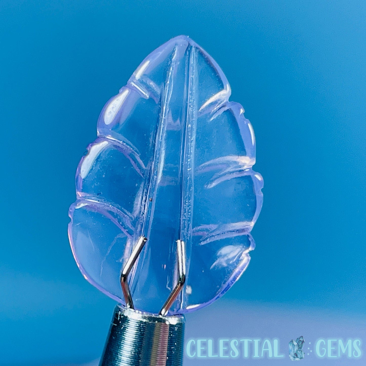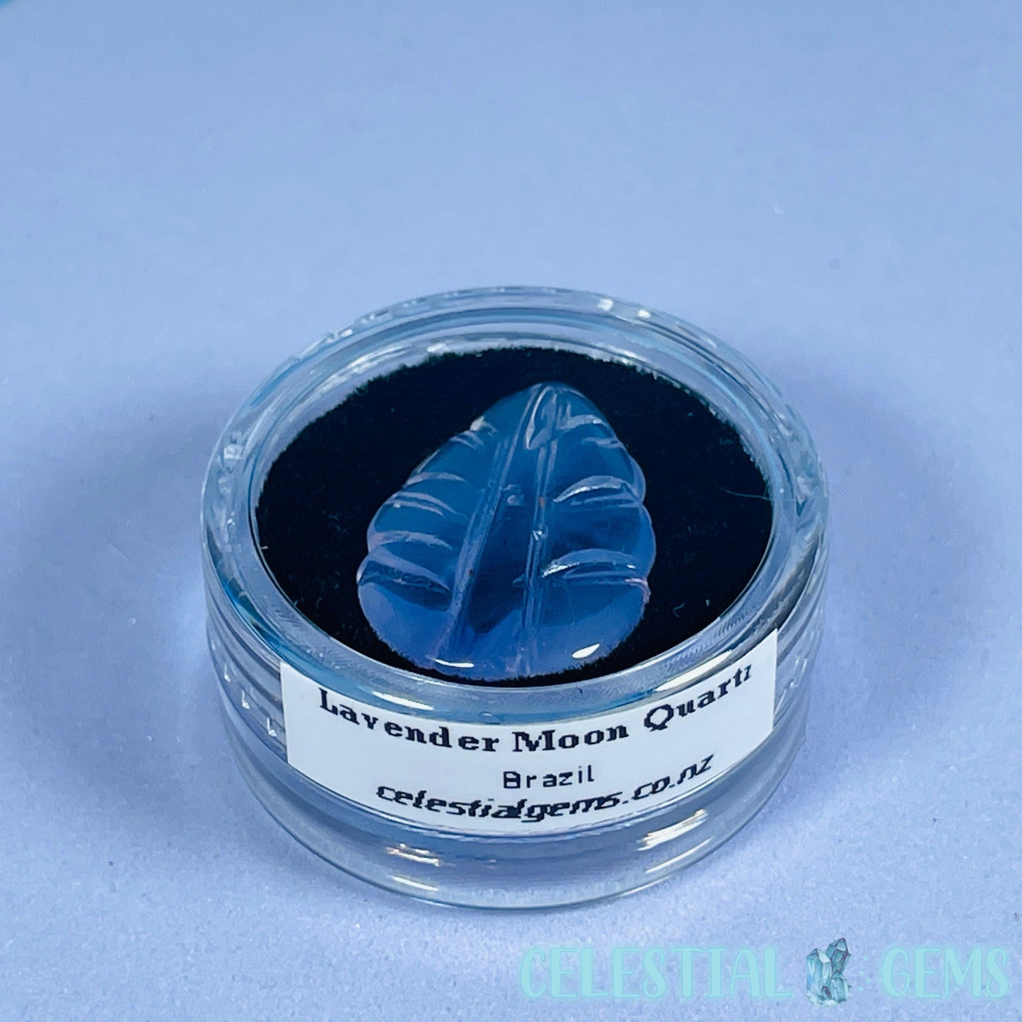 Rare Lavender Moon Quartz, a Lithium inclusive Quartz with excellent pink/purple colour, polished and handcarved into a lush leaf design. Comes in a plastic display specimen pottle with a velvet sponge base. Sourced from Brazil.