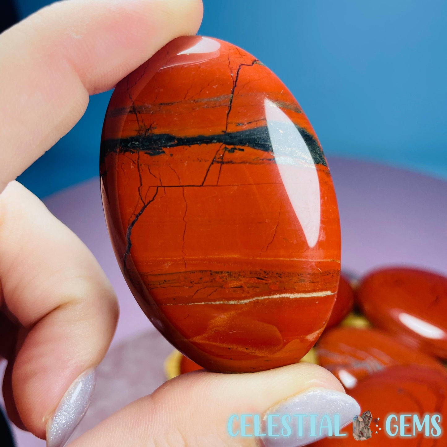 A polished palmstone of Red Jasper. May contain trace amounts of Quartz, Agate and/or Pyrite. One will be chosen randomly for you. Sold individually. Approx. 5.7cm x 3.7cm x 1.6cm each.