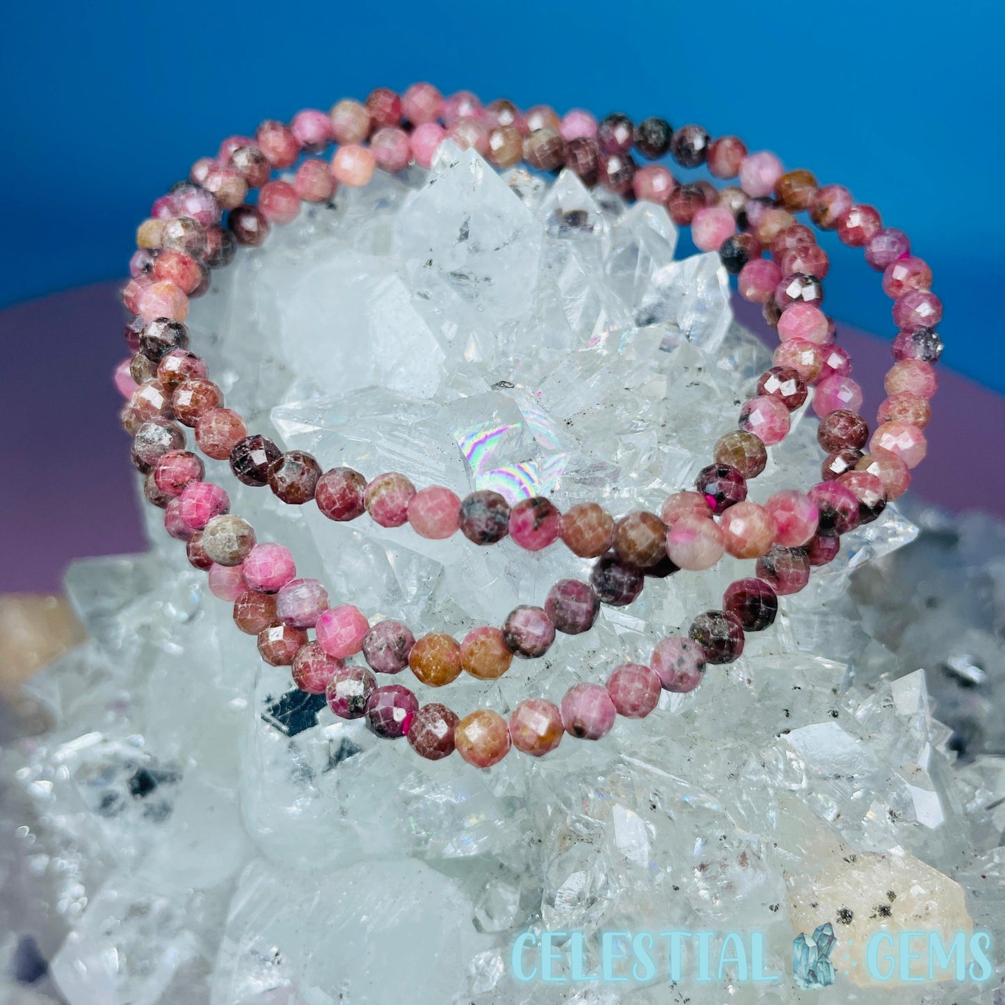 Elasticated with faceted 4mm beads of Rhodonite. Multiple bracelets pictured for effect only. This listing is for a single strand bracelet.