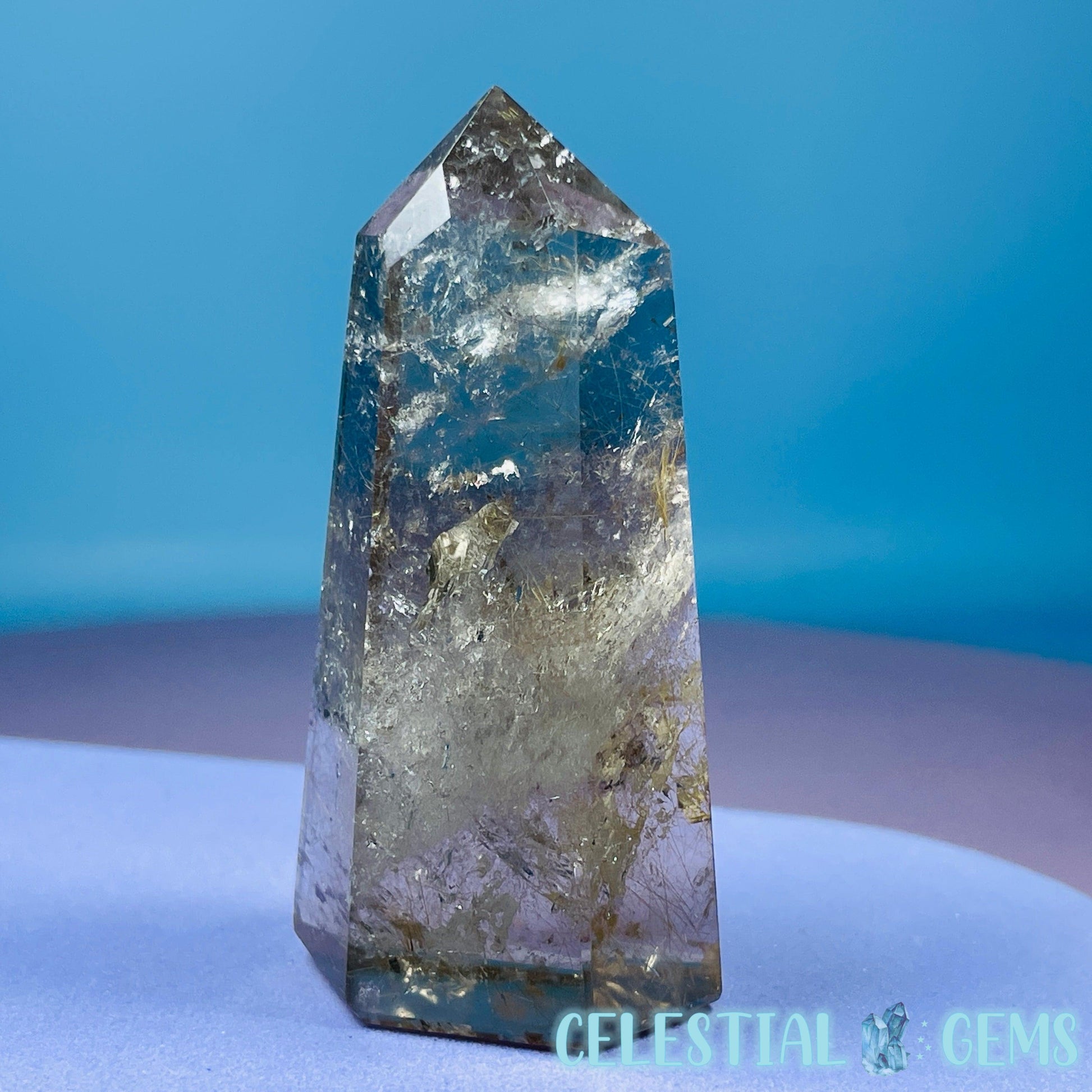 A stunning inclusion Smoky Quartz small tower containing Golden Rutile needle crystals which shine within.