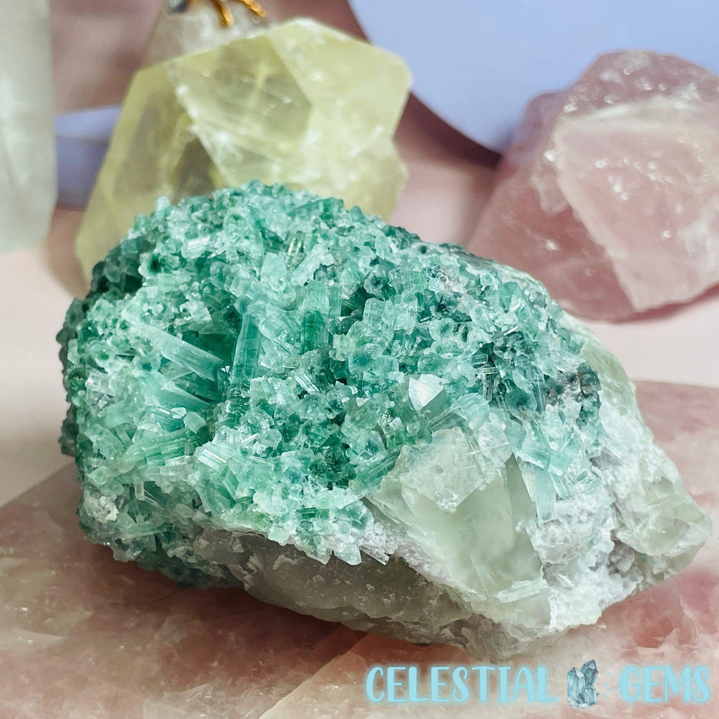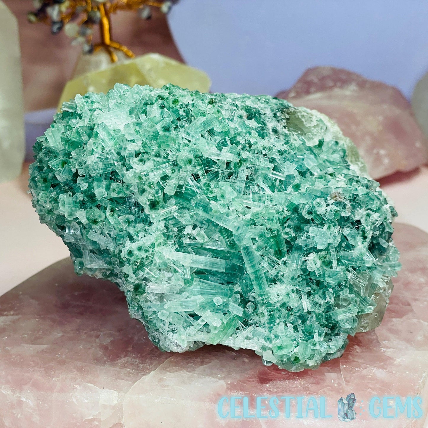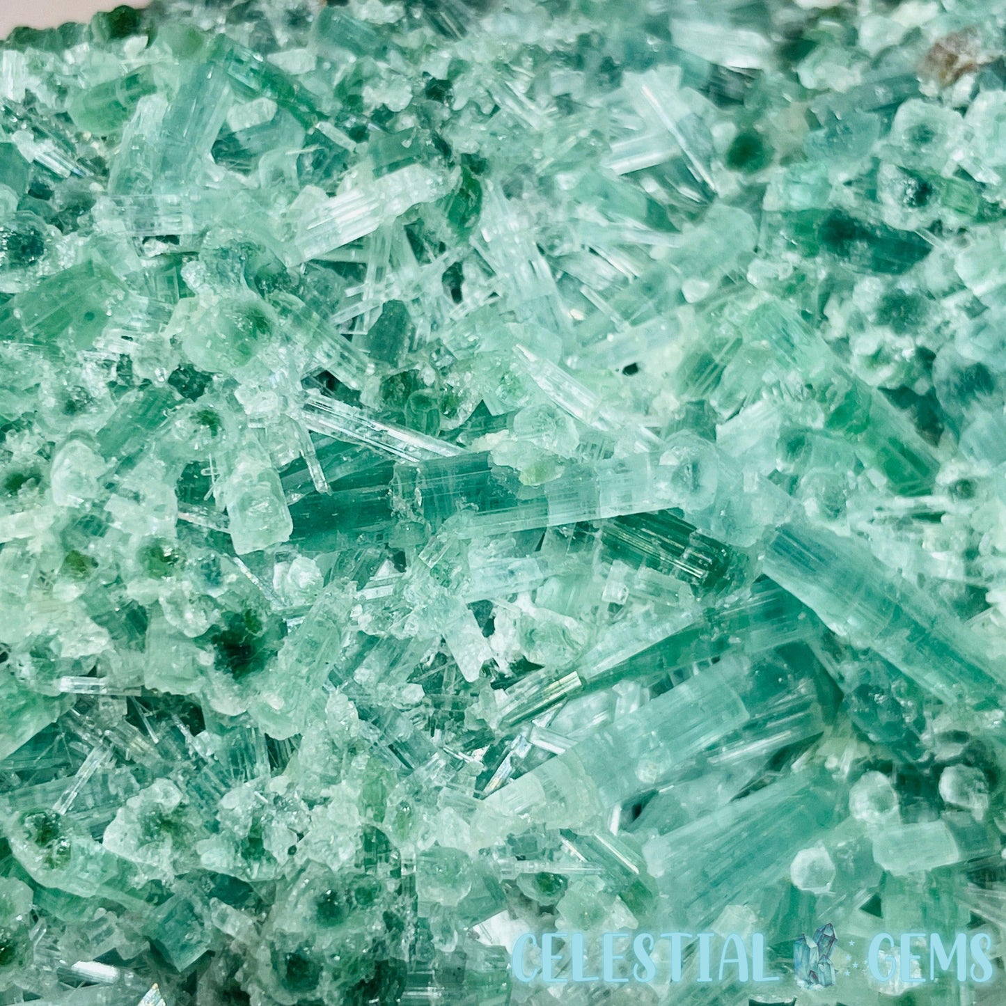 A stunning high grade example of a very rare cluster formation of Seafoam Green Verdilite Tourmaline with hundreds of crystal terminations, growing on Quartz and Mica matrix stone. This piece has been sourced from Skardu, Pakistan. Approx. 11.3cm x 9cm x 5.7cm. Weight 747g. A fantastic cabinet collector's piece.