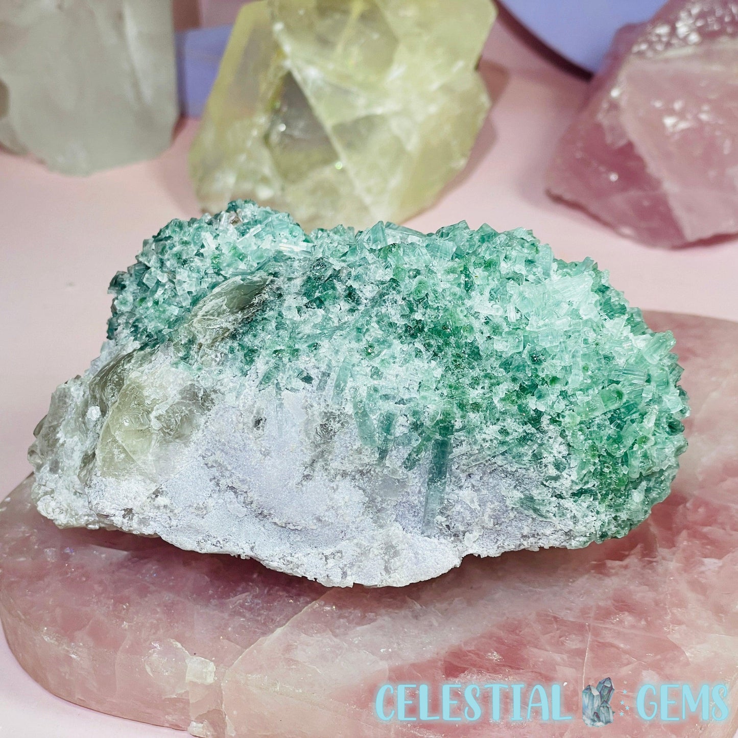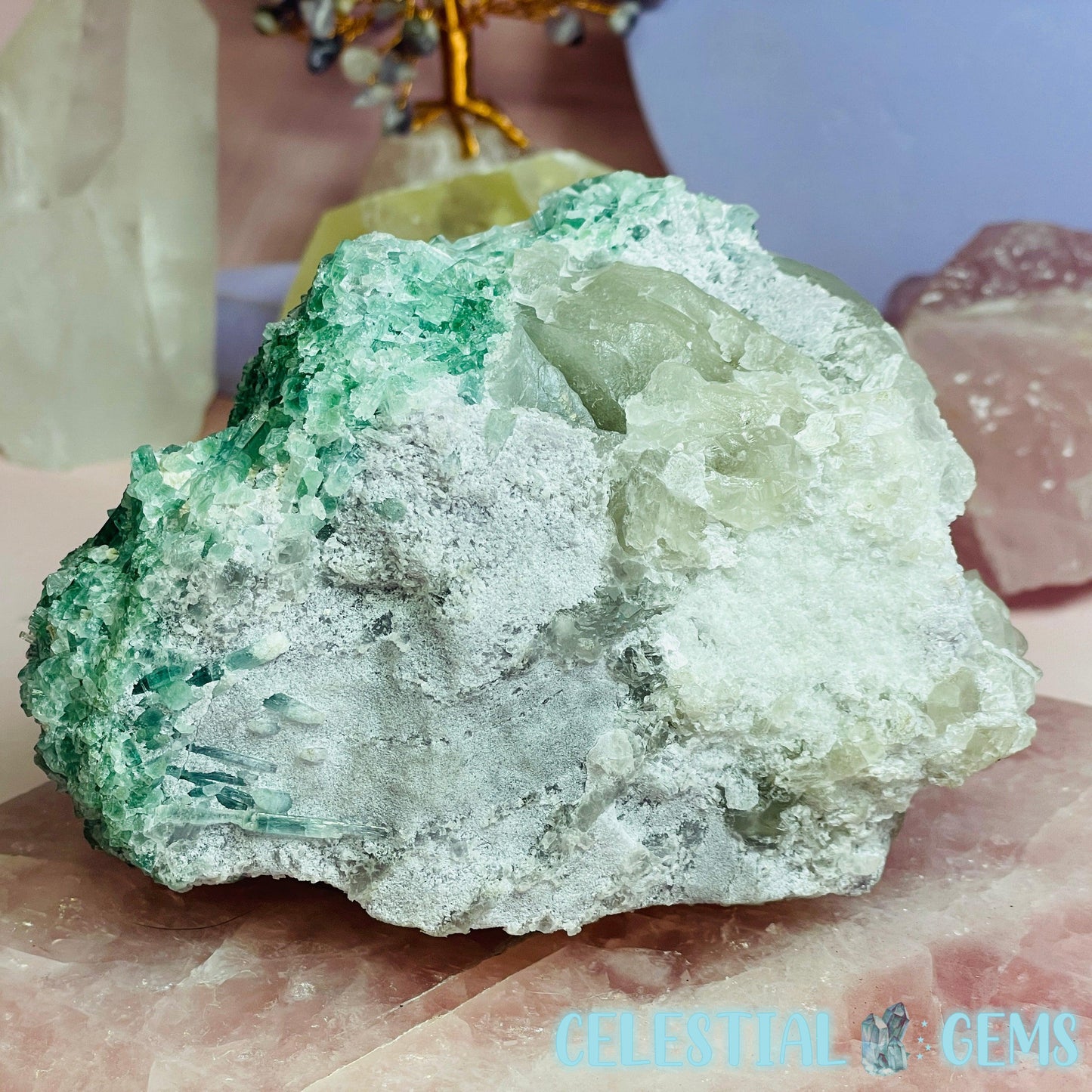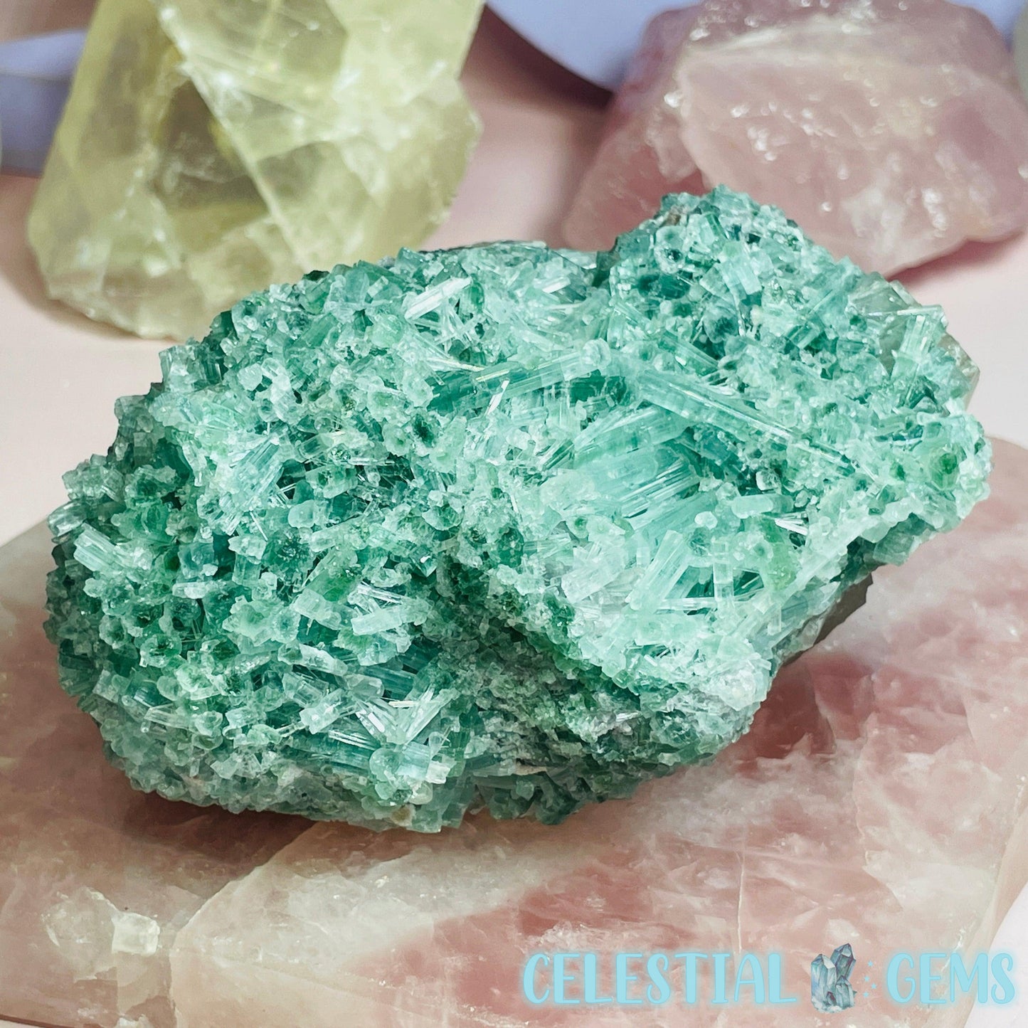 A stunning high grade example of a very rare cluster formation of Seafoam Green Verdilite Tourmaline with hundreds of crystal terminations, growing on Quartz and Mica matrix stone. This piece has been sourced from Skardu, Pakistan. Approx. 11.3cm x 9cm x 5.7cm. Weight 747g. A fantastic cabinet collector's piece.