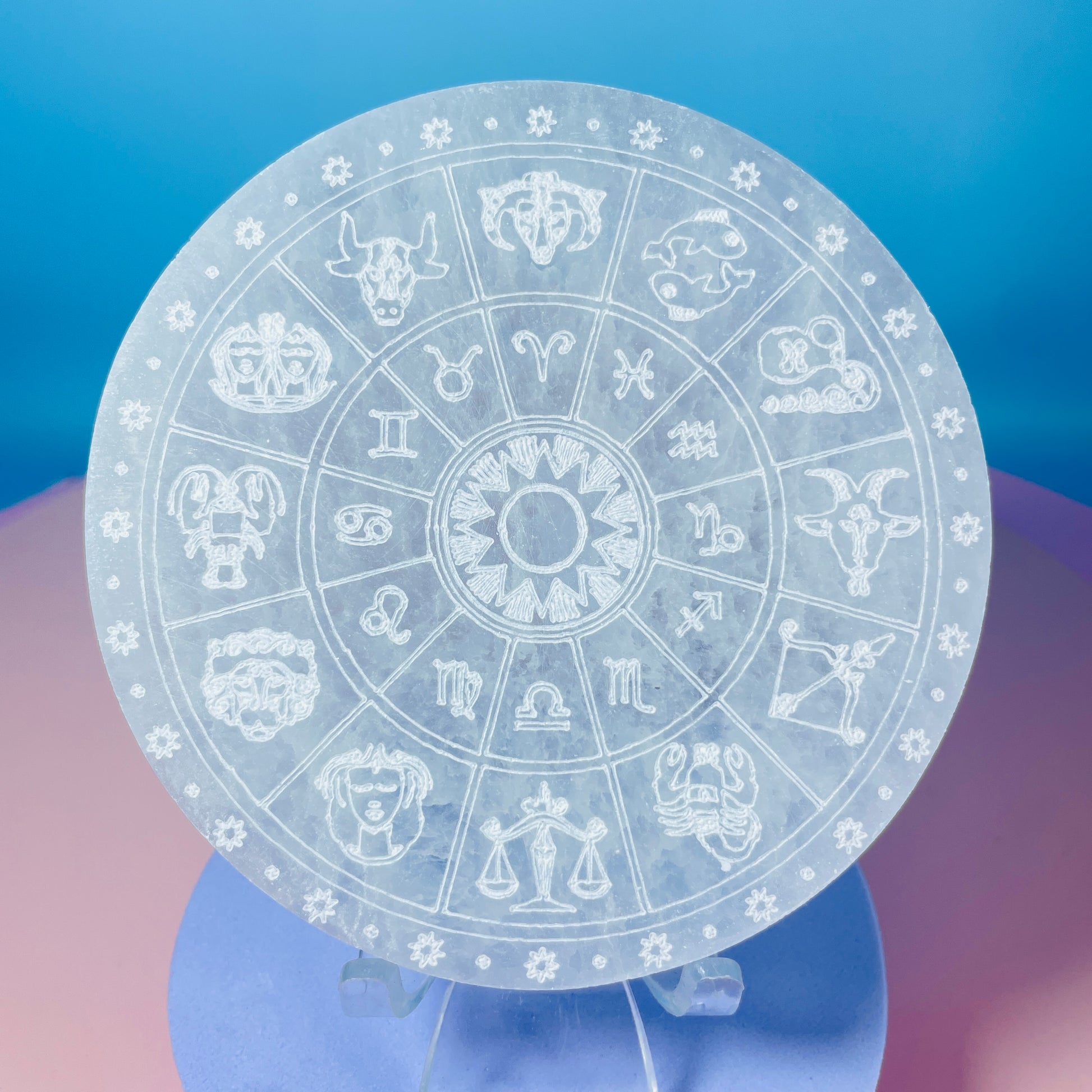 Selenite (Satin Spar) Etched 12 Zodiac Round Cleansing Plate 10cm