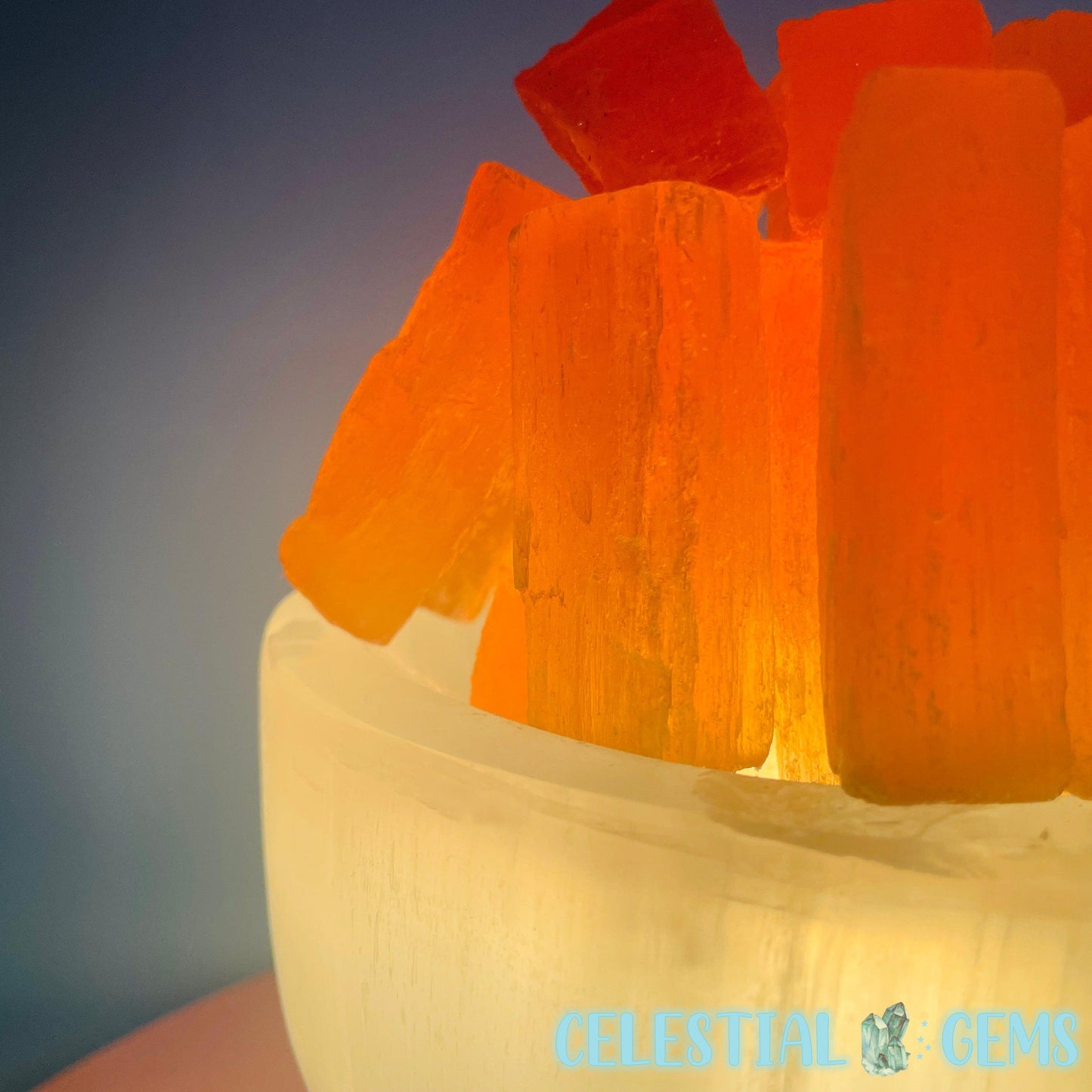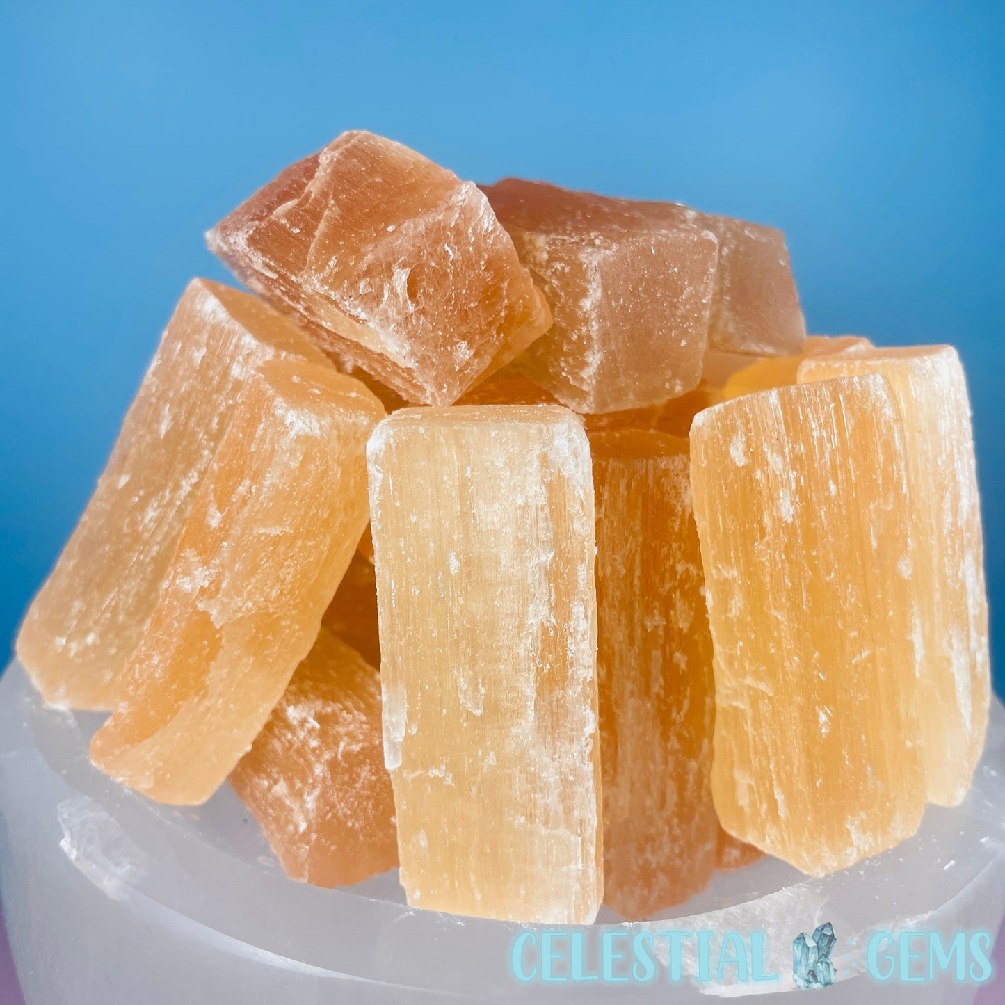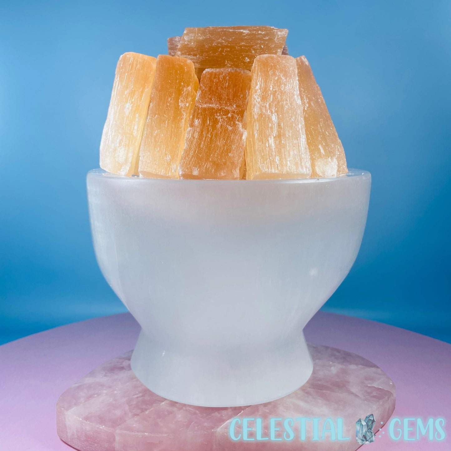A polished bowl of white Selenite (AKA Satin Spar) with orange Selenite 'Fire' raw sticks sitting on top. These Selenite items are ideal for cleansing crystals in your home. Place your crystals near to your Selenite to cleanse them.