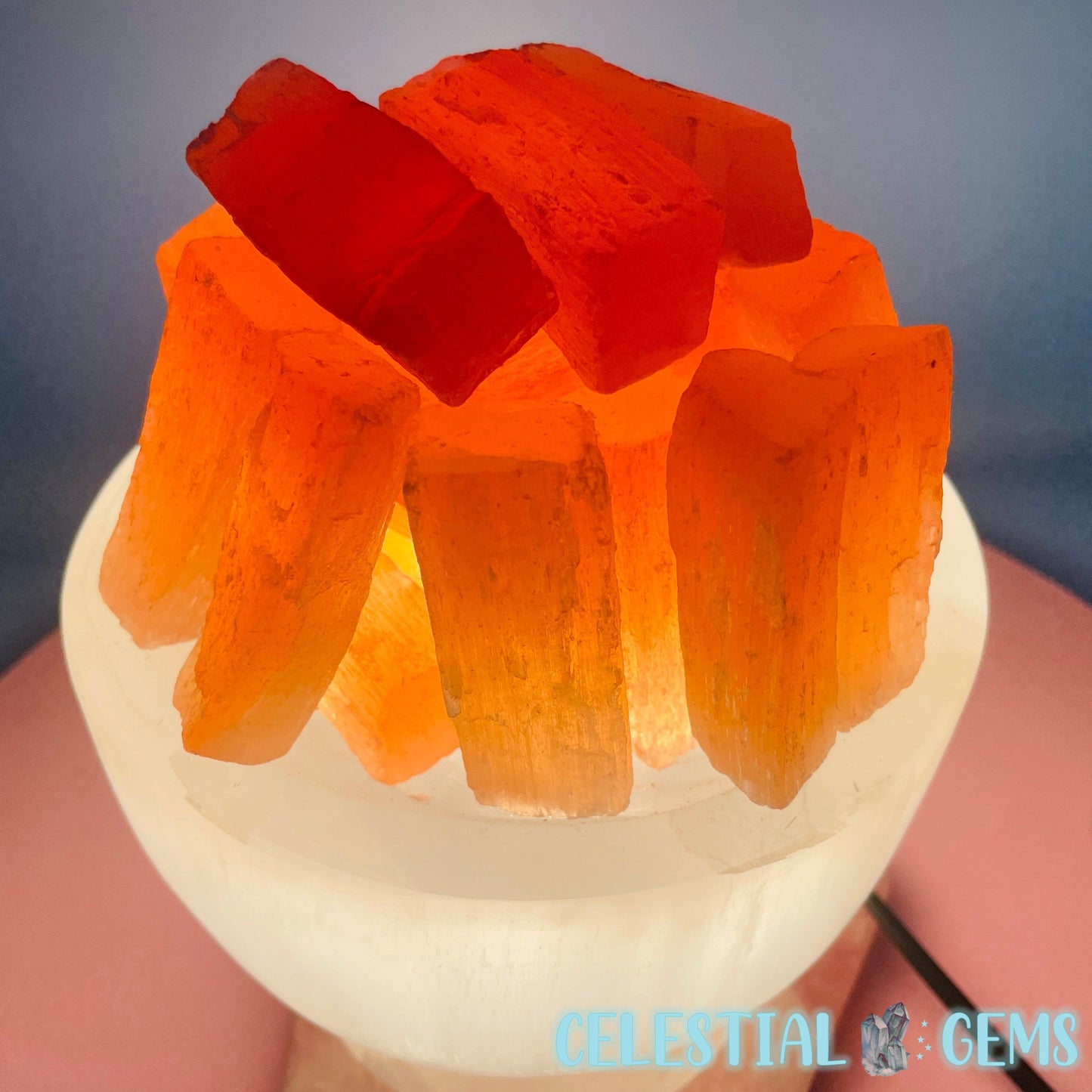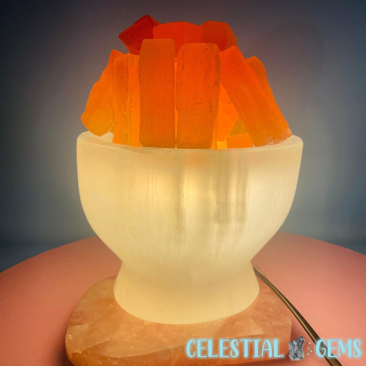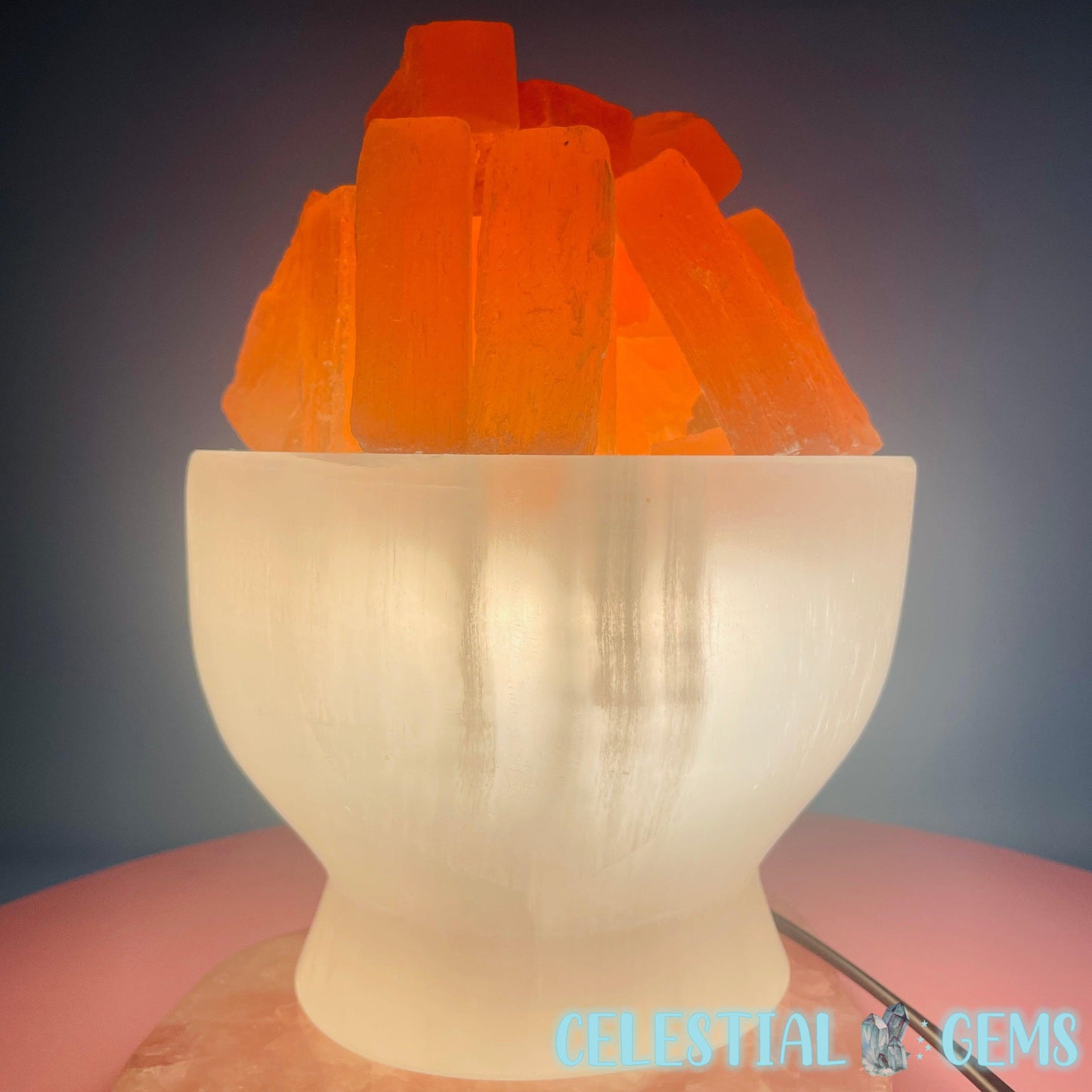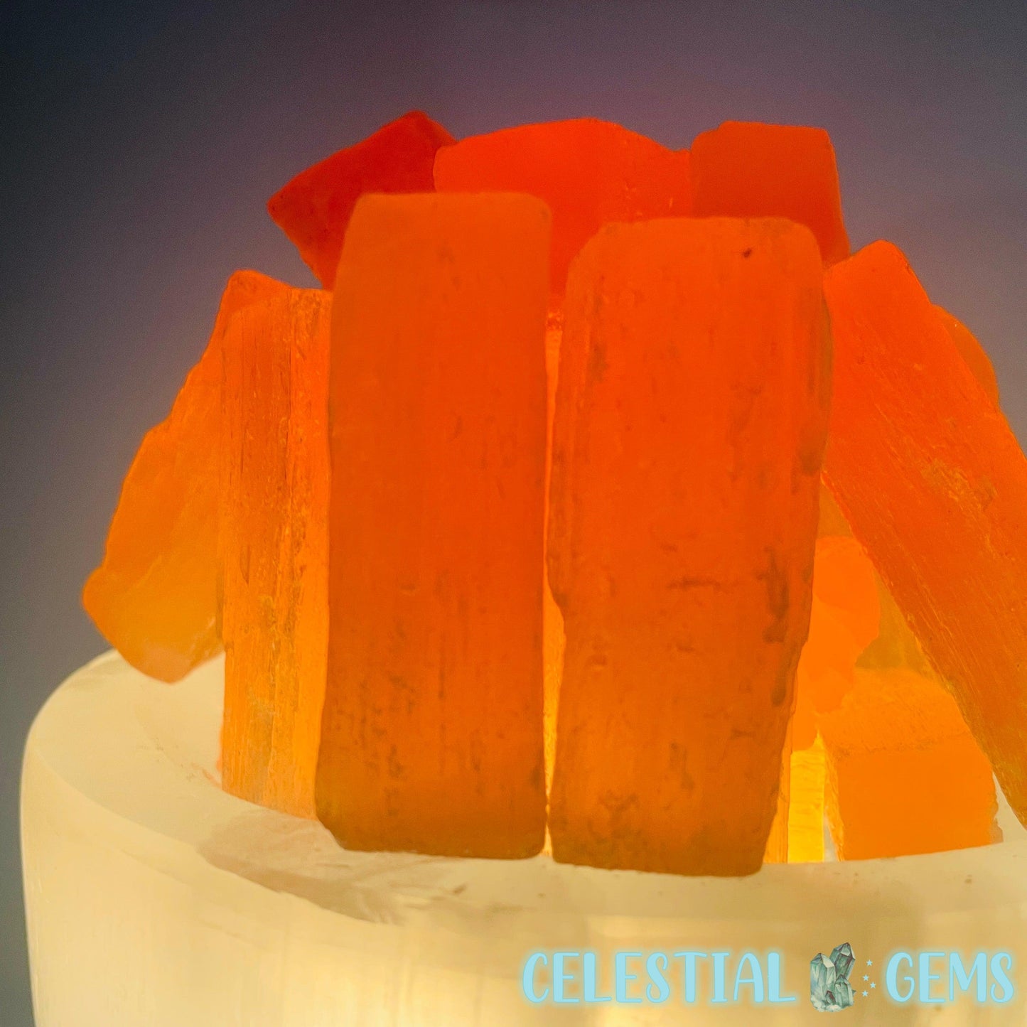 A polished bowl of white Selenite (AKA Satin Spar) with orange Selenite 'Fire' raw sticks sitting on top. These Selenite items are ideal for cleansing crystals in your home. Place your crystals near to your Selenite to cleanse them.