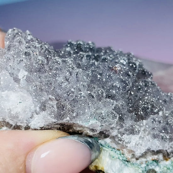 A small cluster of Chalcedony-Coated Amethyst with incredible 'sugar' sparkle! Swipe to see a video of the sparkly crystals.
