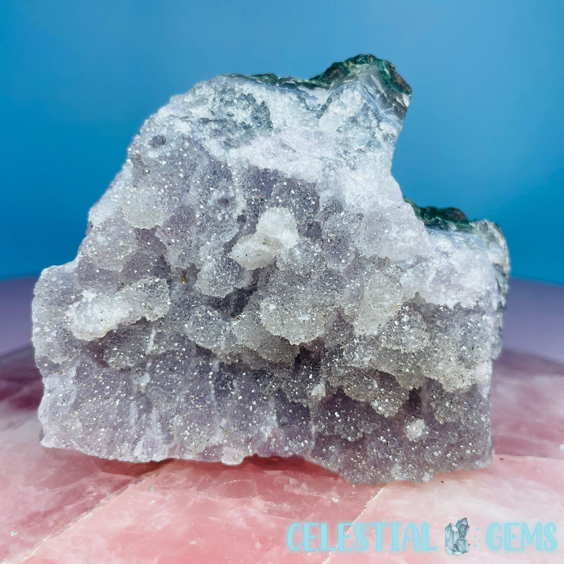 A small cluster of Chalcedony-Coated Amethyst with incredible 'sugar' sparkle! Swipe to see a video of the sparkly crystals.