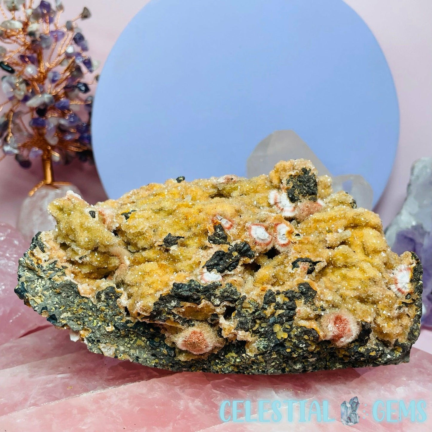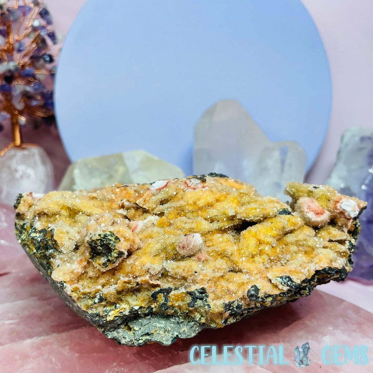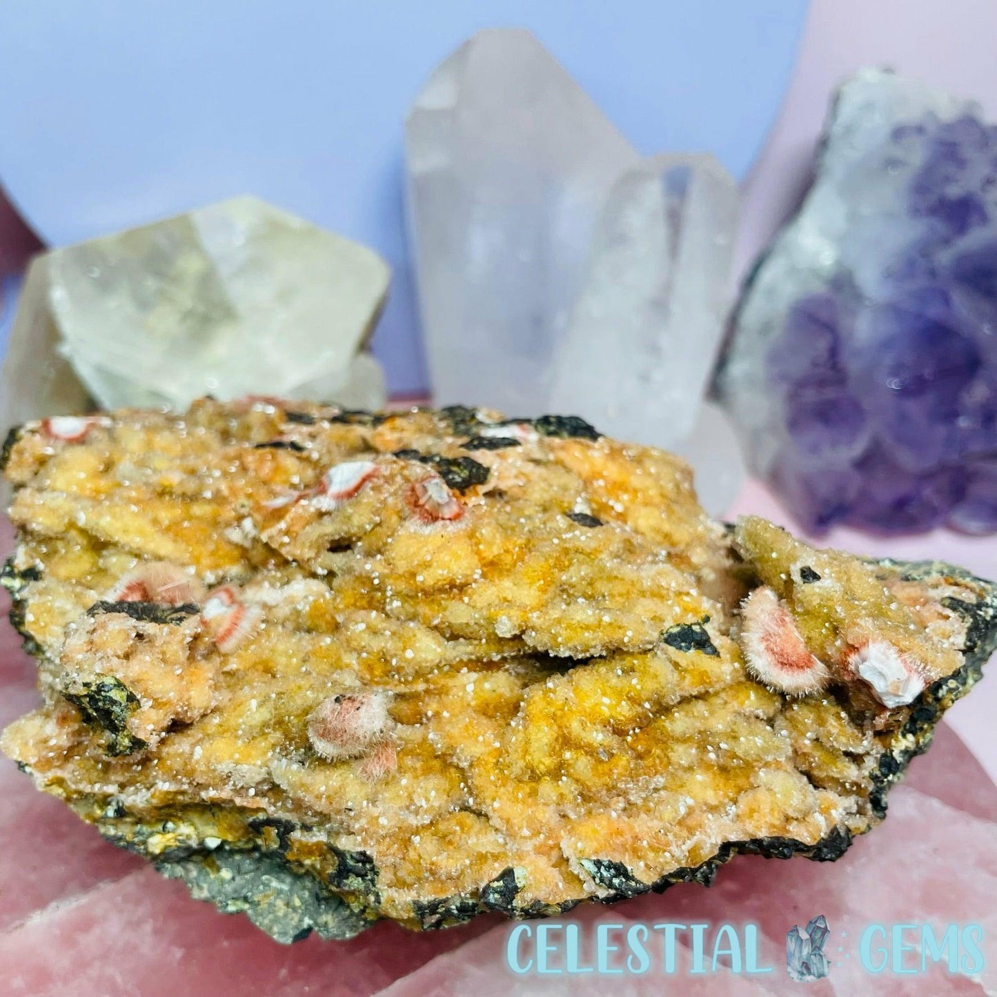 A beautiful specimen of very rare Thomsonite and Mesolite on Apophyllite cluster matrix, from a recent find in Burhanpur District, Madhya Pradesh, India. It was found during a highway construction. Not many pieces were collected and most of them were damaged. It displays vivid orange Thomsonite hemispheres densely covered with Mesolite needles. Mesolite forms radial sprays of delicate, spiky crystals. The orange Thomsonite forms gorgeous phantoms like spheres which contrast under the Mesolite. They have grown on a sparkly cluster formation of Apophyllite and matrix stone. Weight 530g. Approx. 13.3cm x 7.5cm x 5cm.